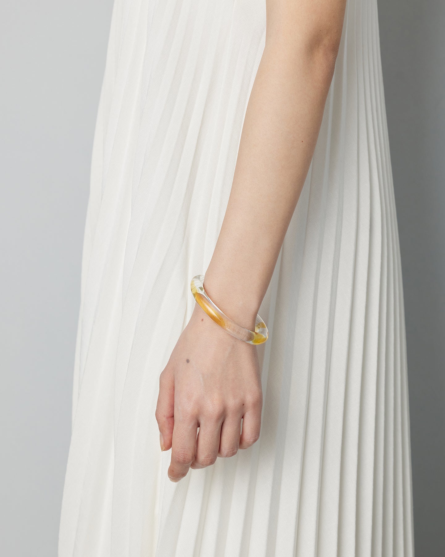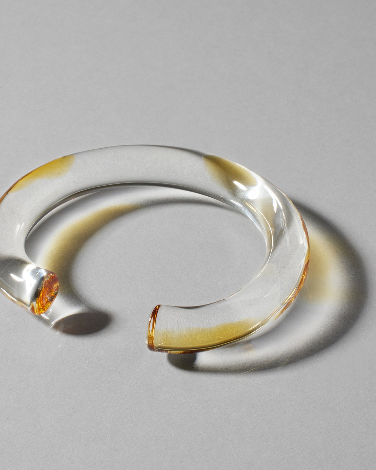透明なガラスに手作業で施されたアンバー色が、まるで光の輪を纏っているかのような印象を与えるバングル。ボリューム感のあるガラスが繊細さと重厚感を調和させ、さりげなくコーディネートのポイントを演出します。