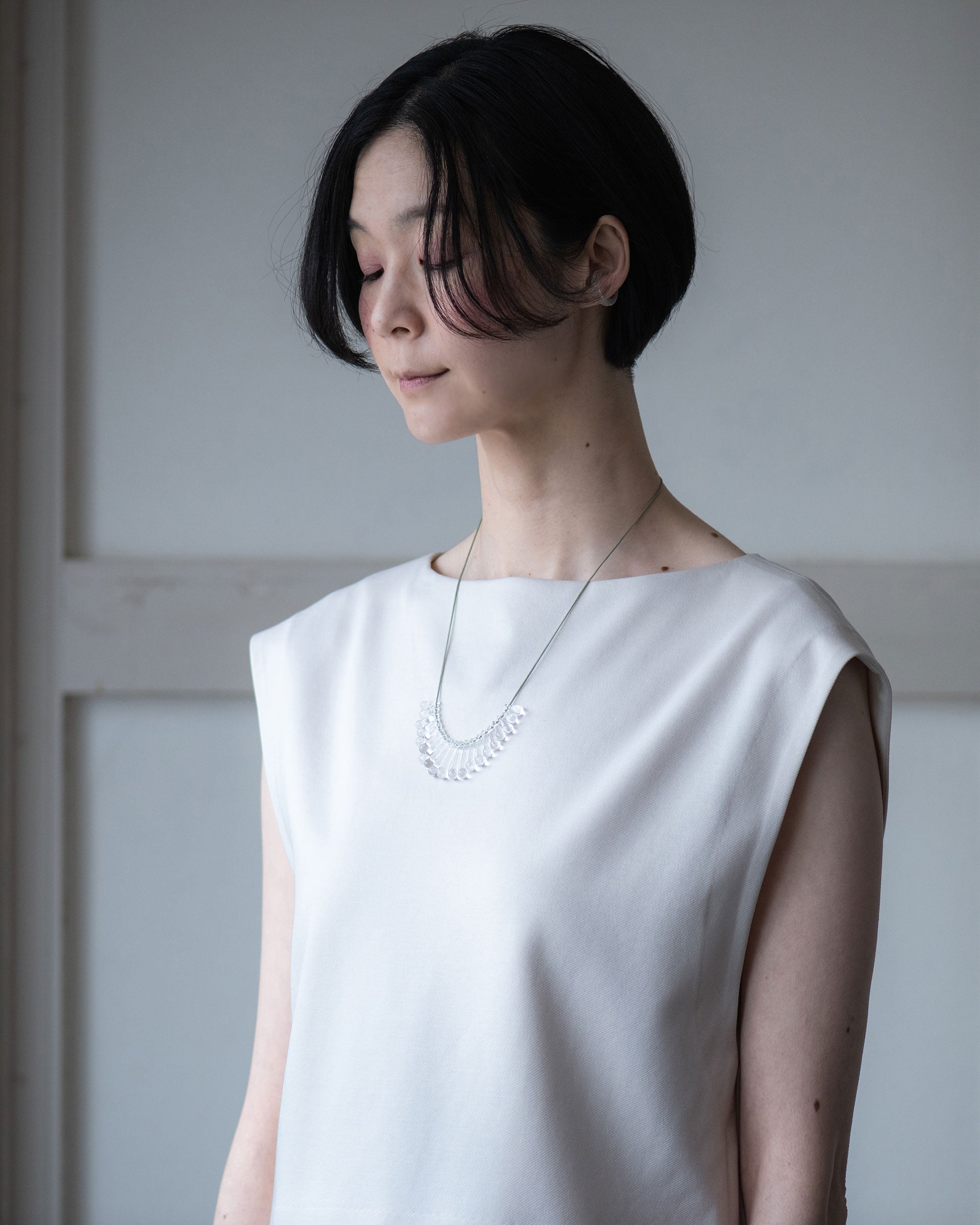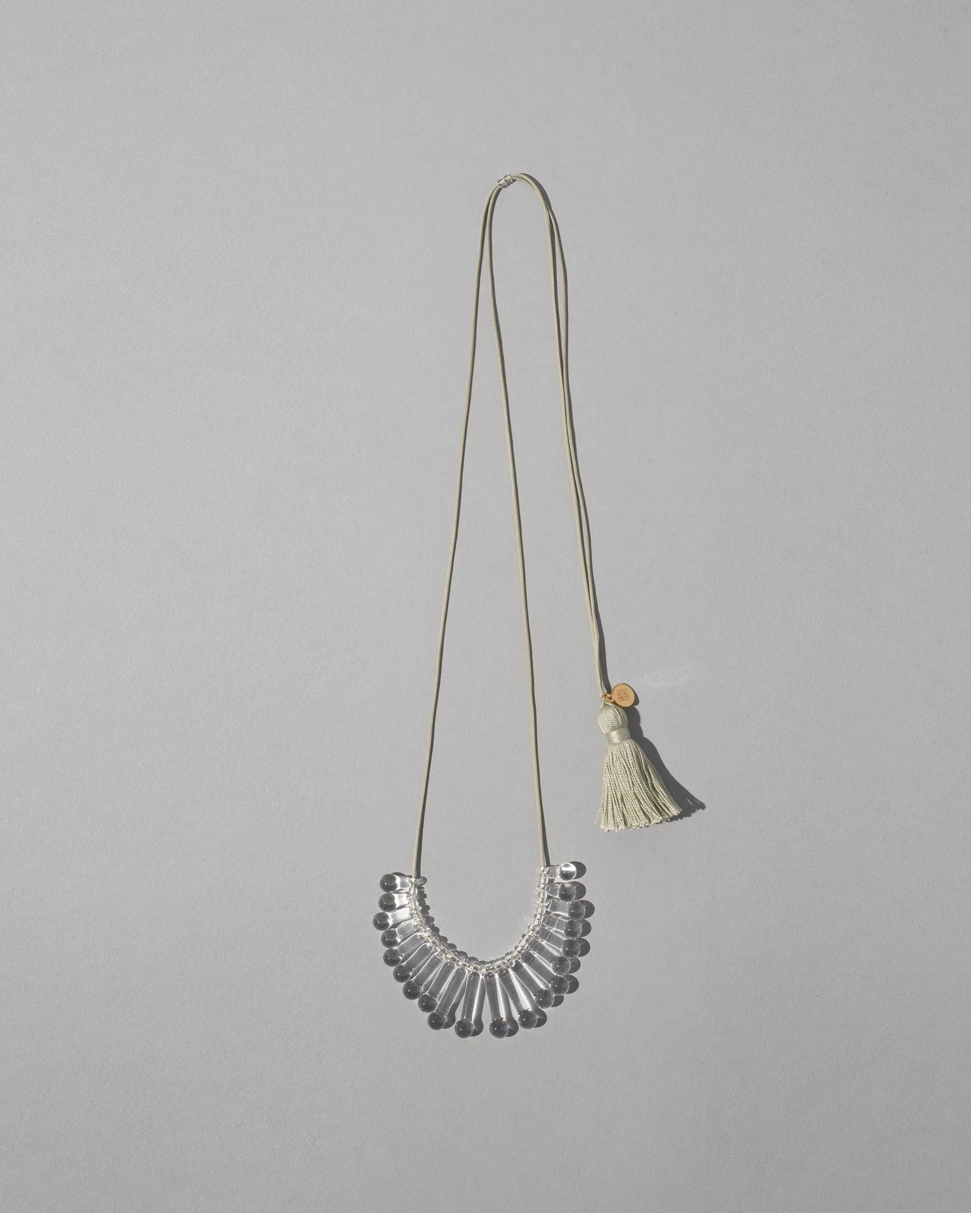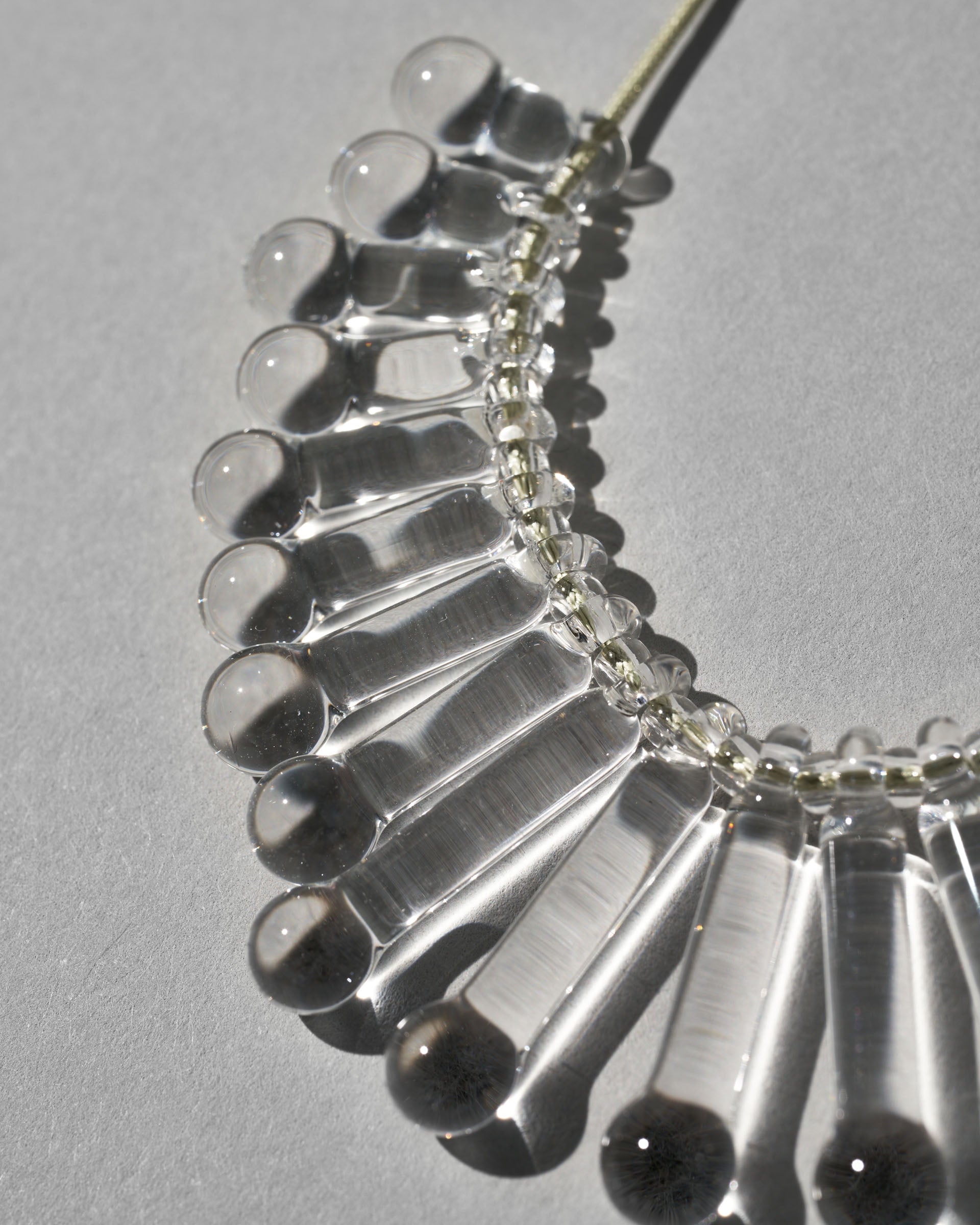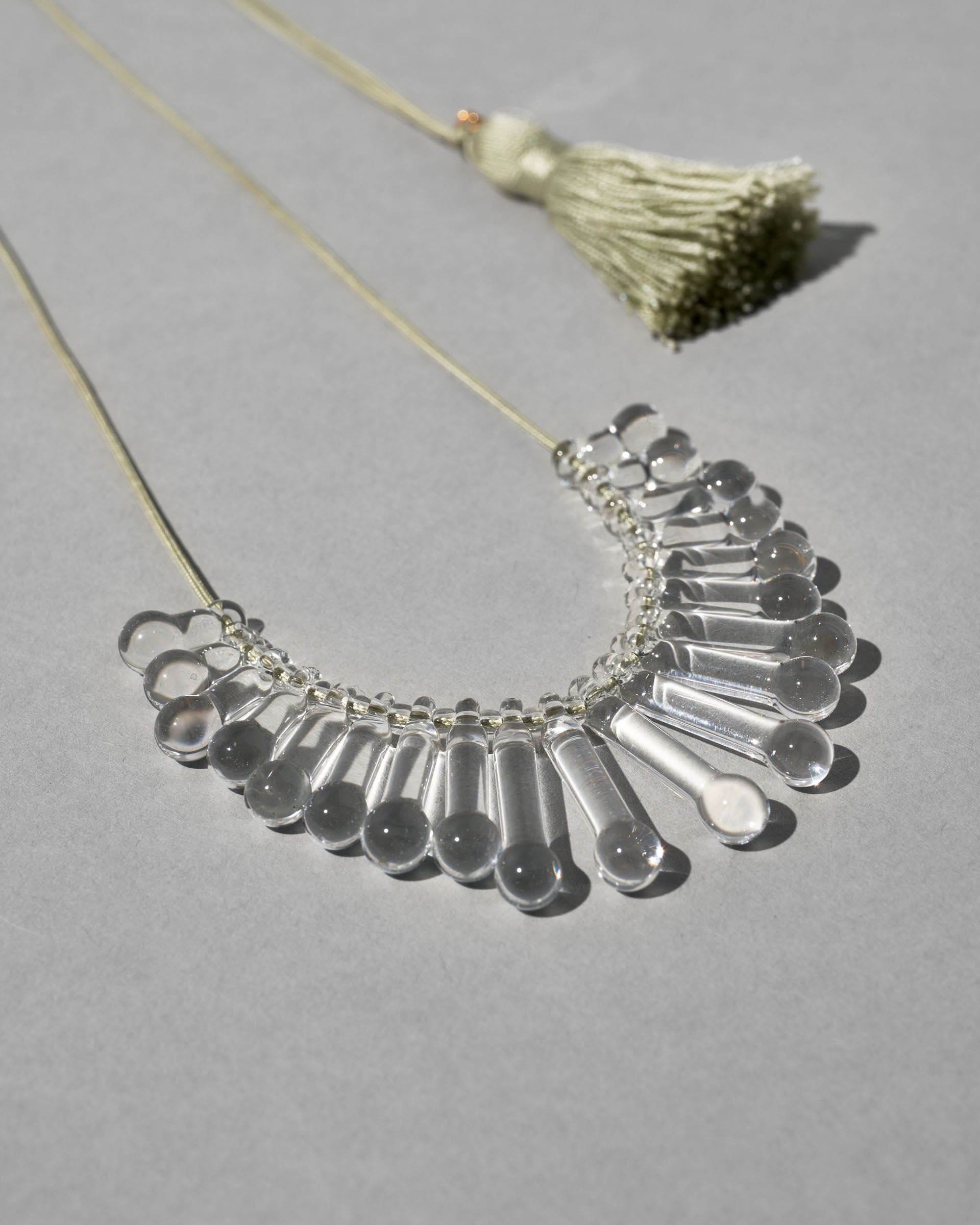 A necklace with a primitive impression, not only the shine of the glass, but also the beautiful shadows created, inspired by the accessories worn in ancient festivals.
