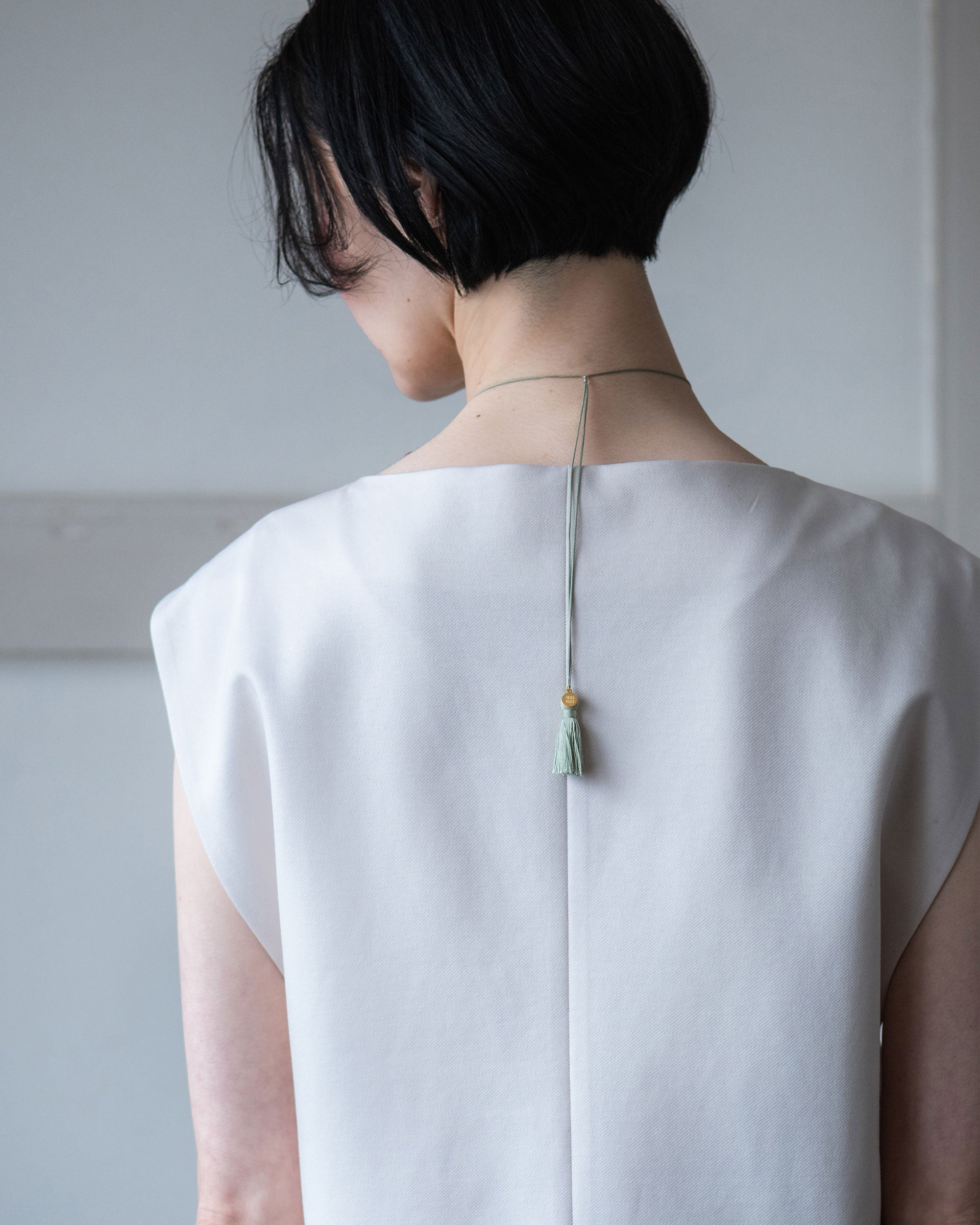 The silk cord that connects the jade-dyed glass at a dyeing workshop in Kyoto has a clasp that can be adjusted in length.