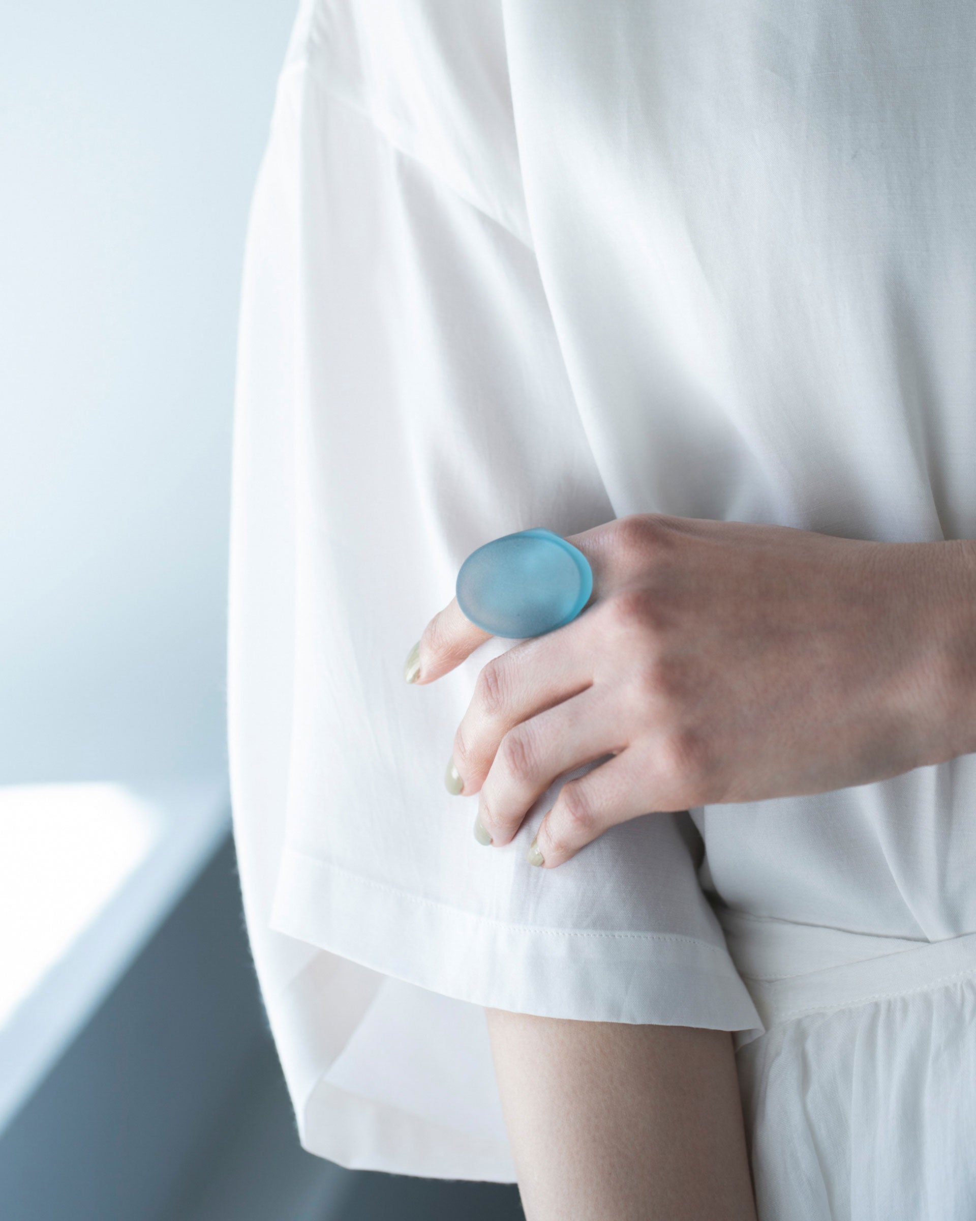 The “HOTOLI” collection draws inspiration from the image of The Aare River in Swizerland trapped in glass. The “Ring Oval Bubble” features a flowing curve that envelops the finger. Nestled around the finger, its bold, large oval face creates a smart impression SIRI SIRI uses blue glass for the first time in this collection. Reminiscent of the abundantly flowing water of Switzerland, the ring's eye-catching deep blue hue makes for a great addition to an elegant look when worn with monotone colors or black.