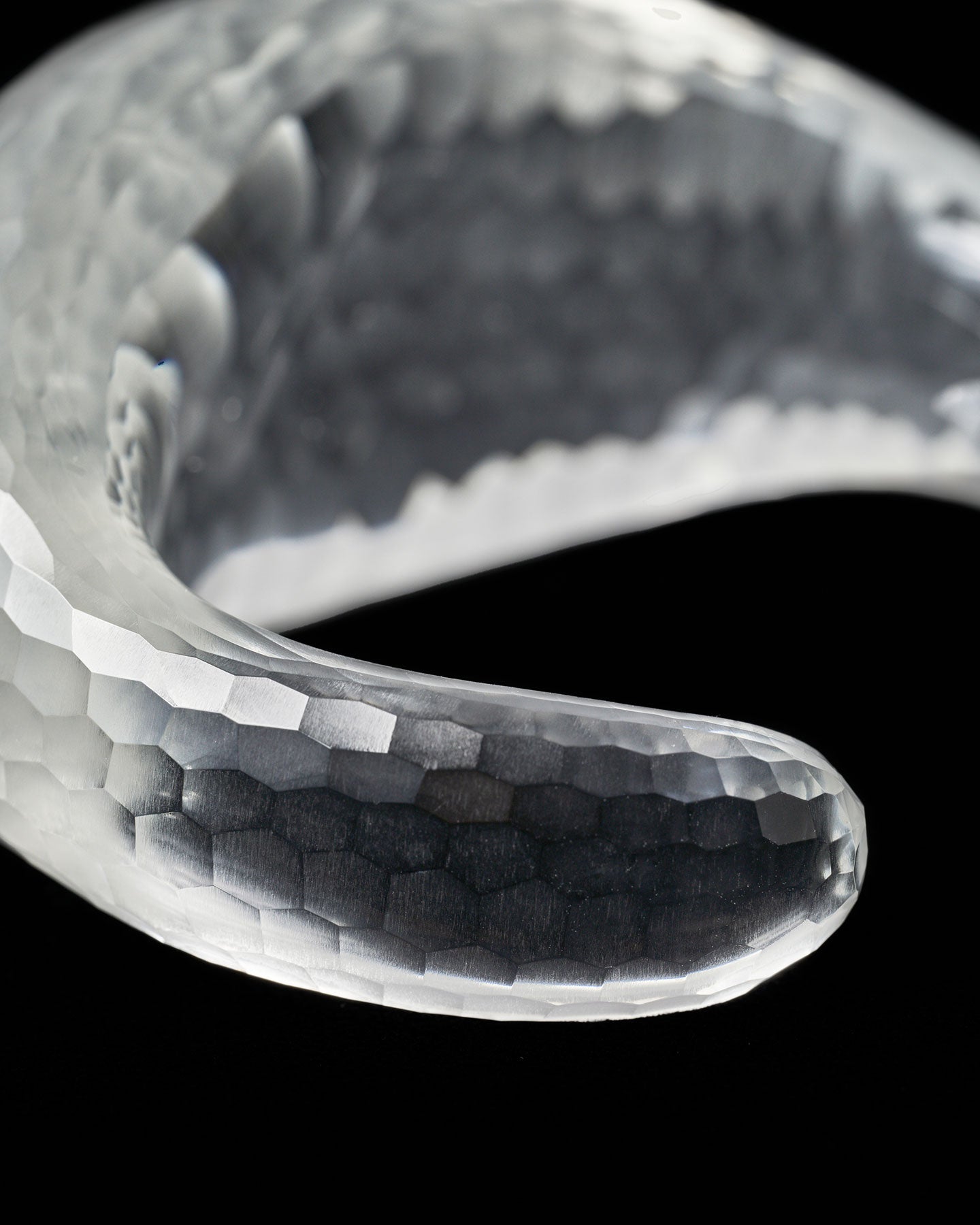 Originally, a designer who wanted to make a chunky and organic bangle like ARABESQUE bangle out of a material called glass met master craftsman Toshio Yagihara and consulted with him to see if he could make it a reality. It was the first jewelry for Yagihara, and it was a series of trial and error. The delicate image that the upper part swells and becomes thinner as it goes down can only be reproduced by hand. Universal design is made possible by excellent technology that perfectly reproduces graphical designs, perfectly controls the melting material of glass, and creates clear, distortion-free lines.