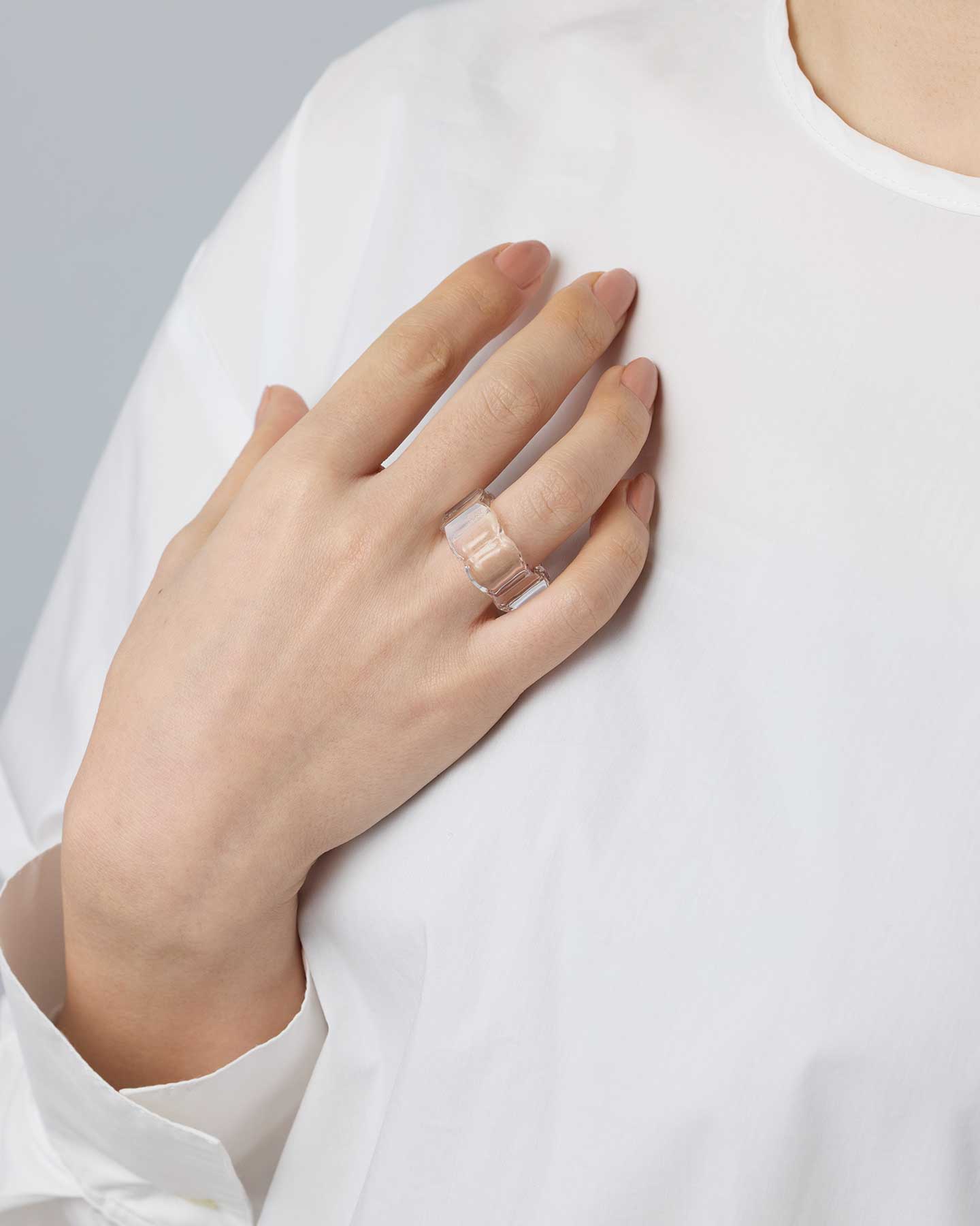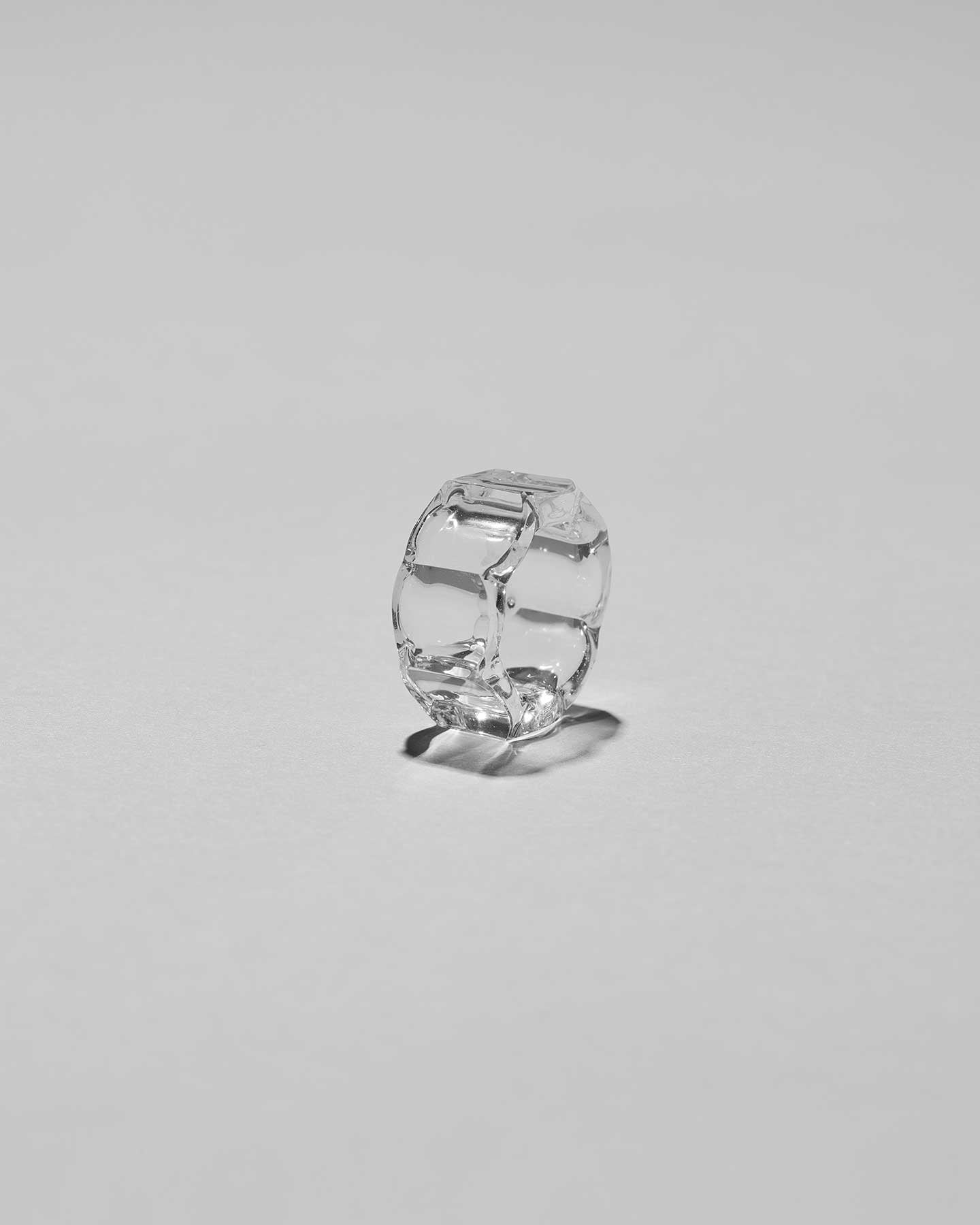 八角形のフォルムと、リズミカルに波打つ輪郭が重なるガラスのリング。角度によって印象が変化する、ユニークな造形のジュエリーです。透明なガラスの輝きが、シンプルな装いに美しいアクセントを添えます。