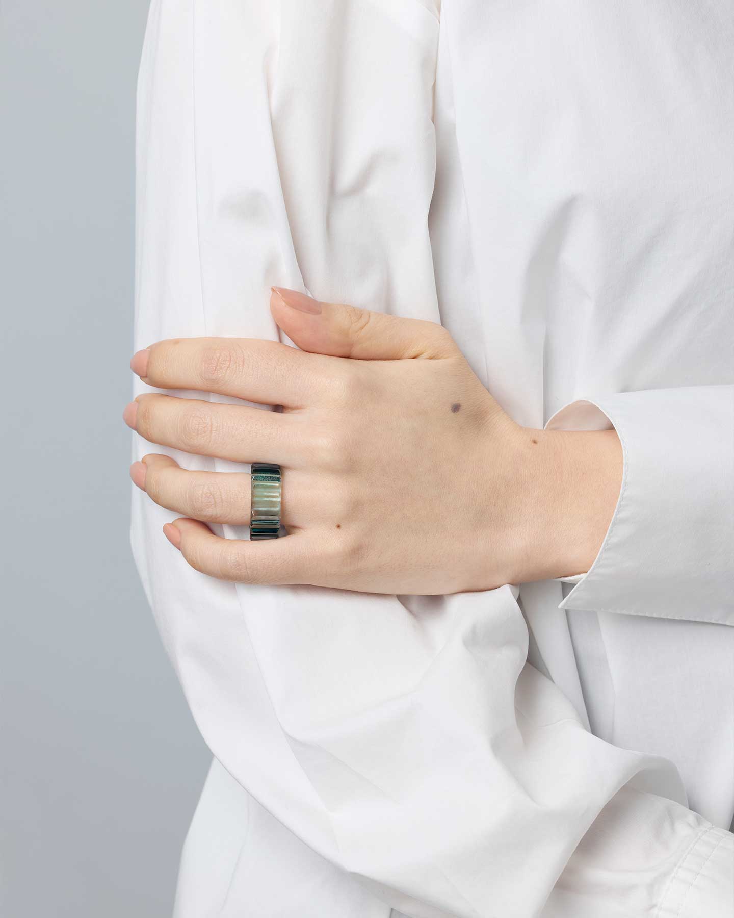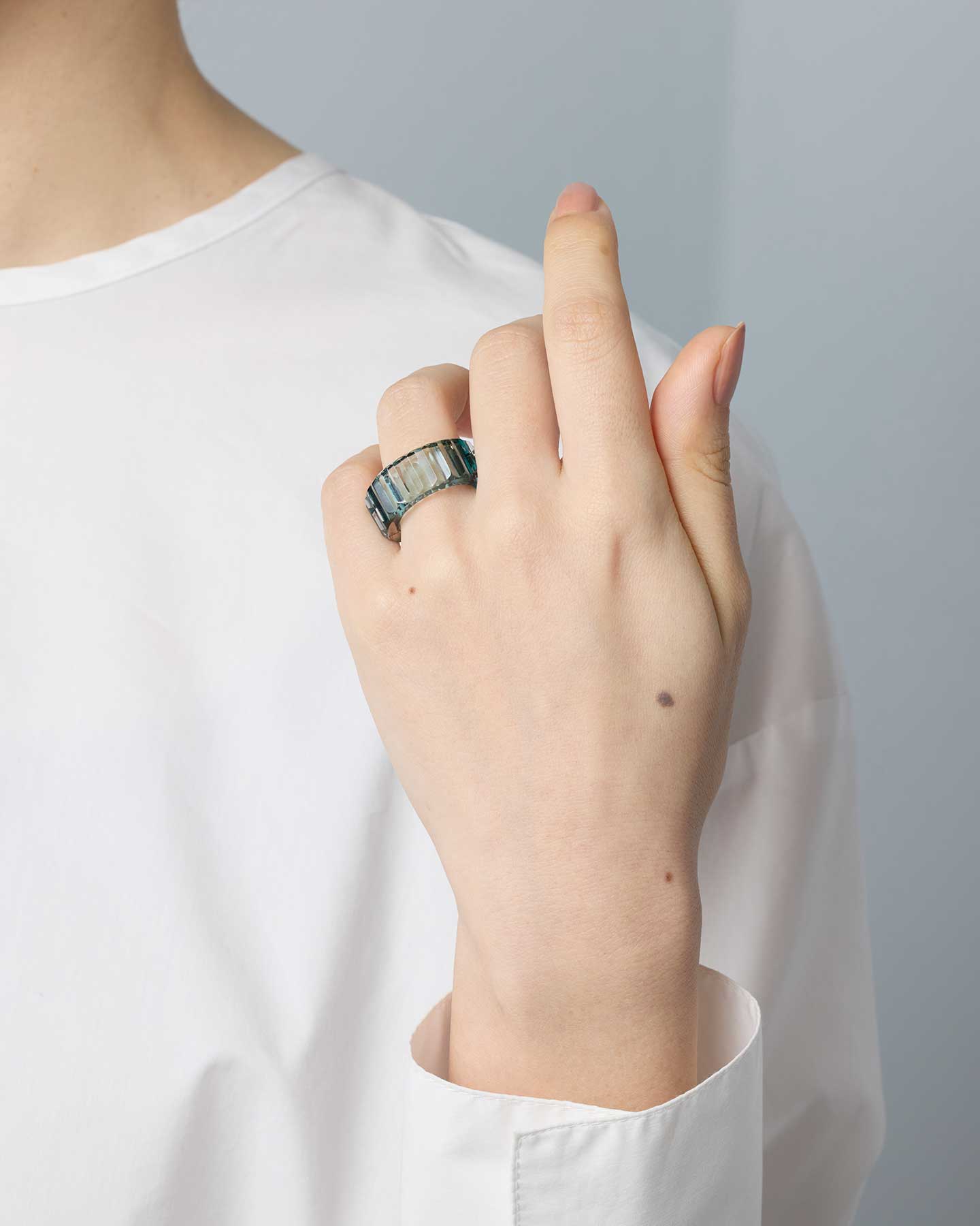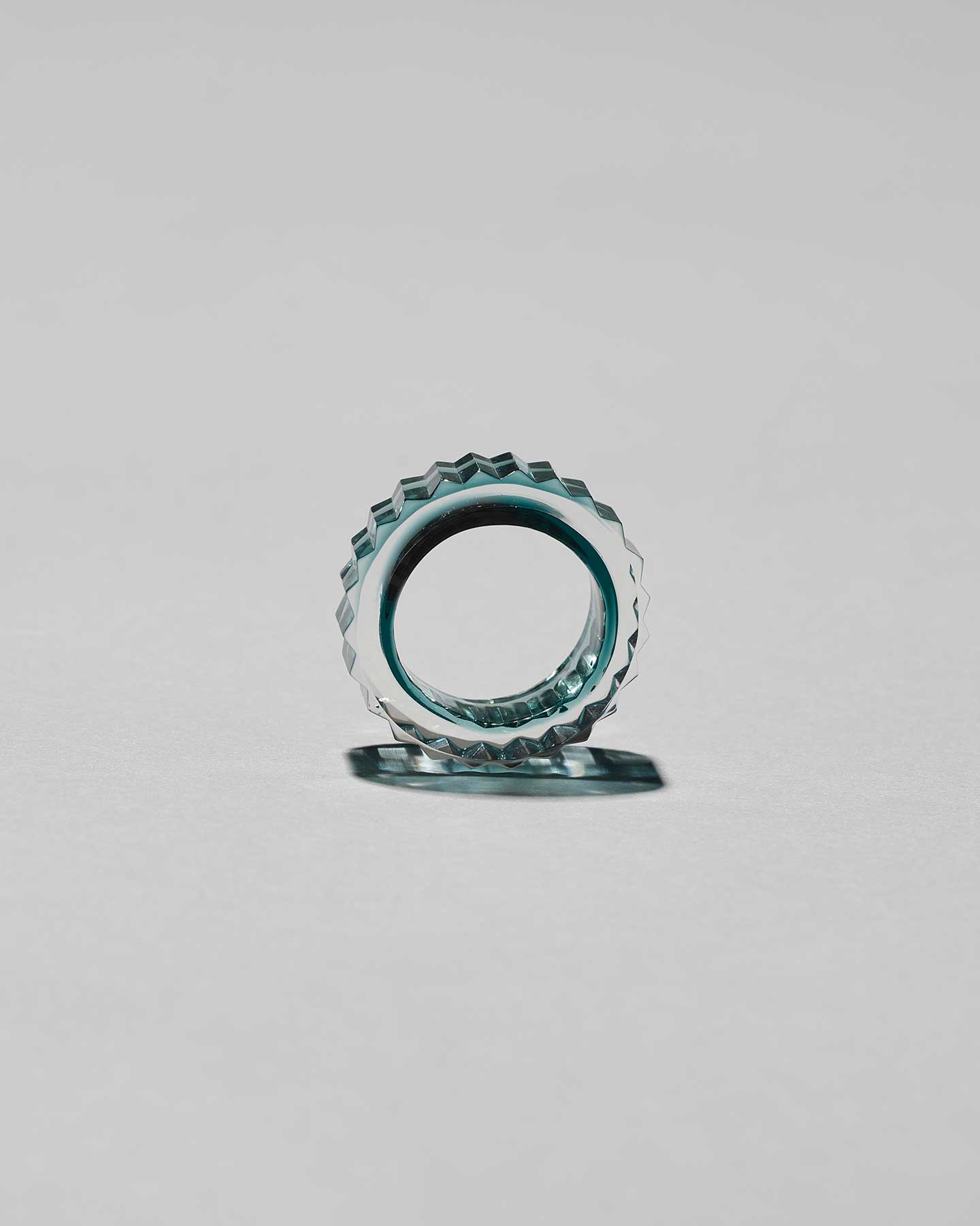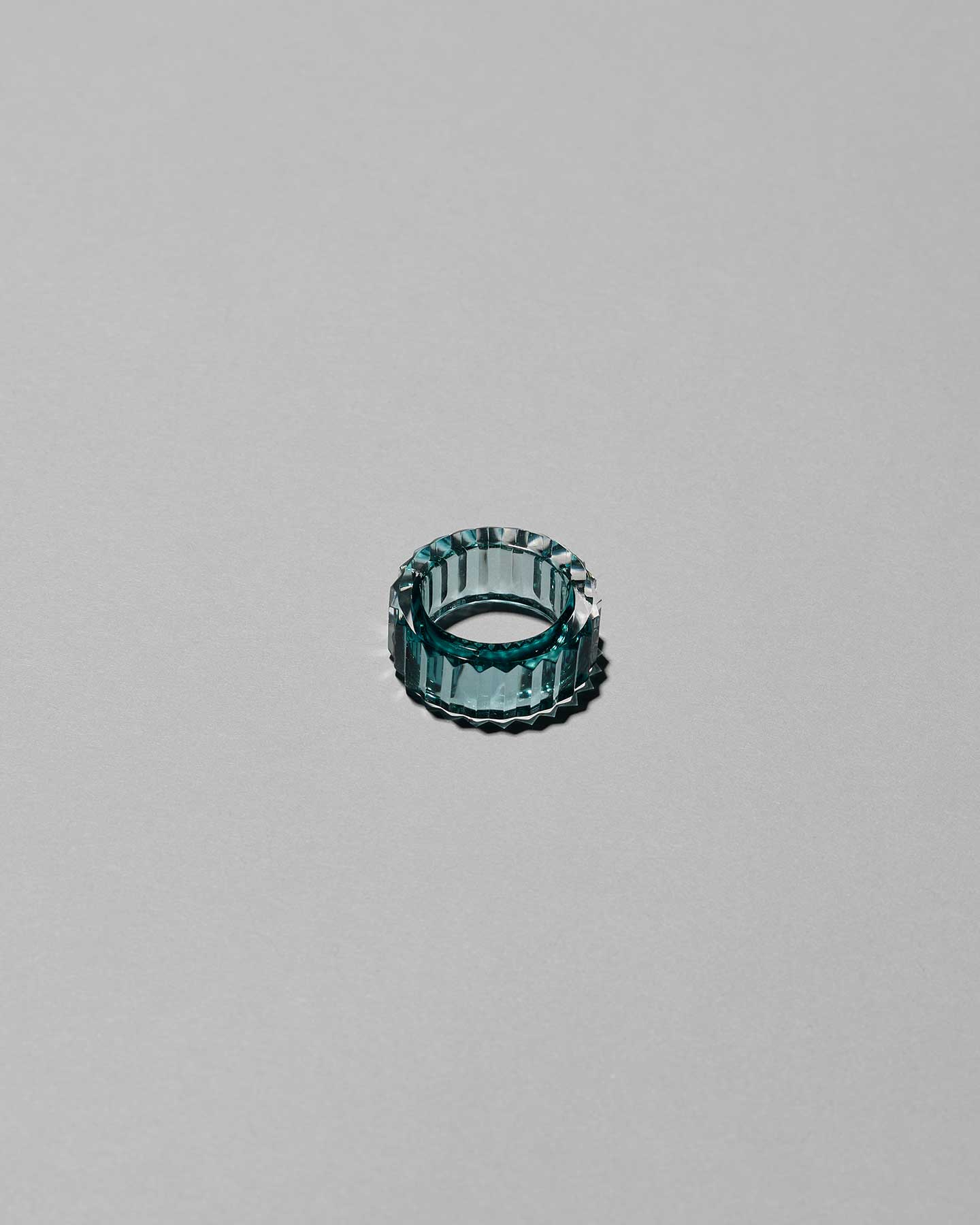 透明感あるティールグリーンが印象的な切子のリング。グリーンとクリアのガラスを重ねることで、角度によって色の表情が変化します。一つずつ丁寧に磨き上げられたカット面が光をとらえ、切子の輝きを存分に楽しめる華やかなデザインです。