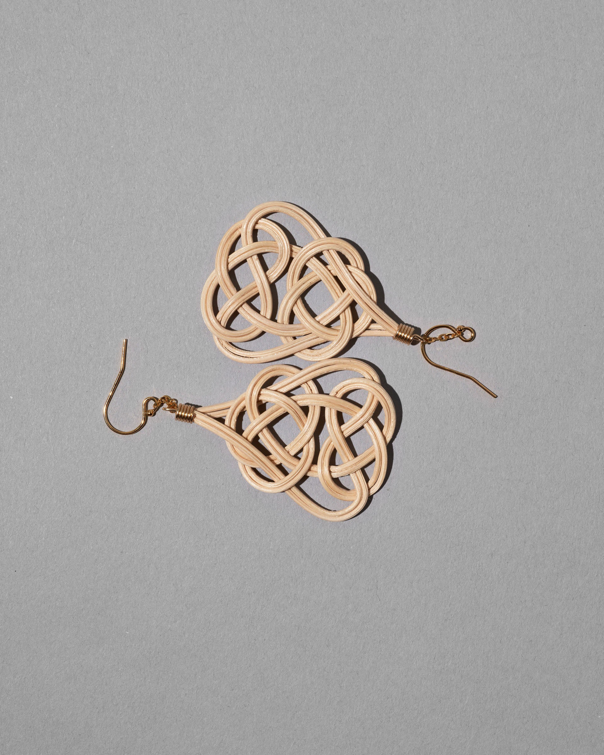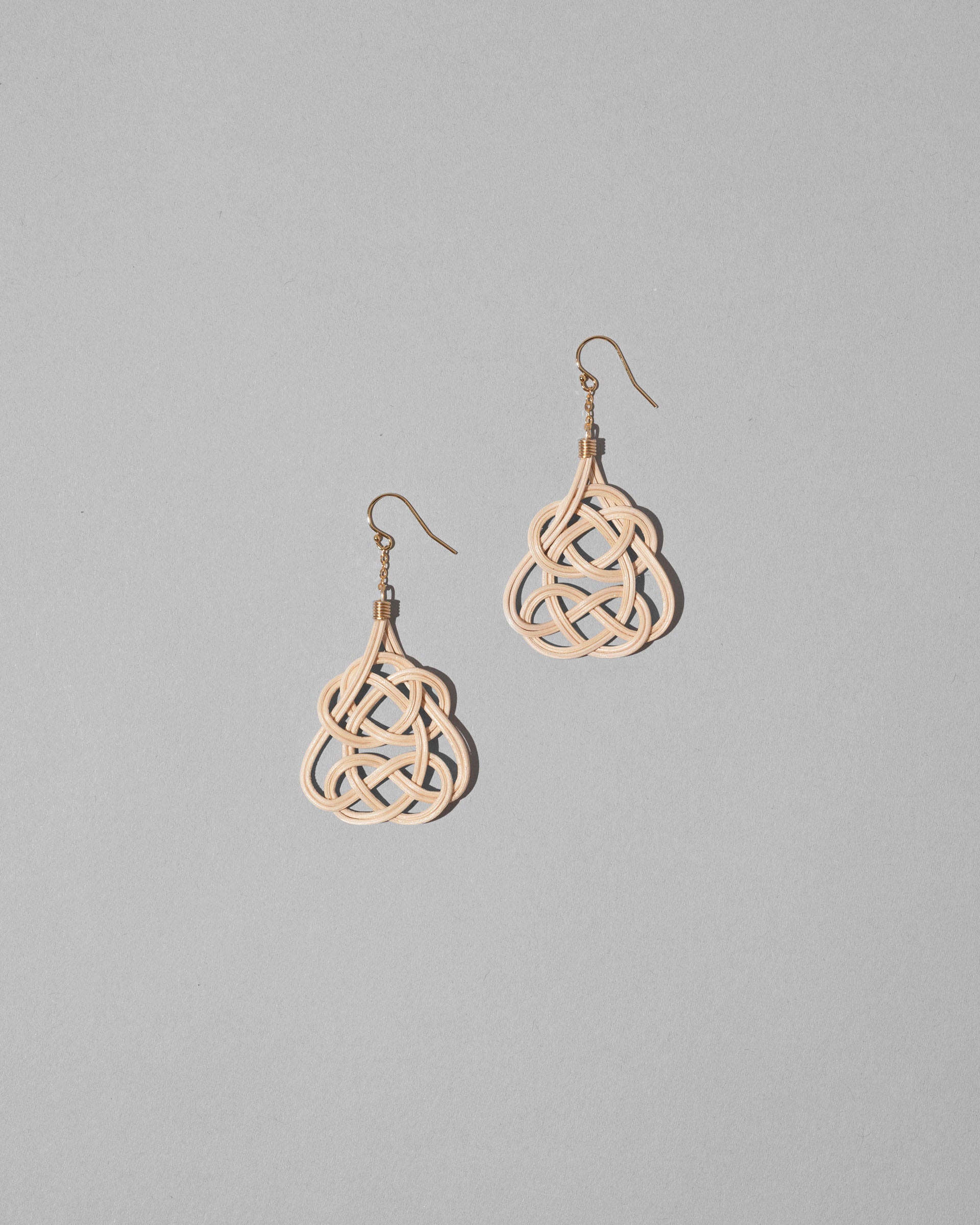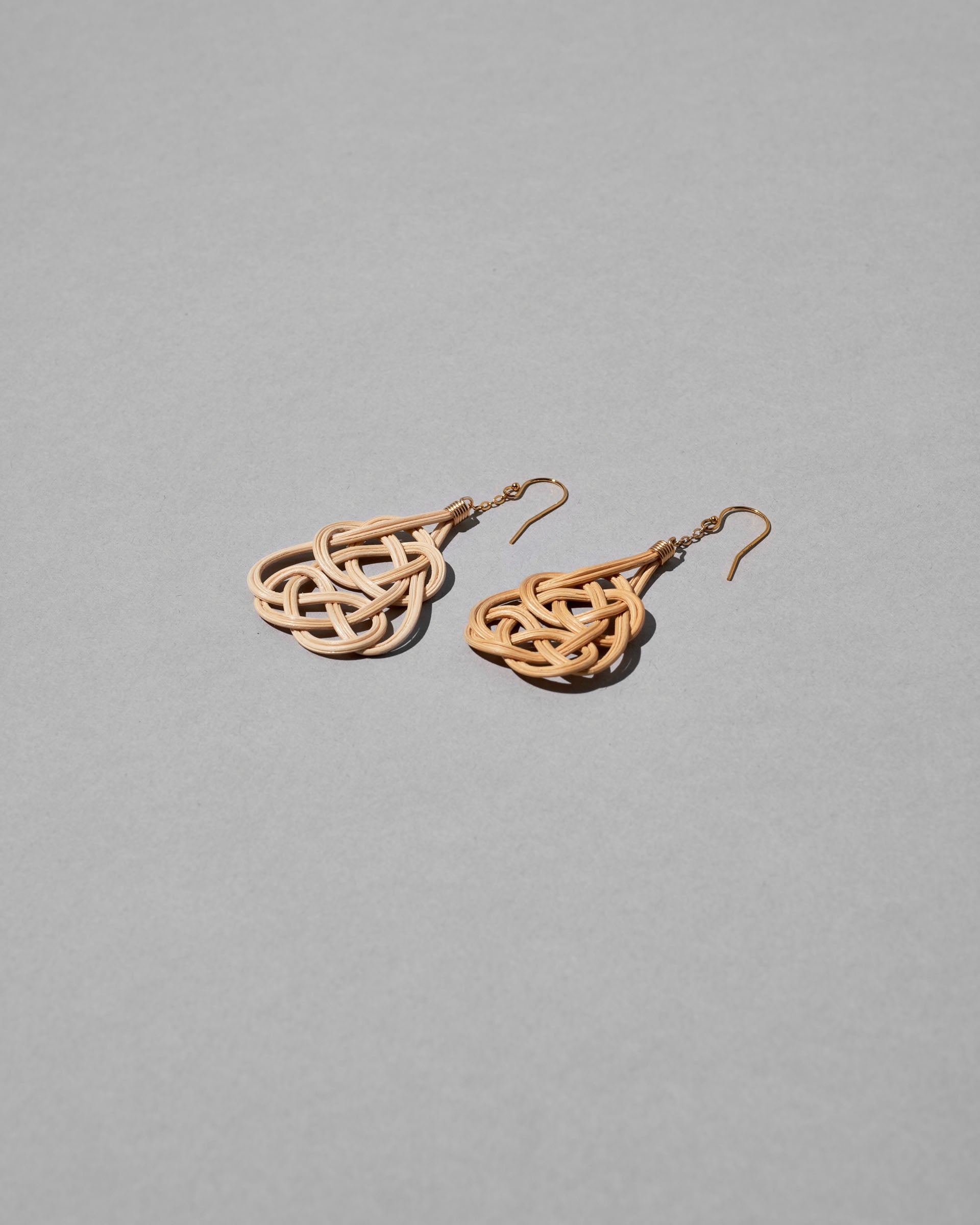 左右の輪が互いに結び合い、両端を引っ張るとさらに強く結ばれることから末永い付き合いという意味を持ち、慶事で用いられる「あわじ結び」をモチーフにしたピアス。籐工芸職人が籐を1本1本磨き上げ、ジュエリーへと昇華しています。