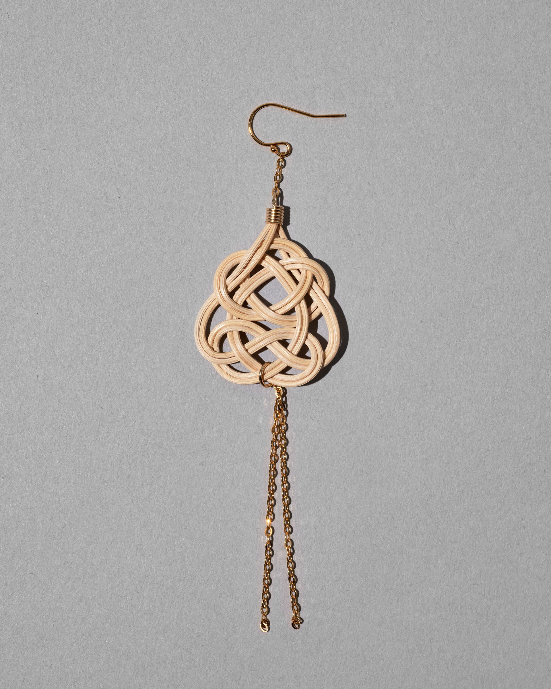 左右の輪が互いに結び合い、両端を引っ張るとさらに強く結ばれることから末永い付き合いという意味を持ち、慶事で用いられる「あわじ結び」をモチーフにしたピアス。籐工芸職人が籐を1本1本磨き上げ、ジュエリーへと昇華しています。