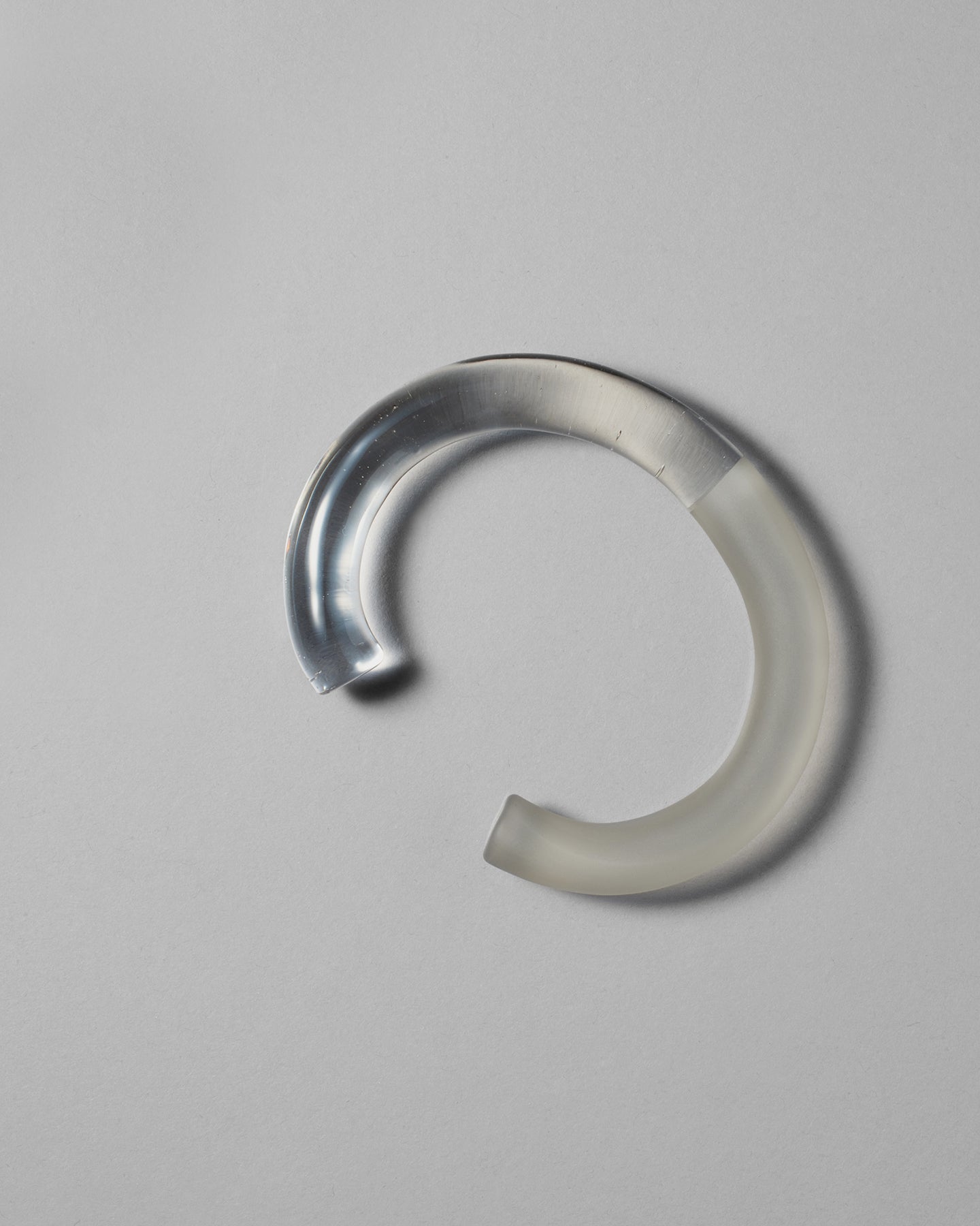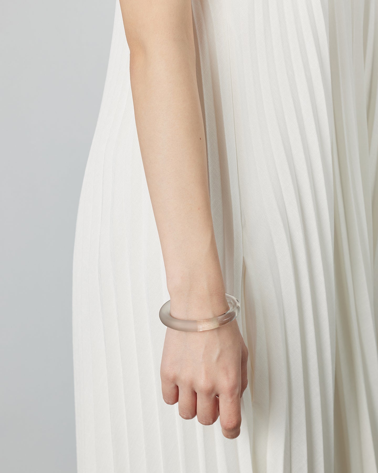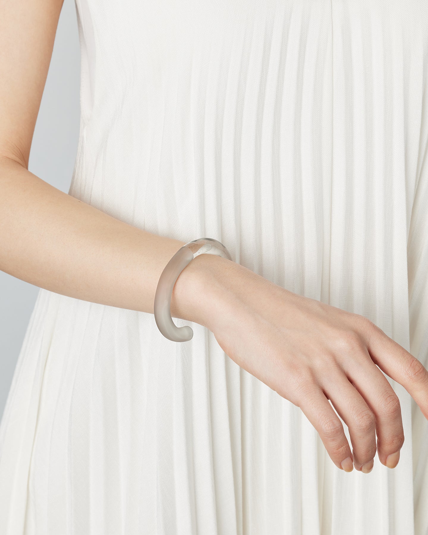 手首の形に沿うような楕円型のバングルは、スモーキーグレーの色味がクールでスタイリッシュな印象。マットな質感が柔らかさを引き立て、艶やかなガラスの輝きが手元のアクセントに。
