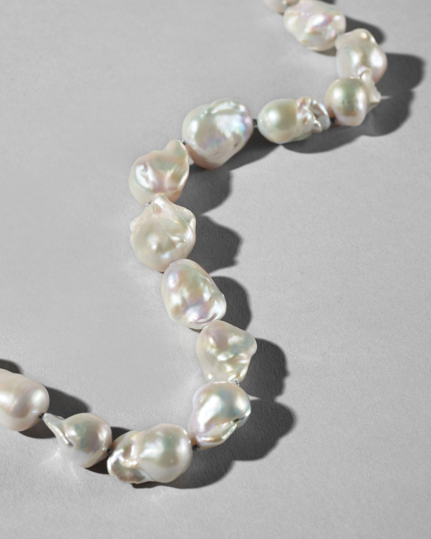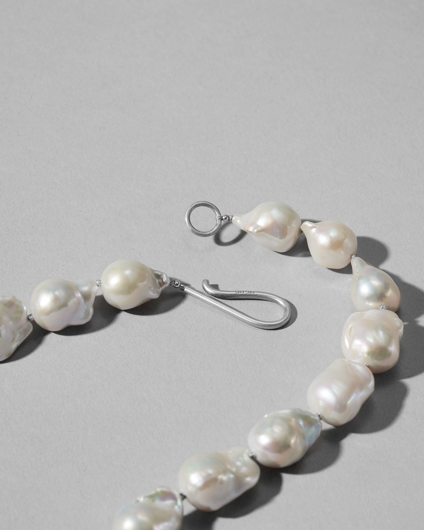 大胆なバロックパールのフォルムが風に靡いている姿を想起させる、「ネックレス ムーア グランデ」。優しく温かみのあるピンクみがかったパールが肌に優雅な輝きをもたらします。一粒ずつ異なる形状と優美な艶が、華やかさを一層引き立てます。