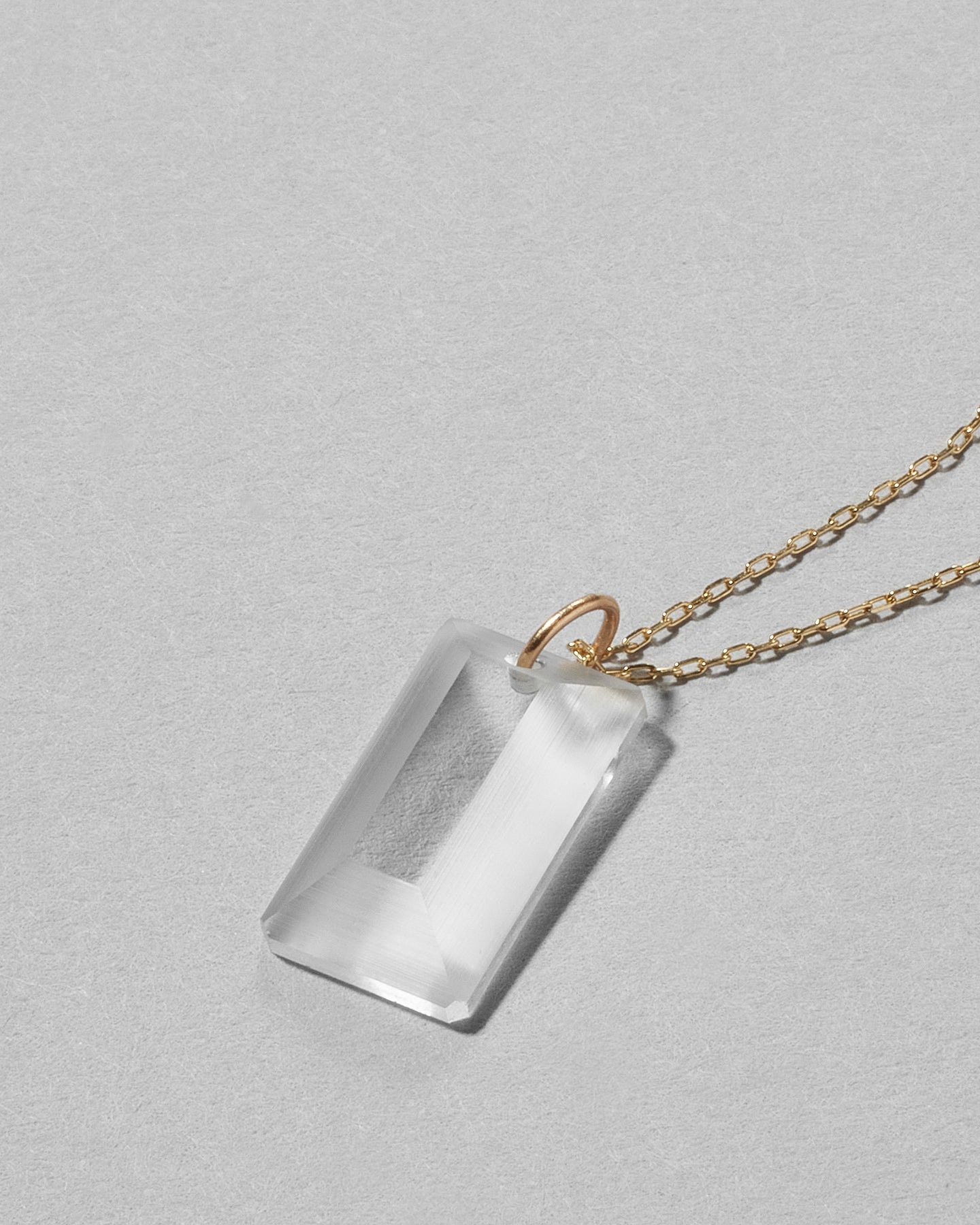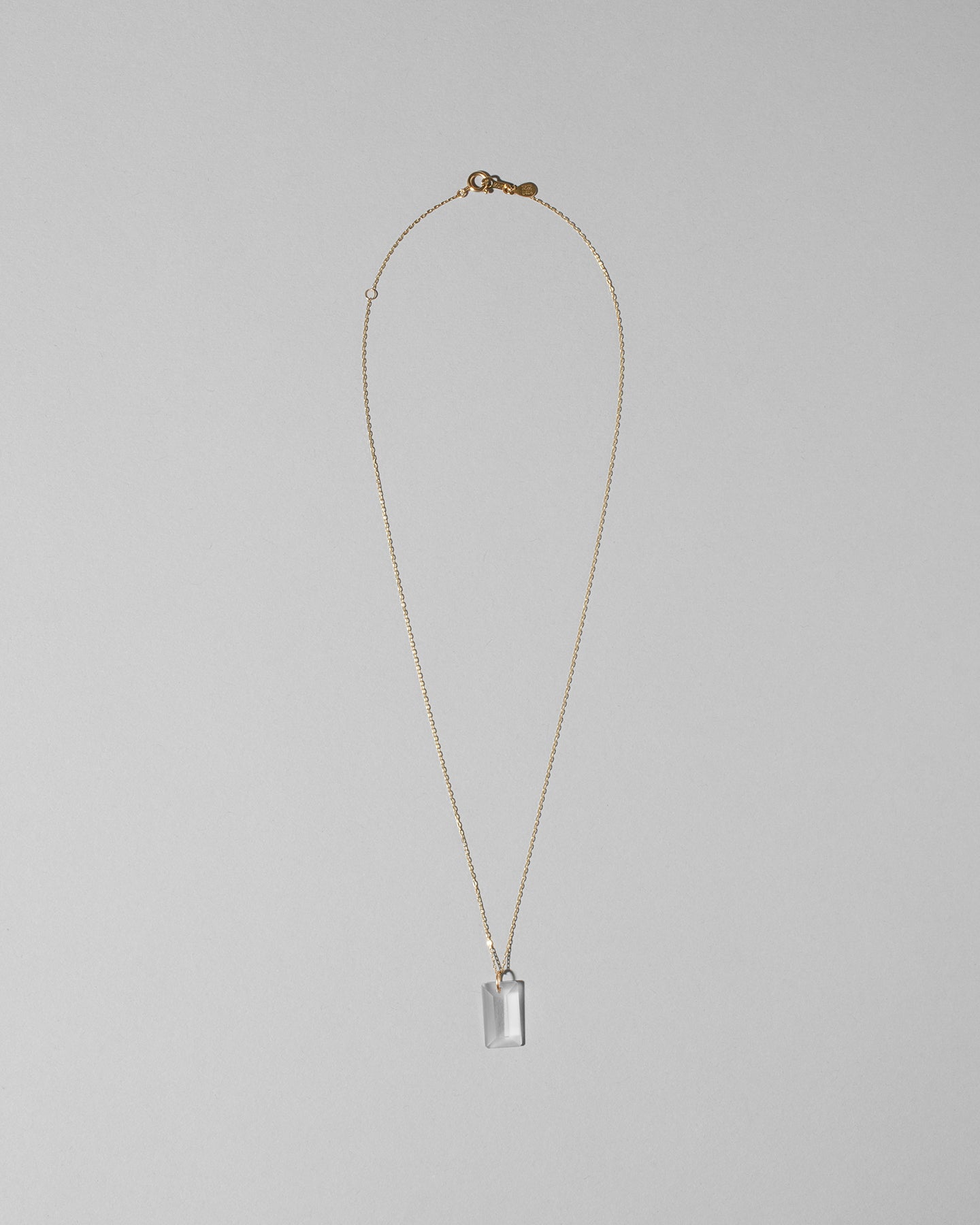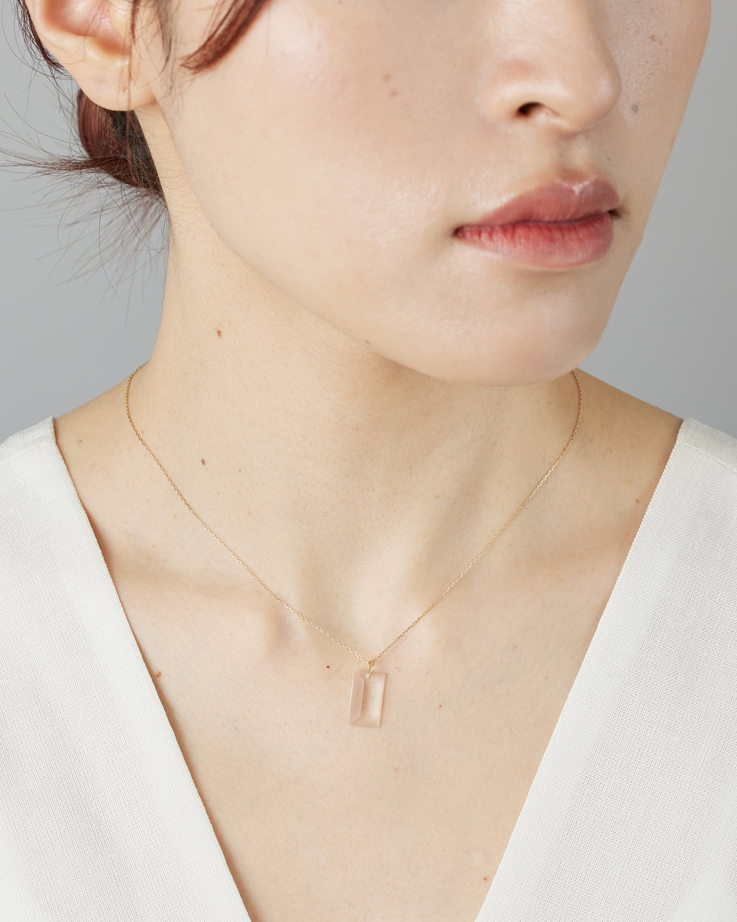 シャープなラインで構成されたモチーフは面によってマット加工を施し、クリアガラスの透明感とのコントラストが不思議な立体感を生み出すネックレス。華奢なゴールドのチェーンは首元に優雅にきらめきます。アジャスターにより4cmの長さ調整が可能です。