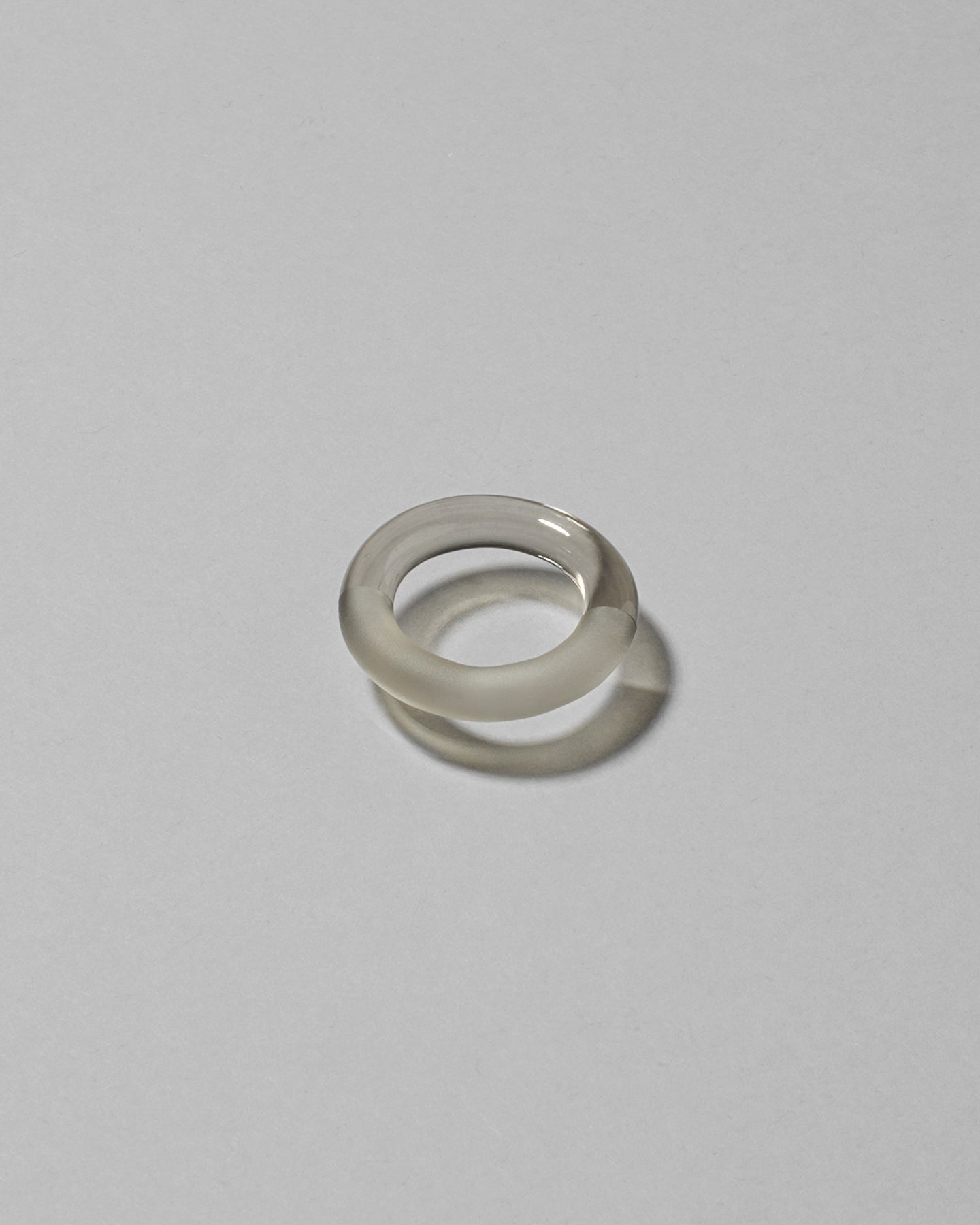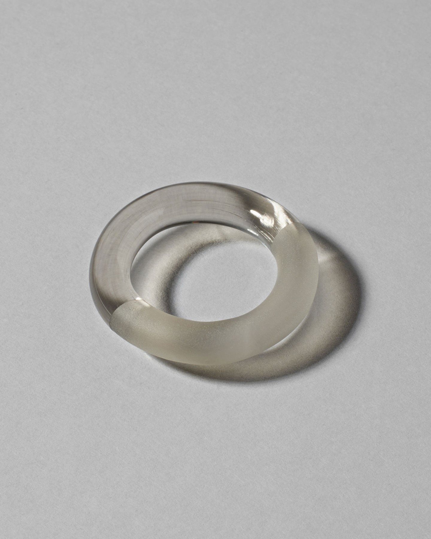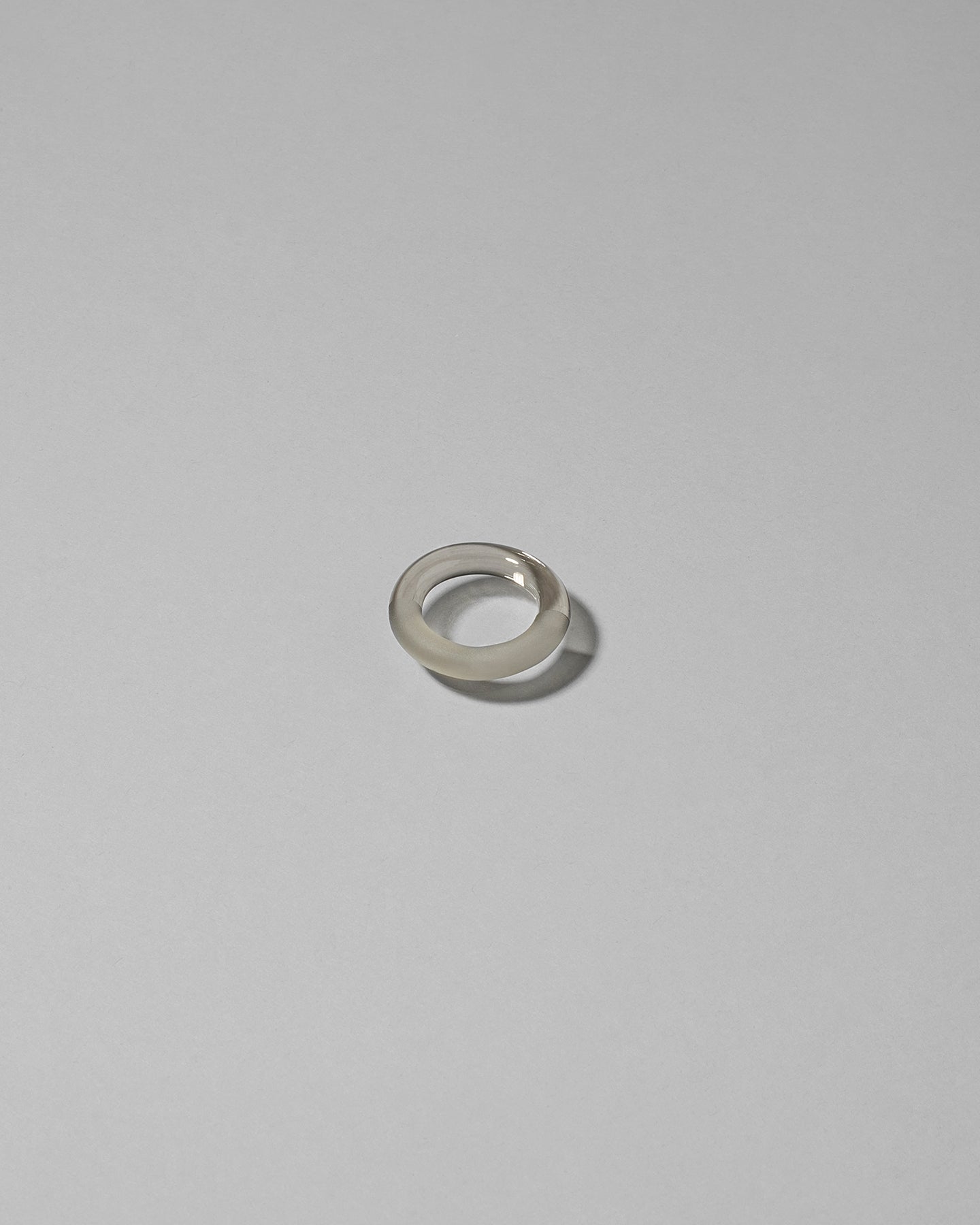 スモーキーグレーのガラスが美しく光を集め、半円のフロスト加工がリング全体に優雅な輝きを添えています。シンプルなフォルムが手元に洗練された印象を与えます。