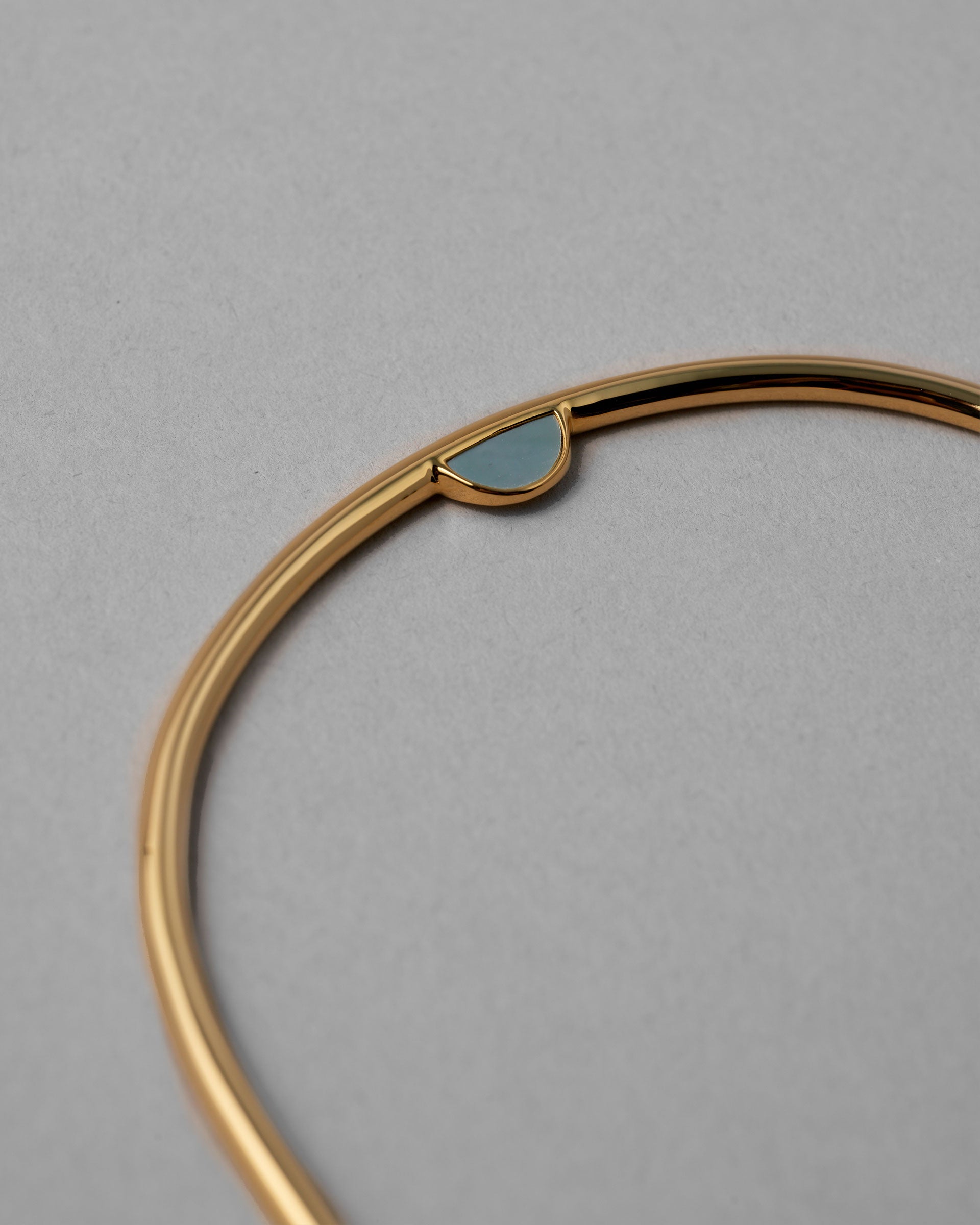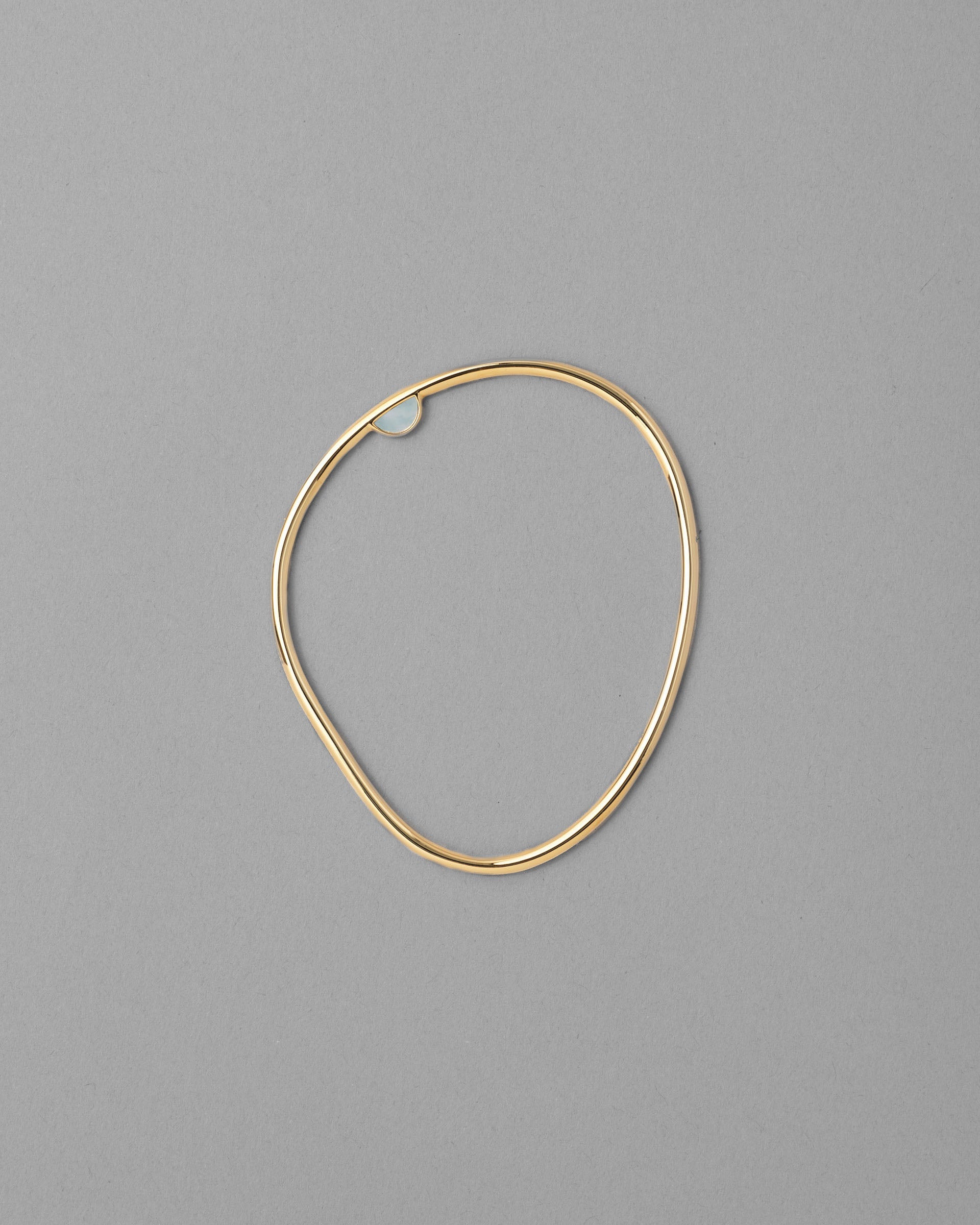 Introducing refreshingly clear blue grey pieces from the popular RADEN series. Custom made by a makie (lacquerware) artist to suit the SIRI SIRI aesthetic, the blue grey raden and simple design employing mother-of-pearl inspire a fresh and graceful impression. Bangle Hindwing is endowed with an organic and contemporary design with its curves reminiscent of an architectural structure. Its raden detailing sits gently inwards on the arm, giving a soft impression of a golden hoop lightly enveloping the arm.