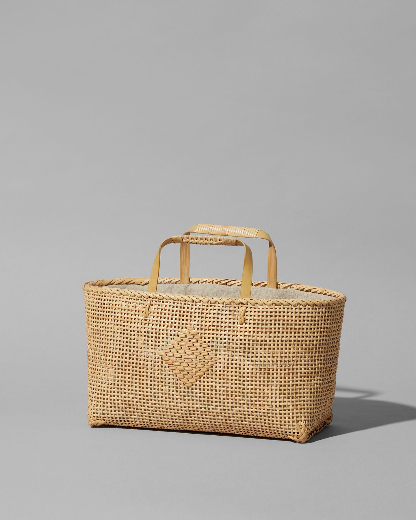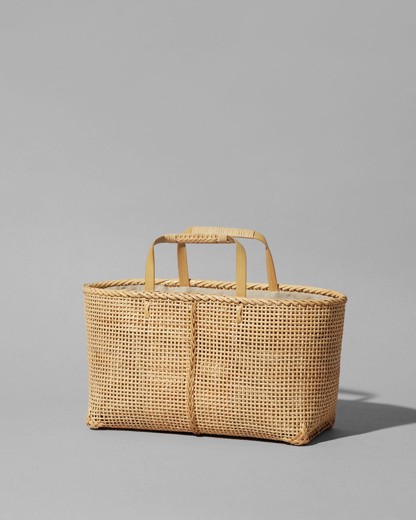 持ち手にはシャープに曲げ加工した竹を使い、底や角には皮籐を編み込んで強度を出すと同時に丸みを出し、補強もデザインの一部となるような形に仕上げました。