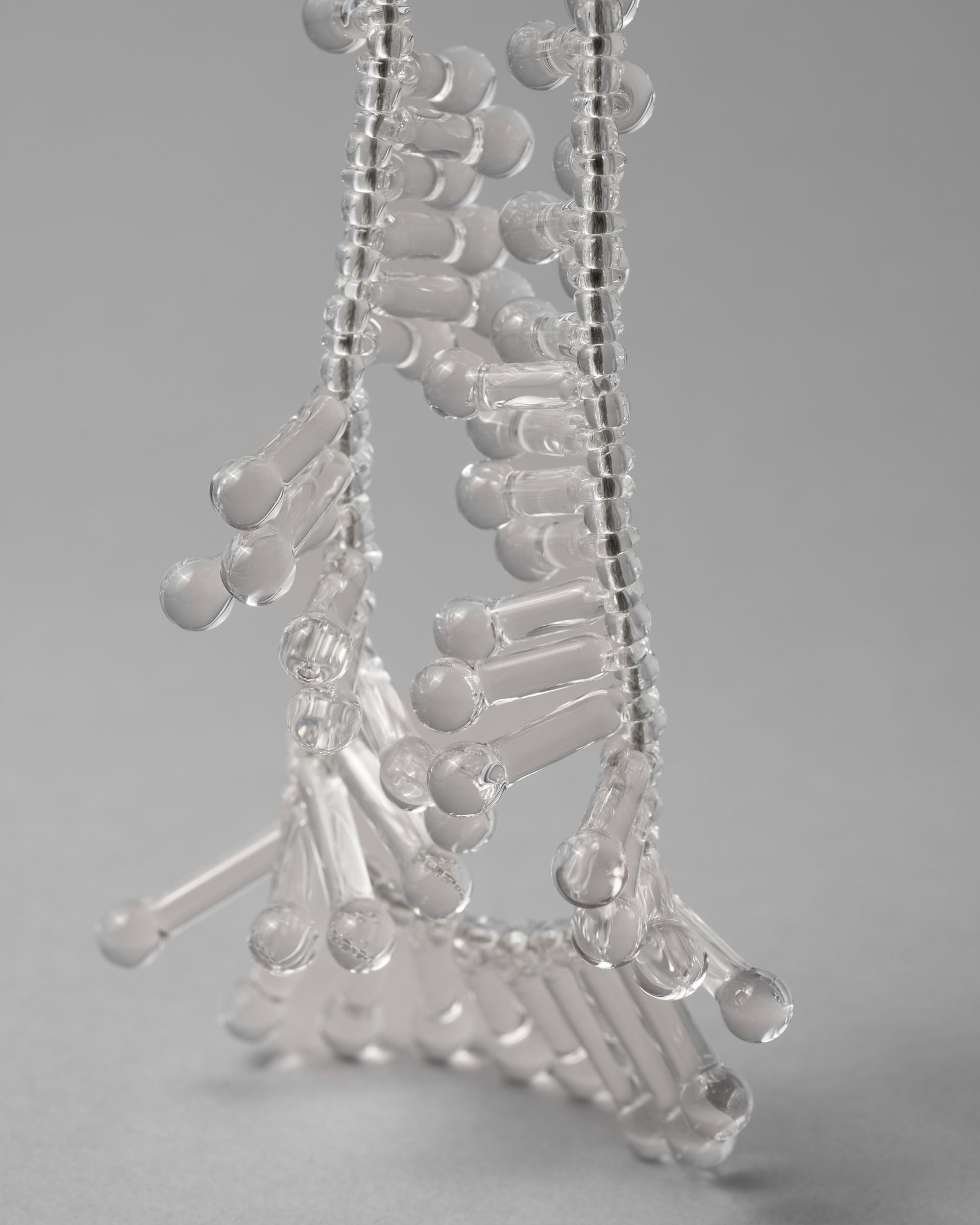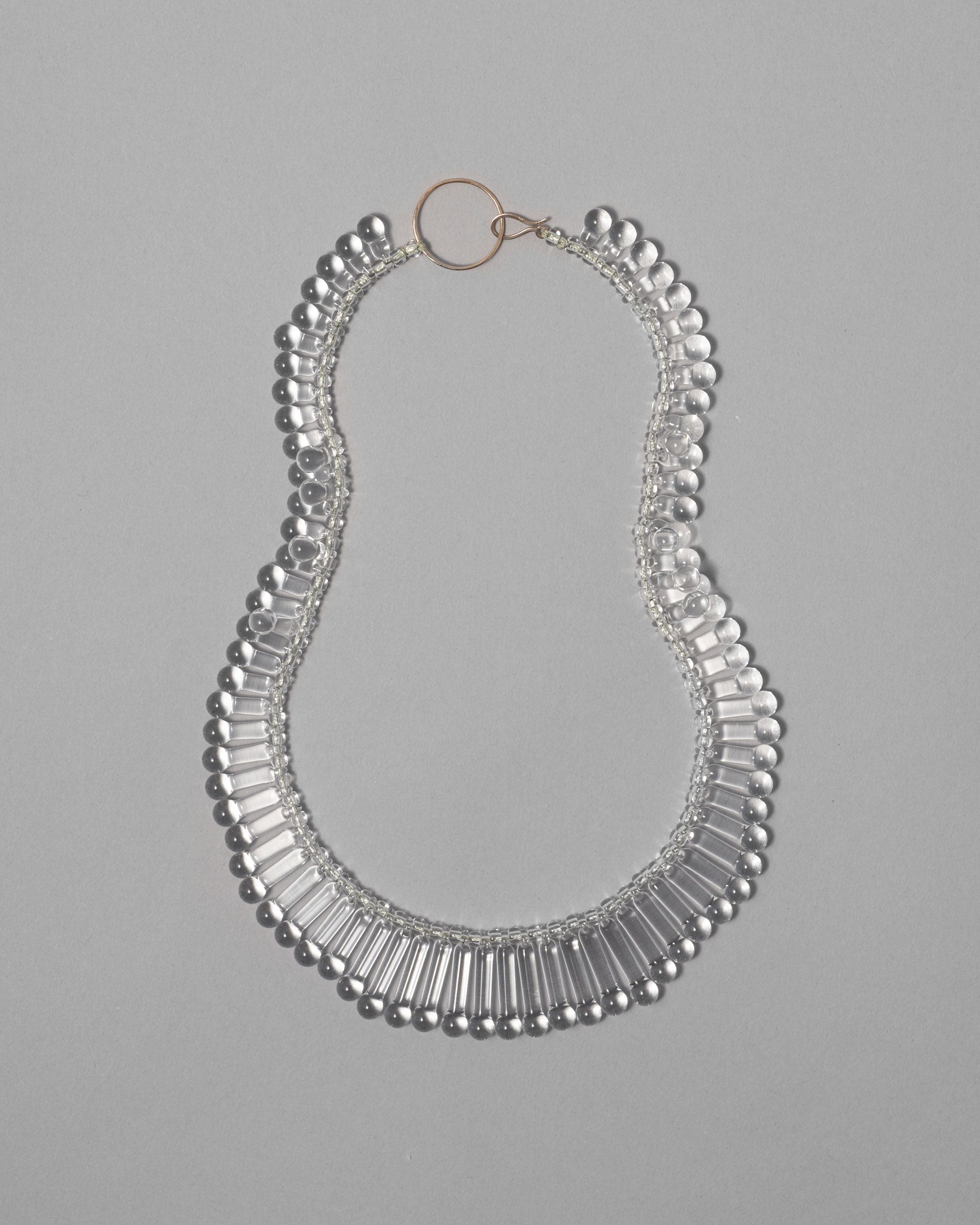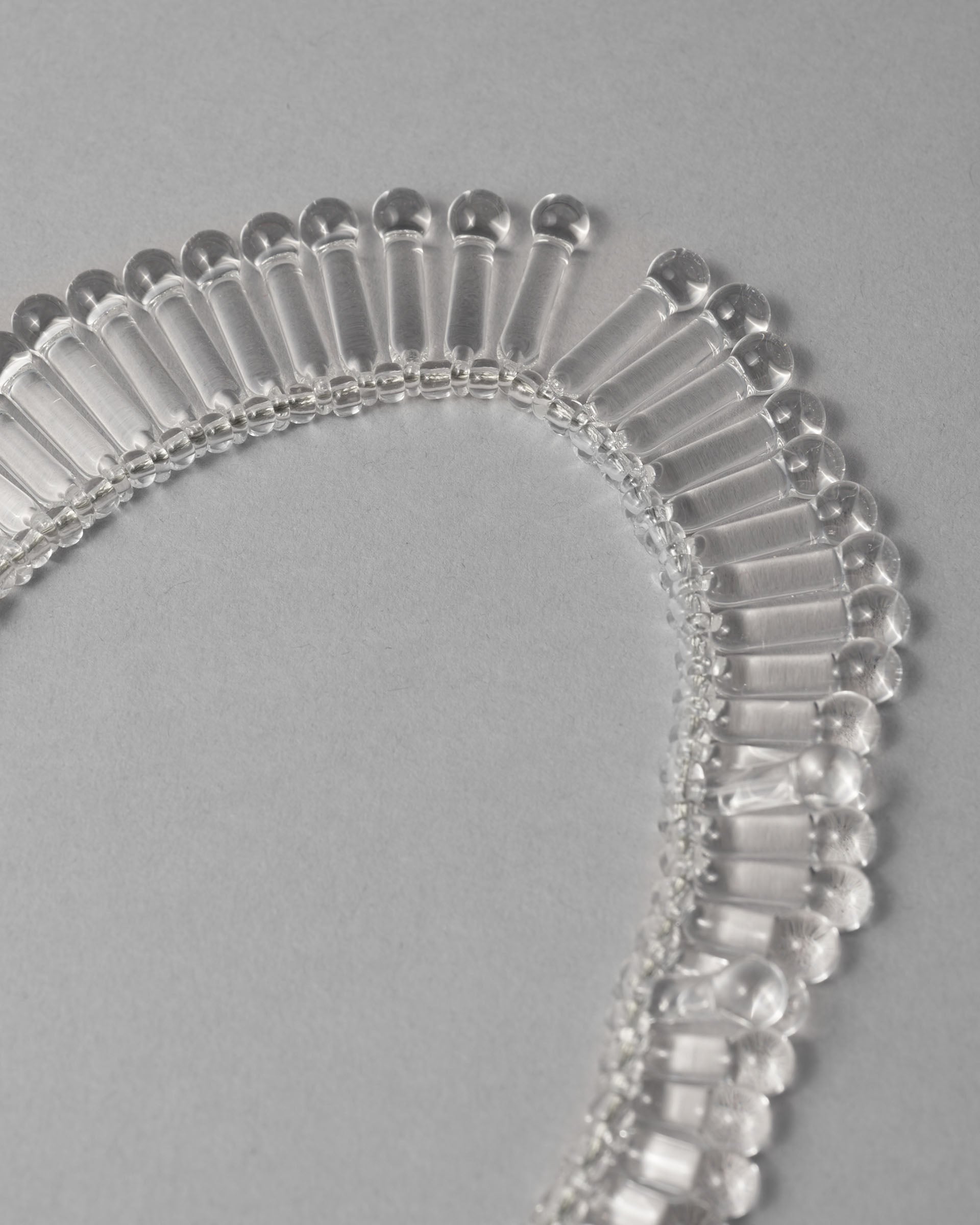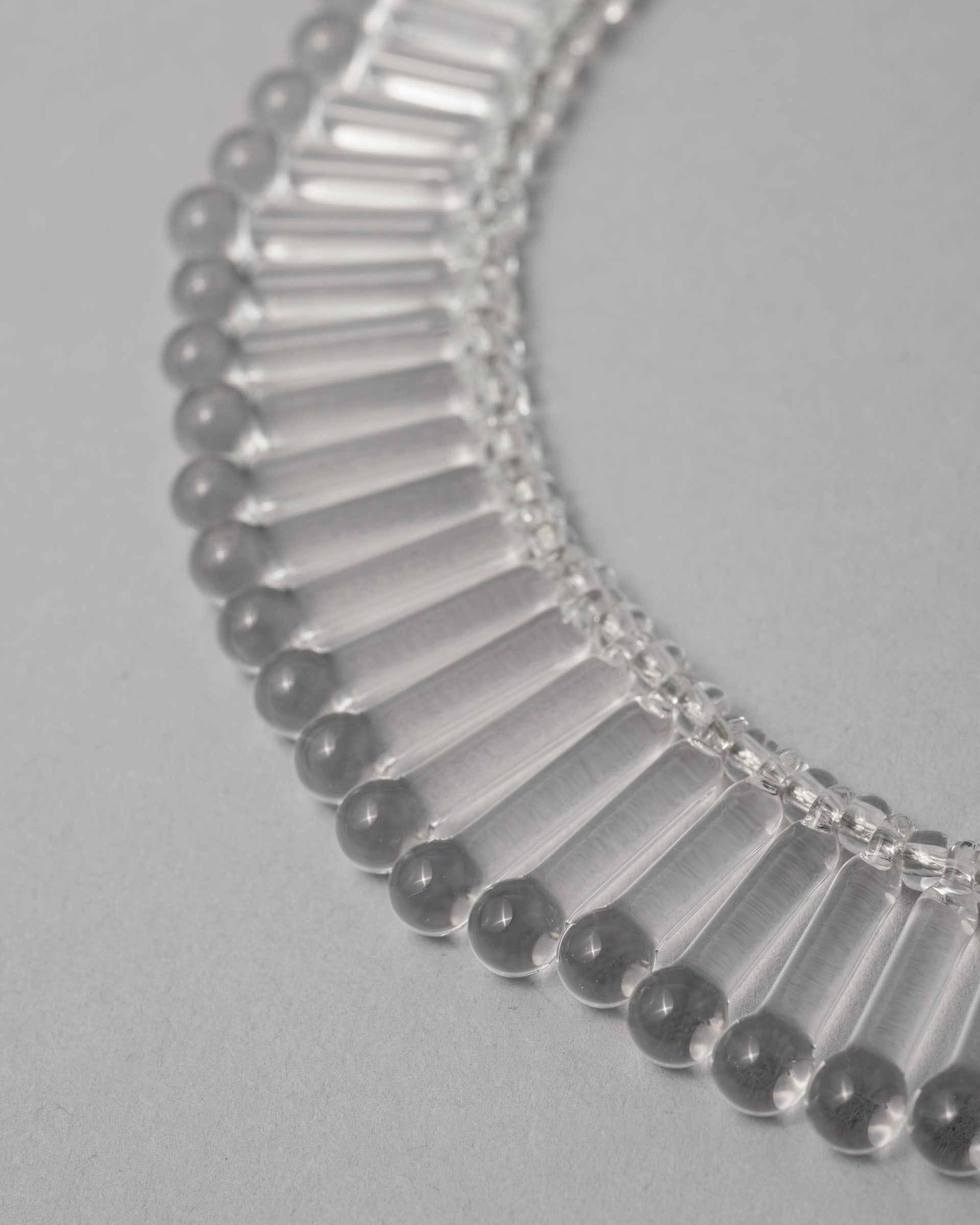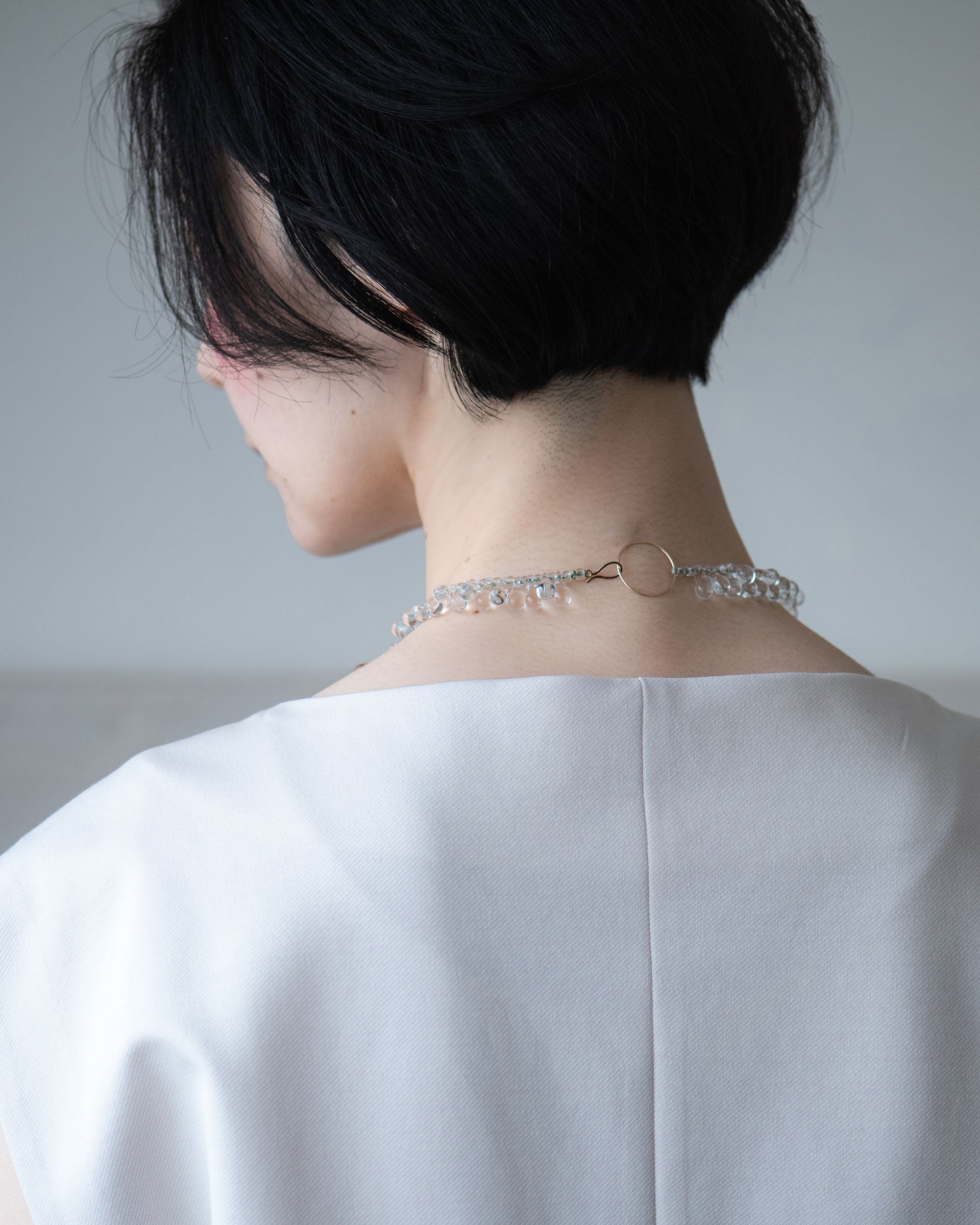 ガラスの装飾が綿々と連なり重なり合い、動きに合わせて自由に踊る姿が大胆に首もとを彩ります。