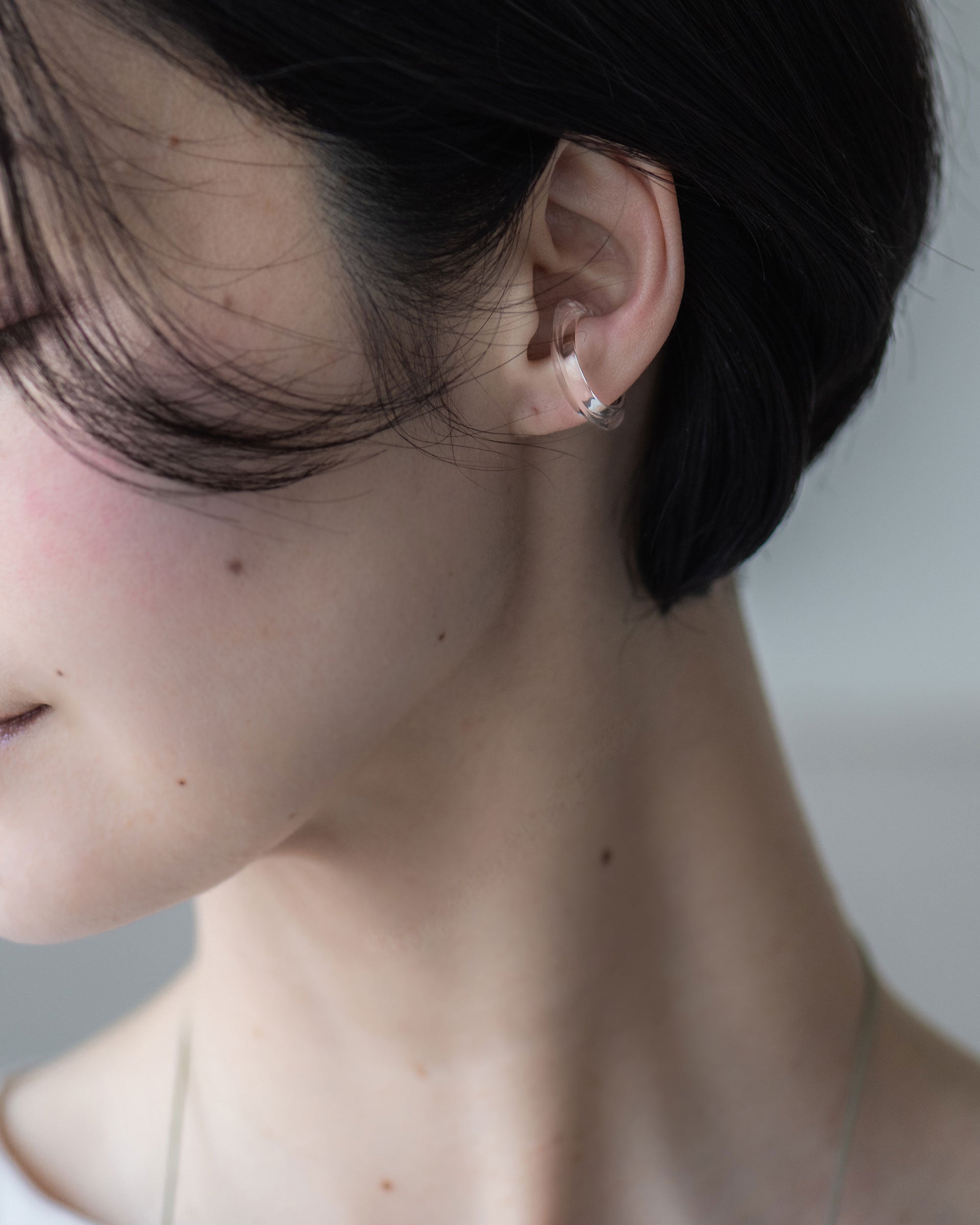 まるで氷のような佇まいをもち、エッジーな硬質さと触れると溶けてしまいそうな儚さを感じさせるイヤーカフです。