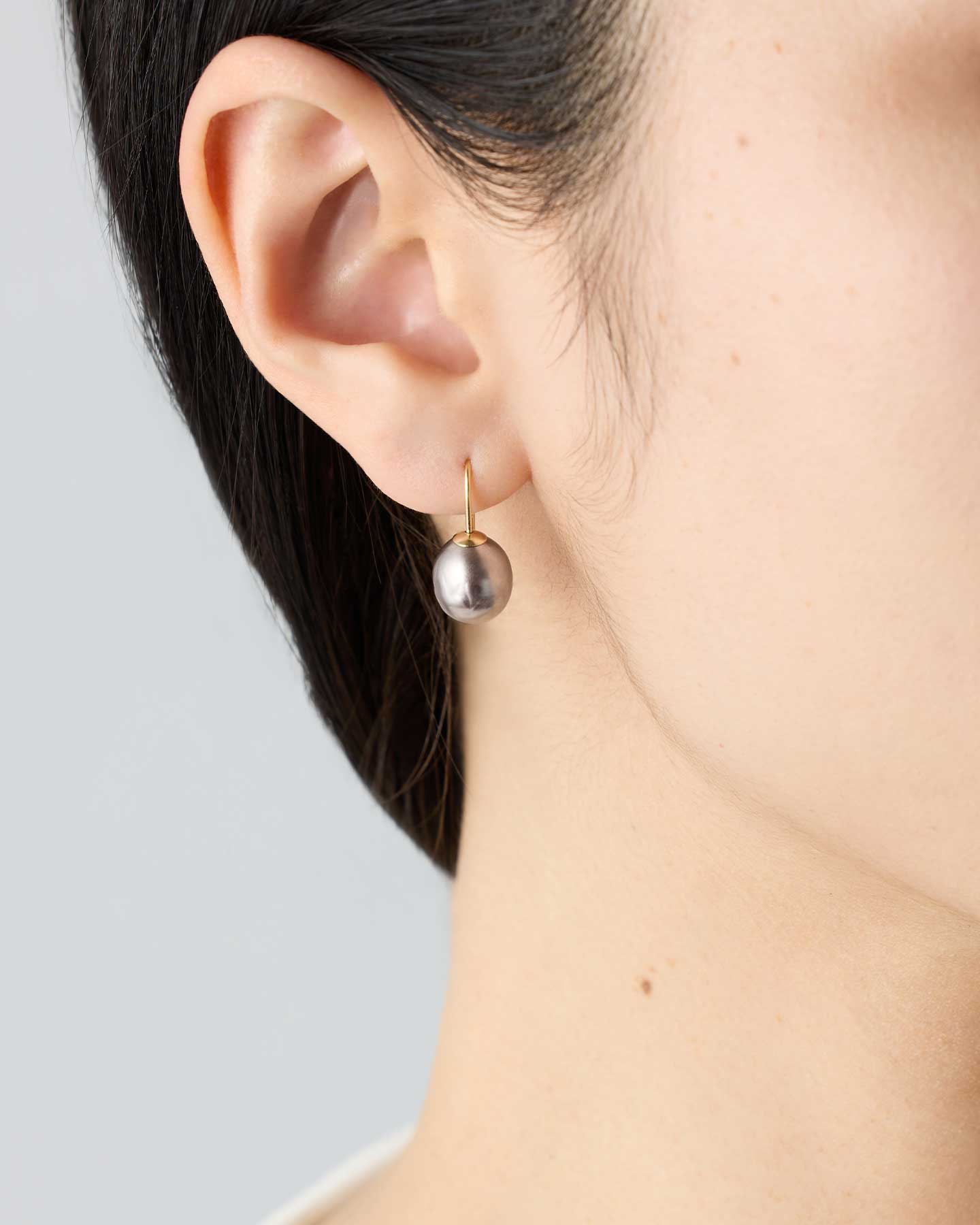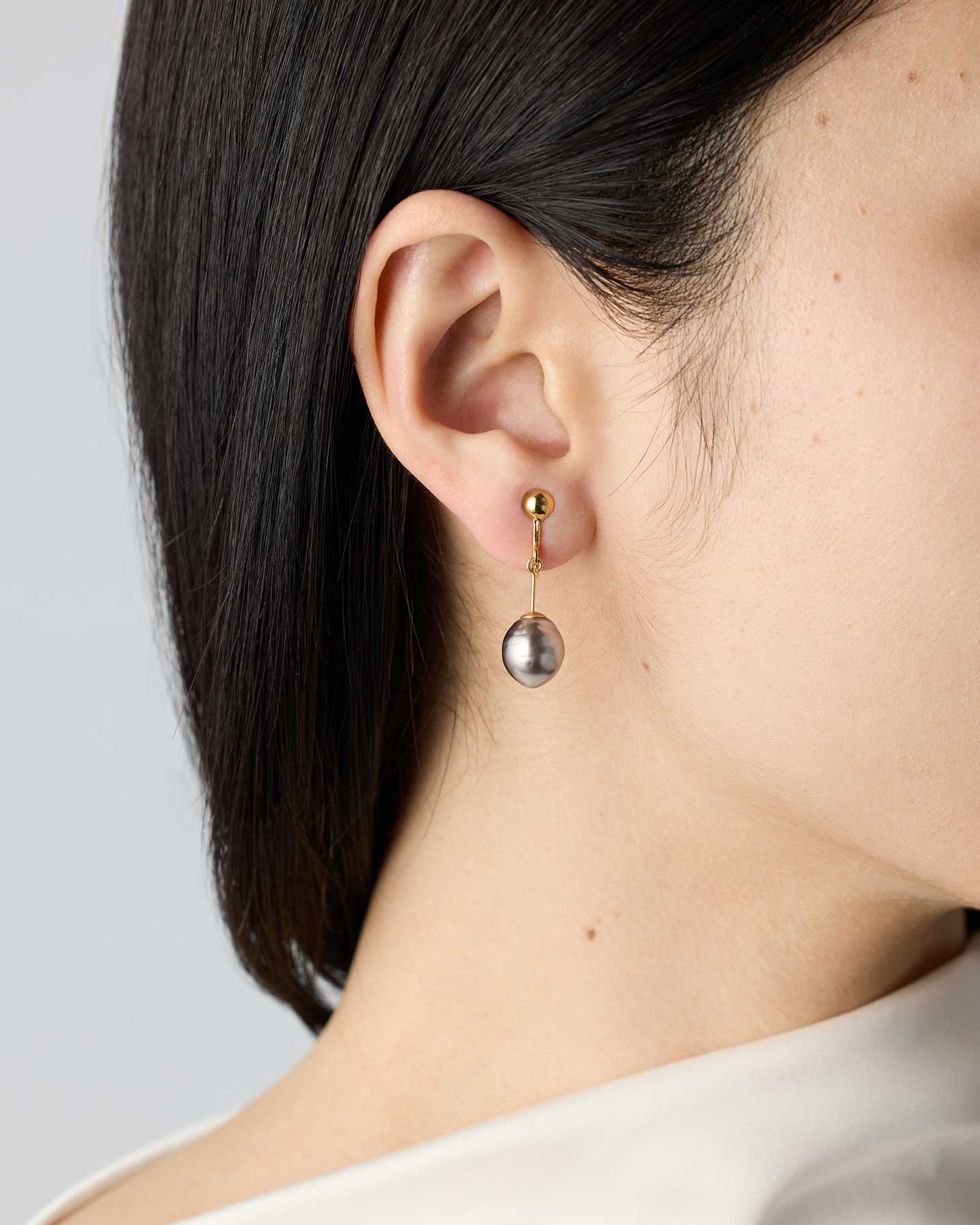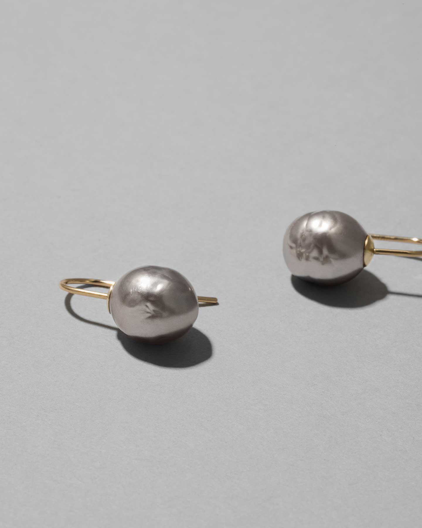 タヒチパールを思わせる、神秘的なグレーカラーのガラスパールを使用したピアス(イヤリング)。有機的なバロック型のフォルムが、果実のように耳元で揺れ動きます。深みのあるグレーの輝きに、ゴールドの金具が品のあるアクセントを添え、洗練された表情を演出します。