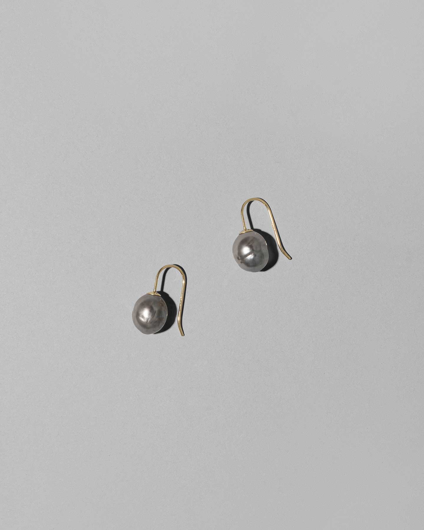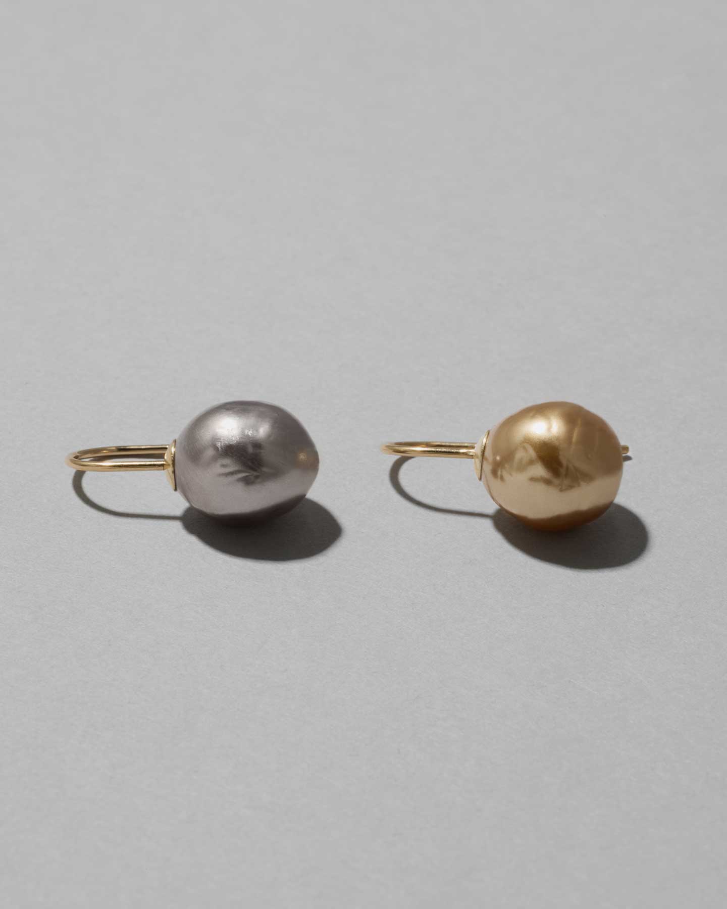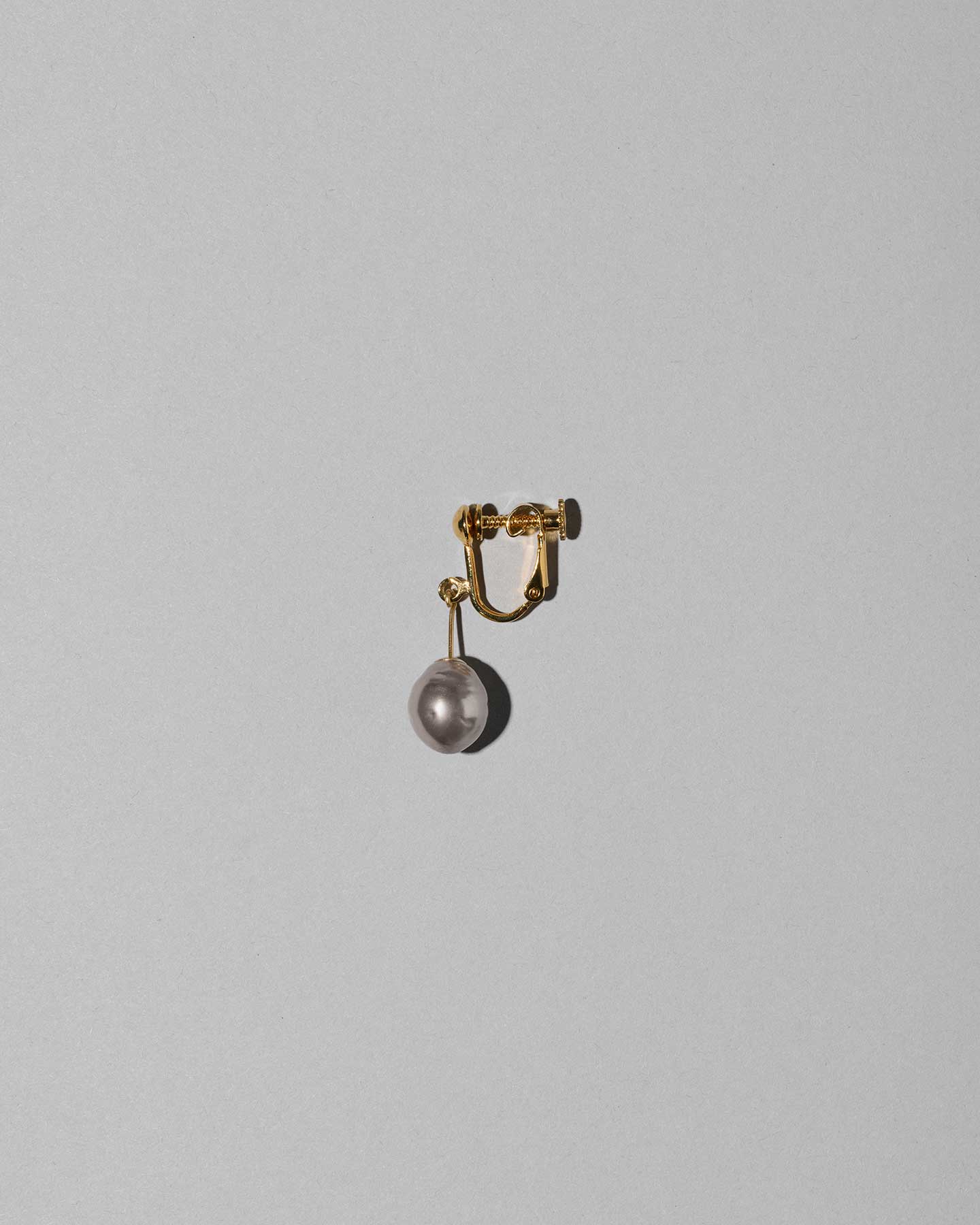 タヒチパールを思わせる、神秘的なグレーカラーのガラスパールを使用したピアス(イヤリング)。有機的なバロック型のフォルムが、果実のように耳元で揺れ動きます。深みのあるグレーの輝きに、ゴールドの金具が品のあるアクセントを添え、洗練された表情を演出します。