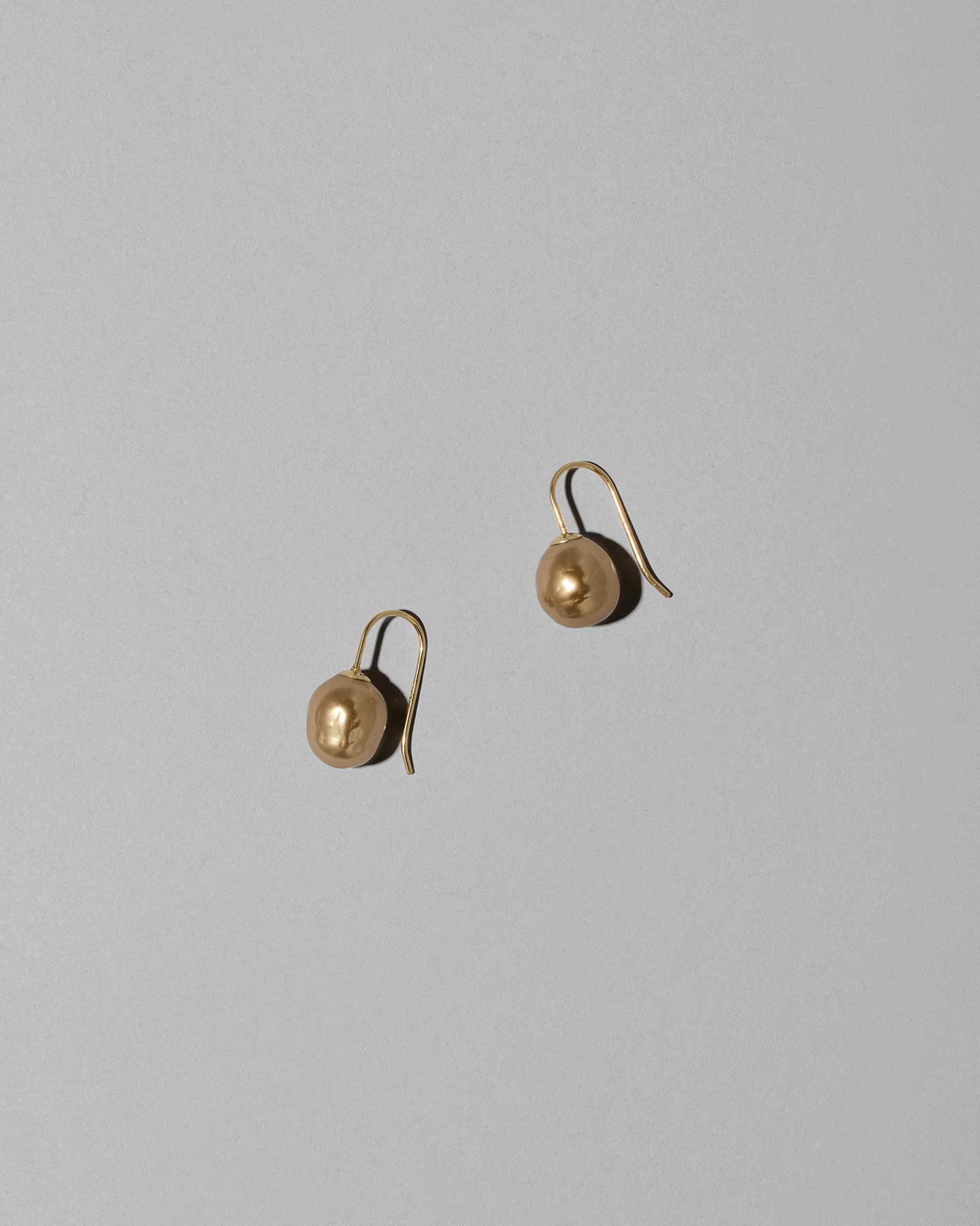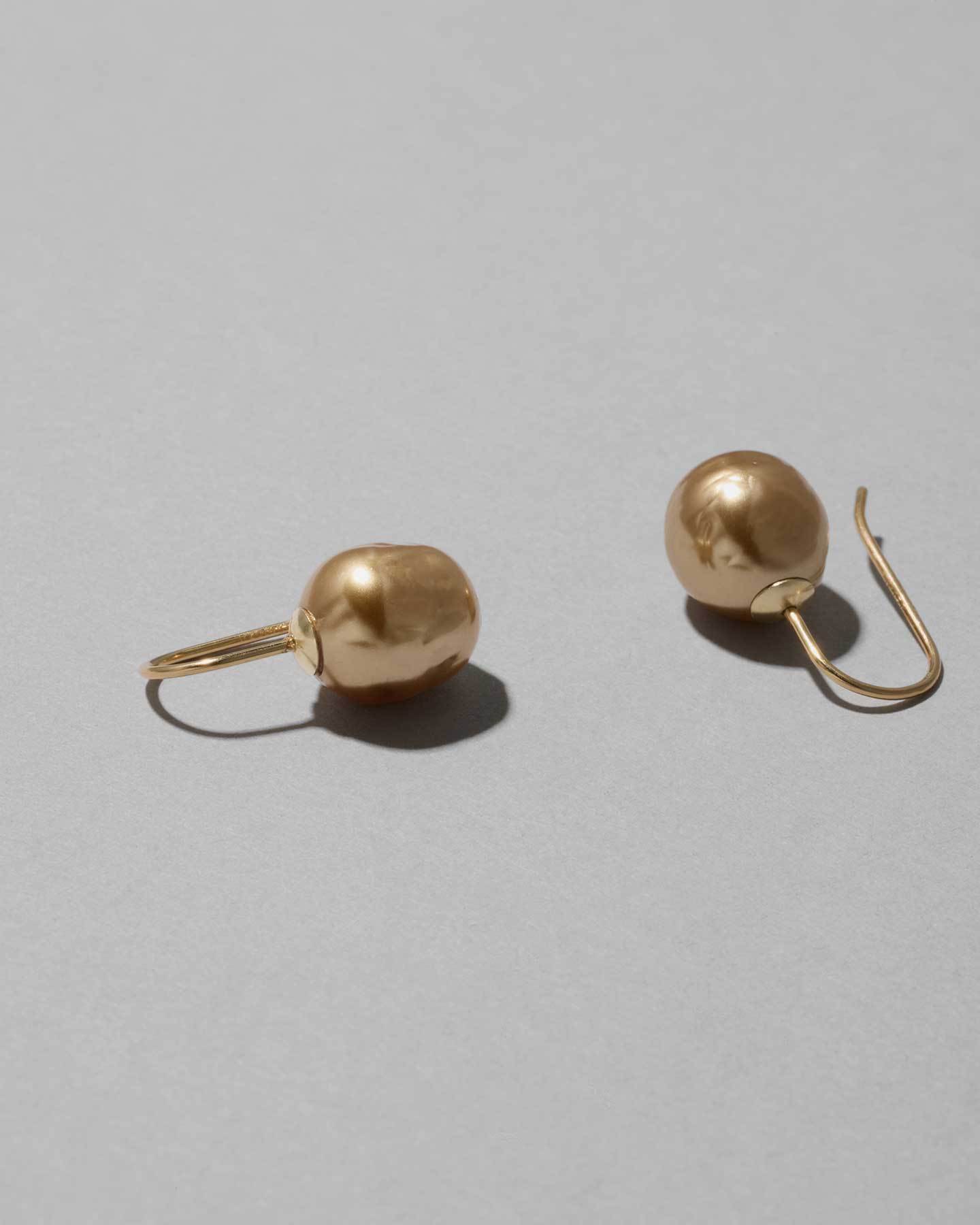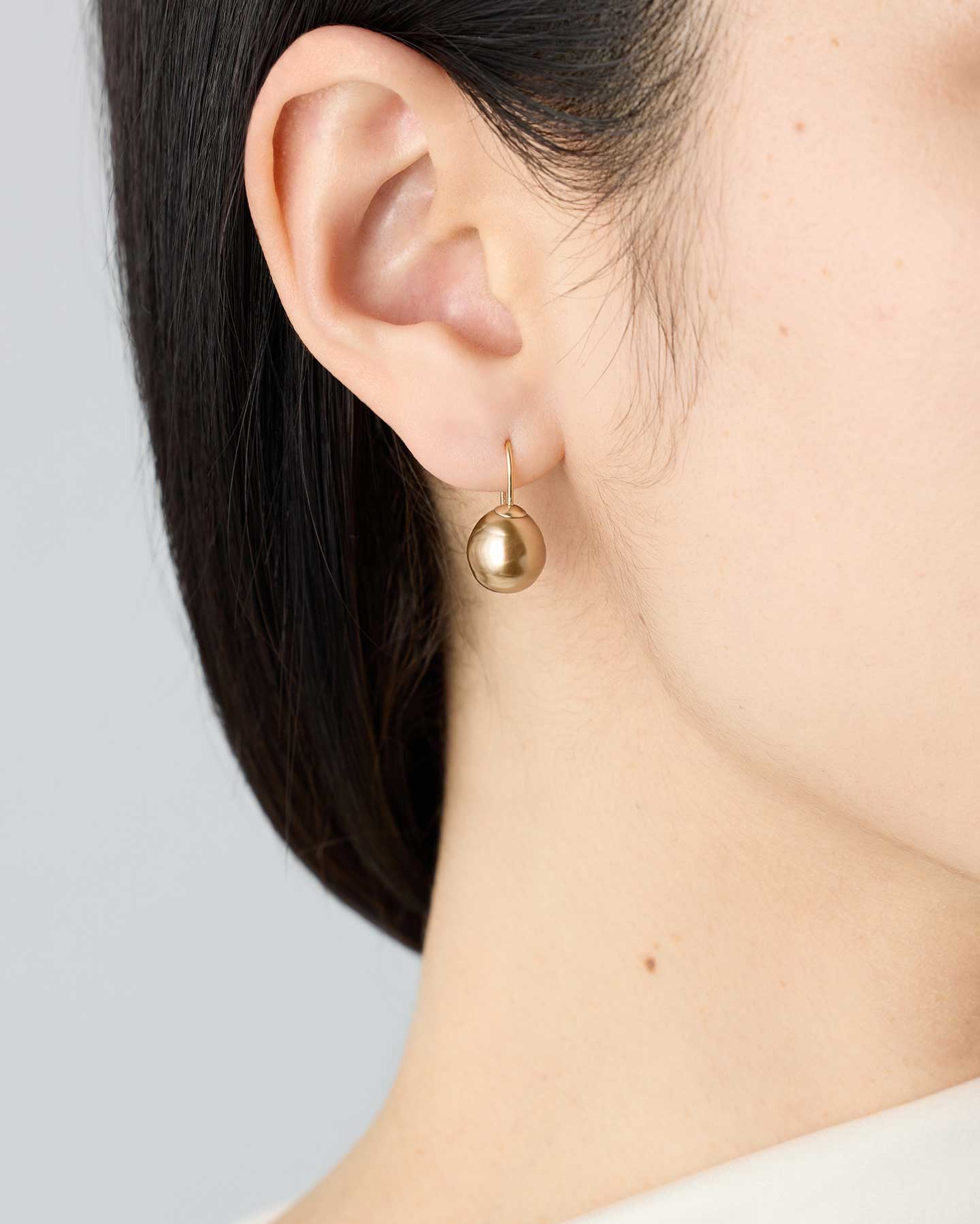 太陽のような温かみのあるゴールドカラーのガラスパールが印象的なピアス(イヤリング)。光を受けて輝くバロック型のフォルムが、耳元に華やぎをもたらします。ゴールド金具との組み合わせが上品で、装いに優雅なニュアンスをプラスします。