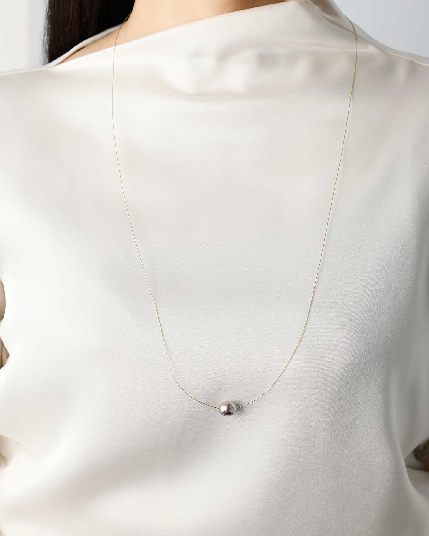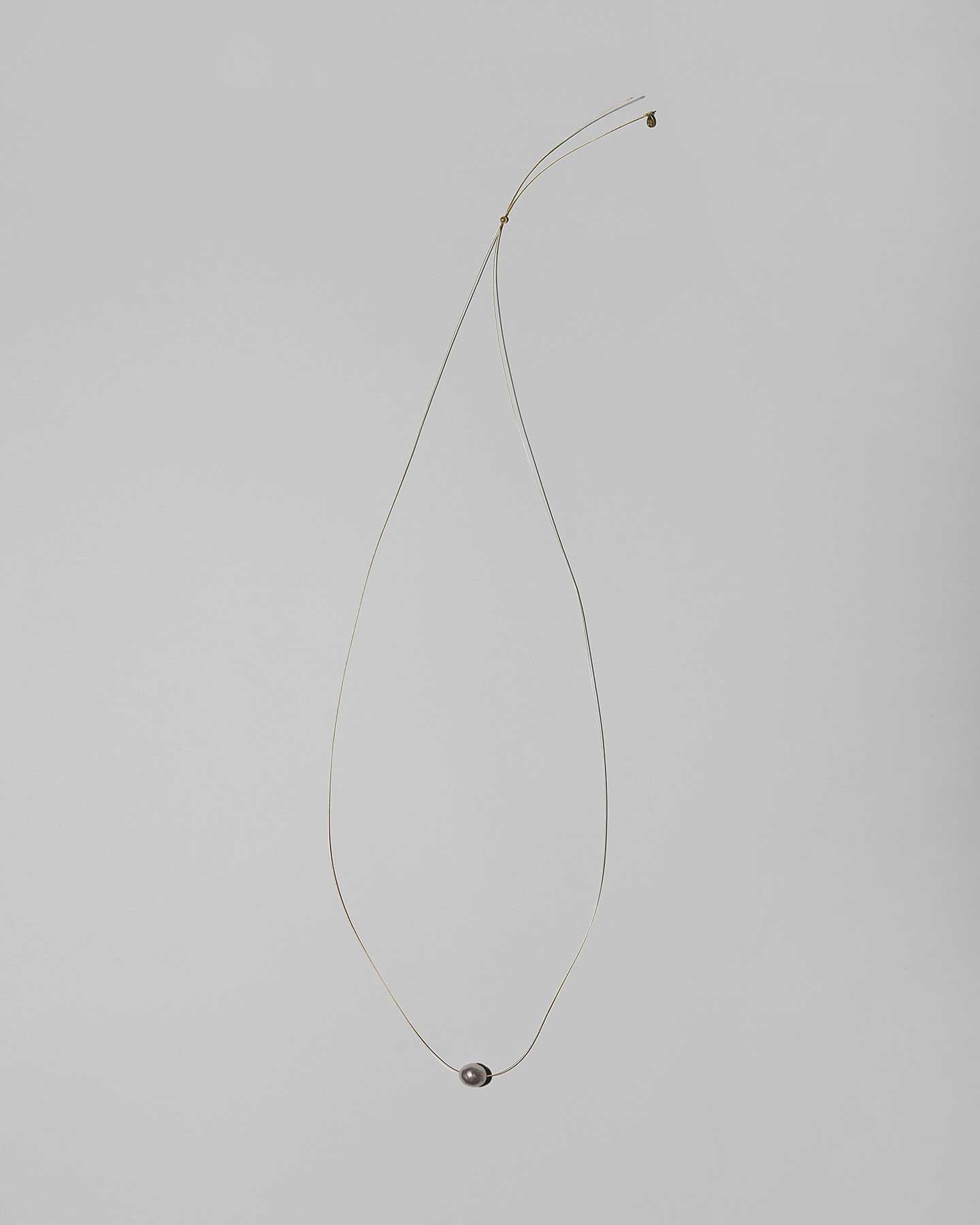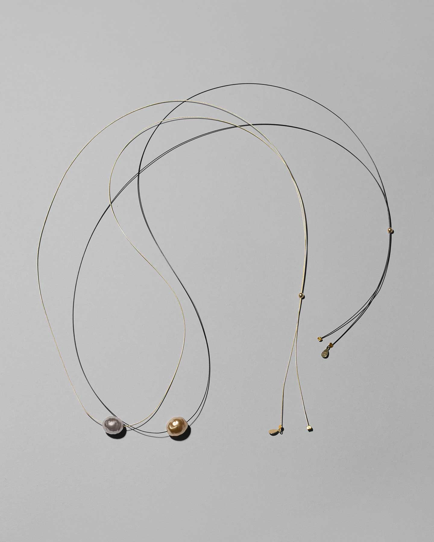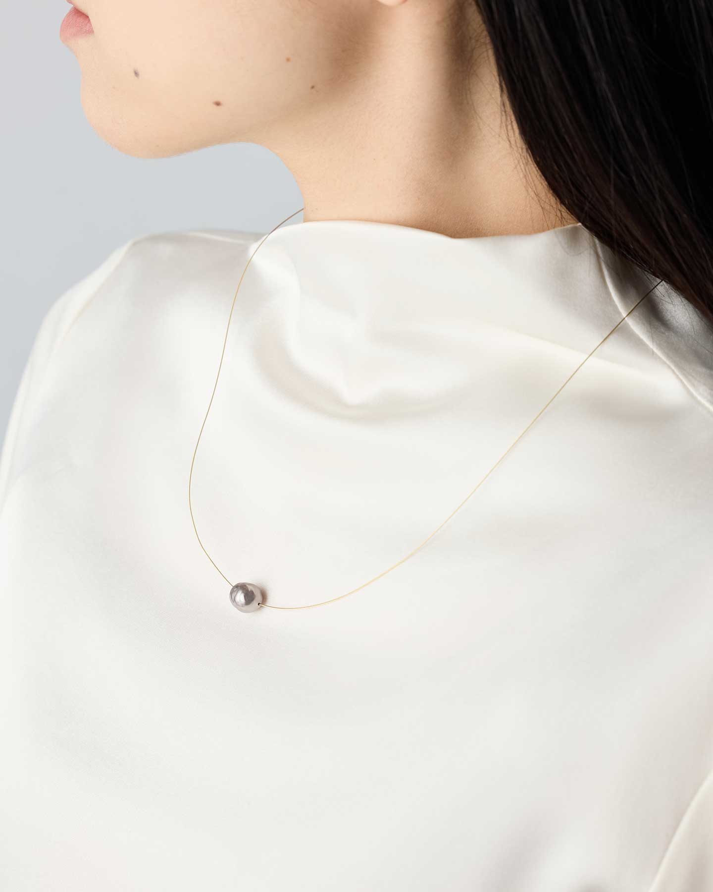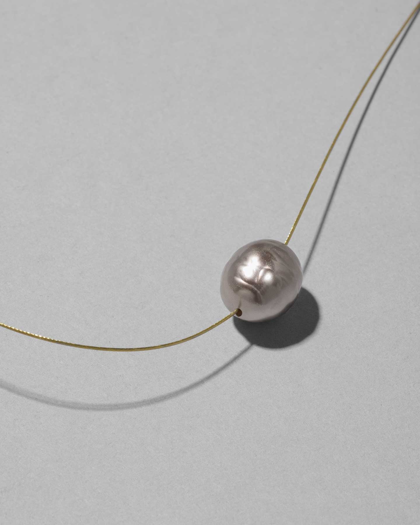 タヒチパールのような神秘的なグレーのガラスパールのネックレス。柔らかなバロック型が上品なアクセントとなり、ワイヤーの軽やかさがモダンな印象に。襟元に合わせて自由に調整でき、日常使いはもちろん、ドレスアップにさりげなくニュアンスをプラスします。