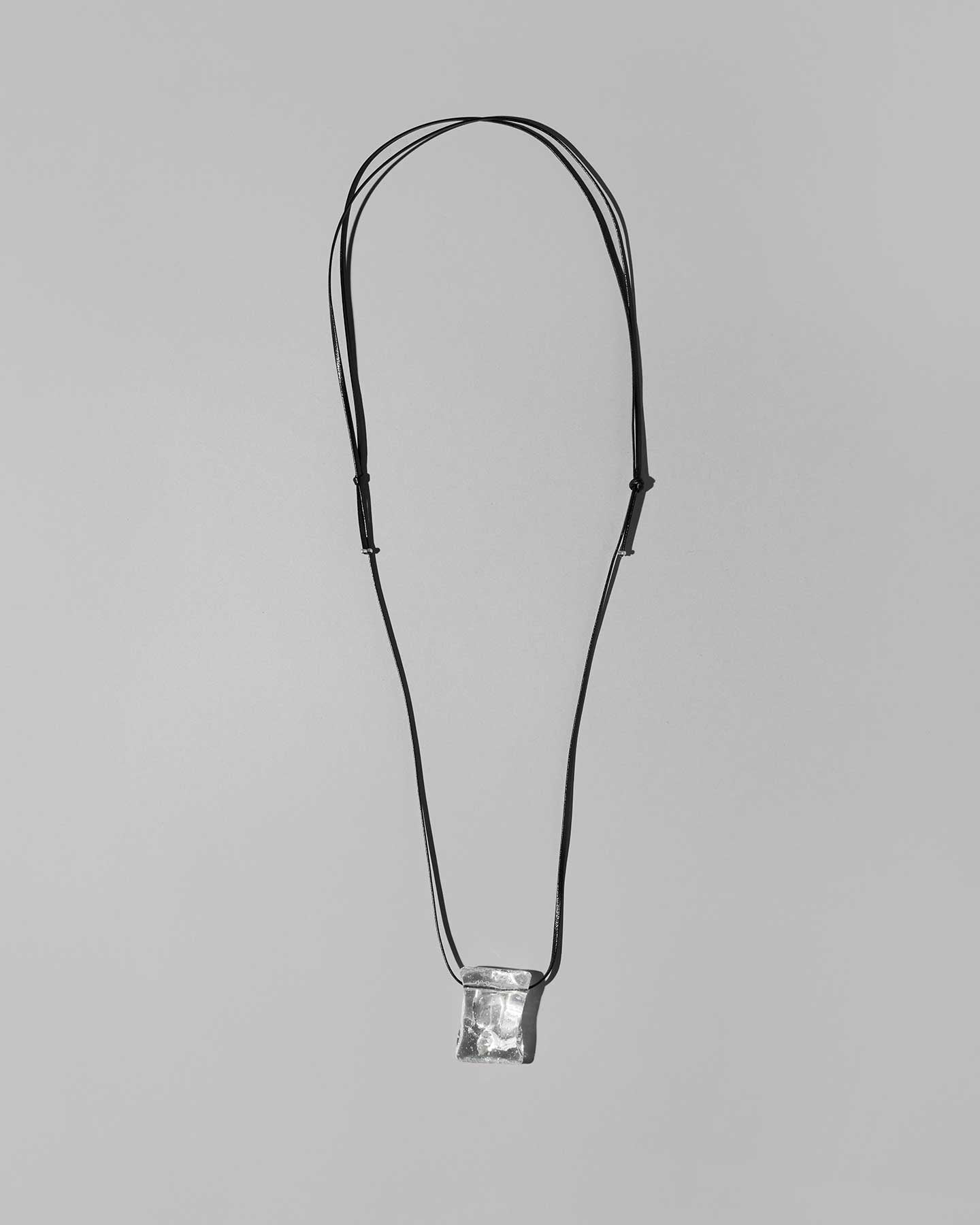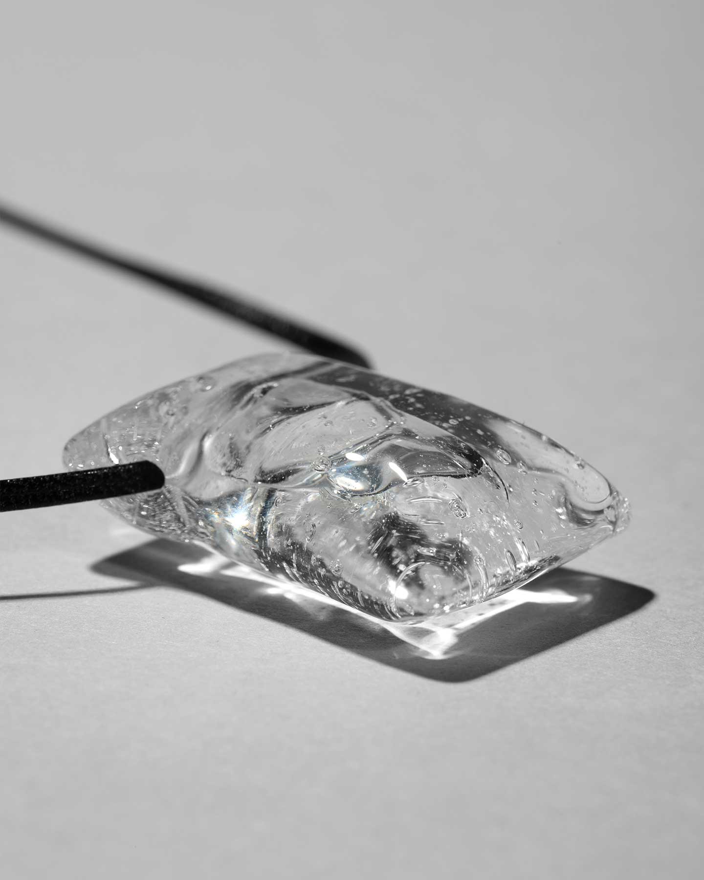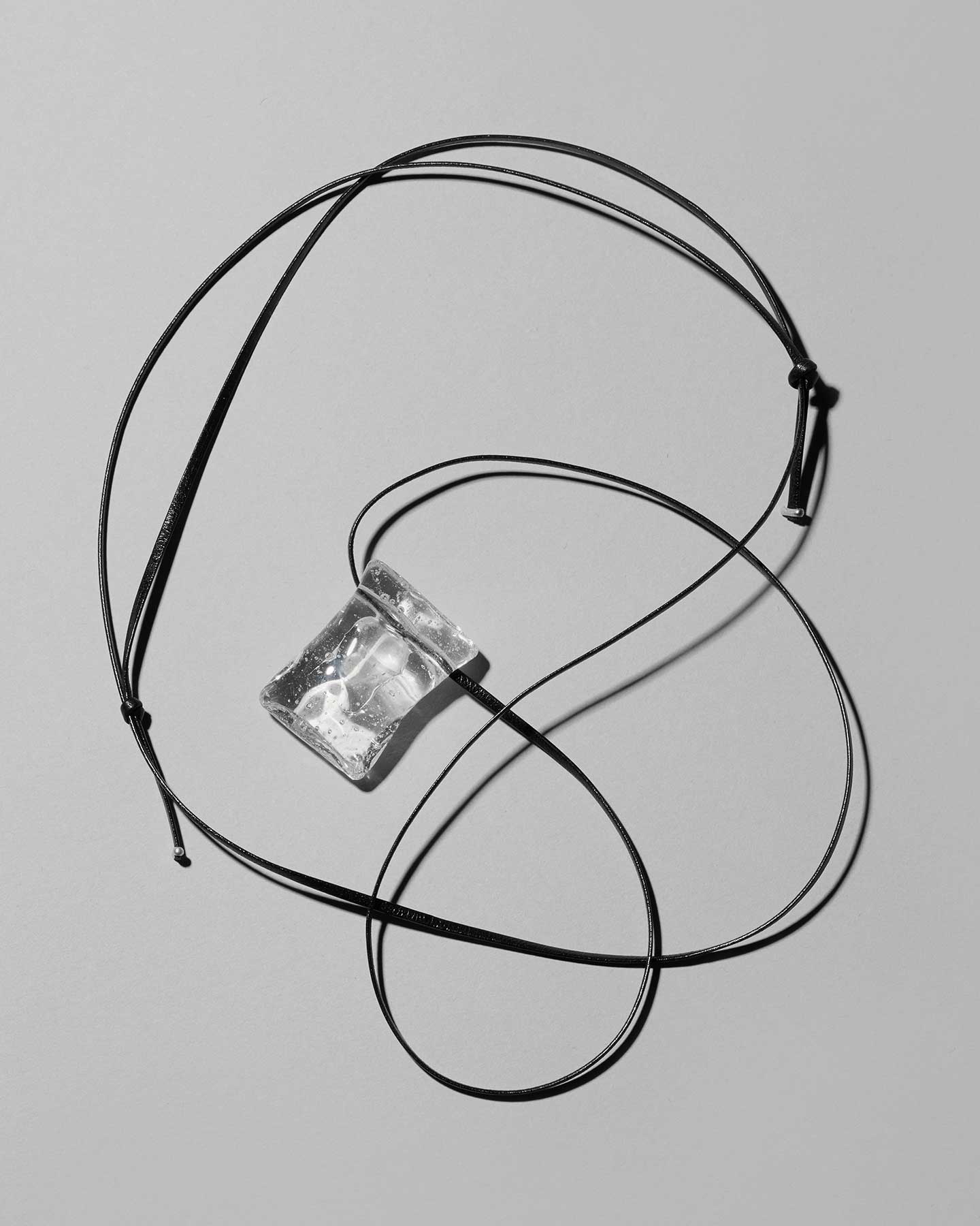 透明なガラスに大小の泡を閉じ込めたネックレス。まるで水をそのまま切り取ったような瑞々しい輝きと浮遊感が魅力です。ブラックレザーの紐がモダンなアクセントを添え、デニムなどと合わせてカジュアルにも、モノトーンで纏めた都会的な装いにもお使いいただけます。