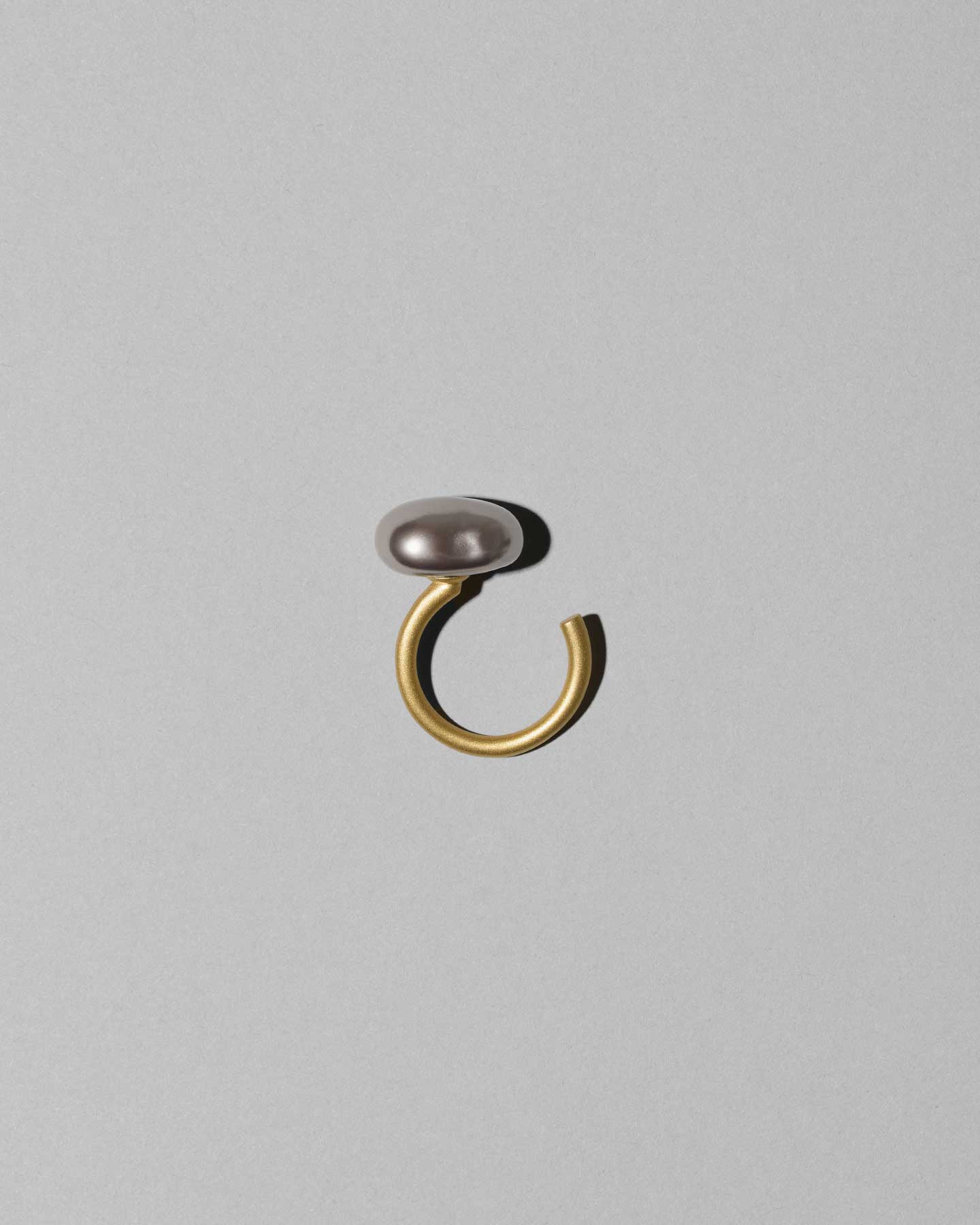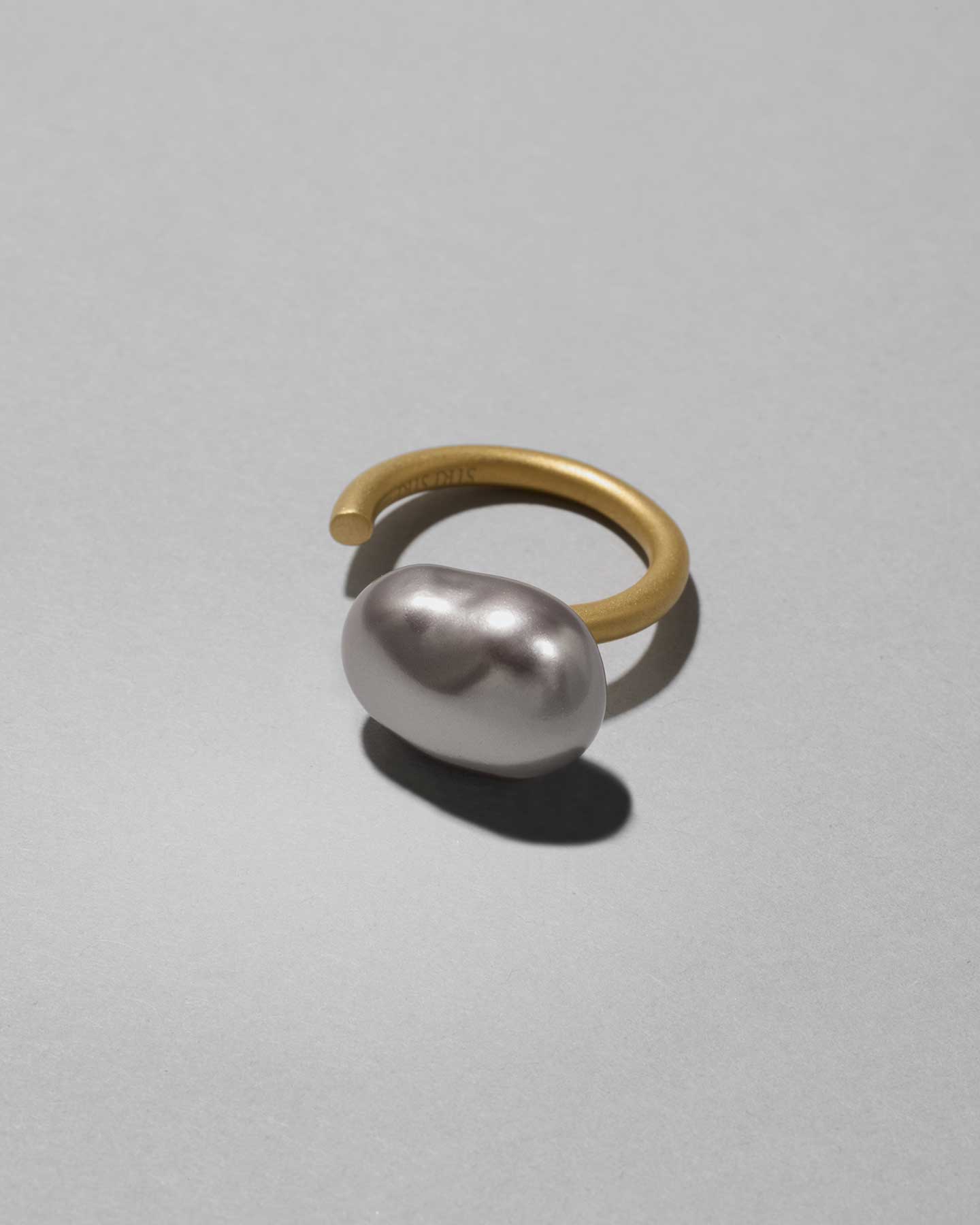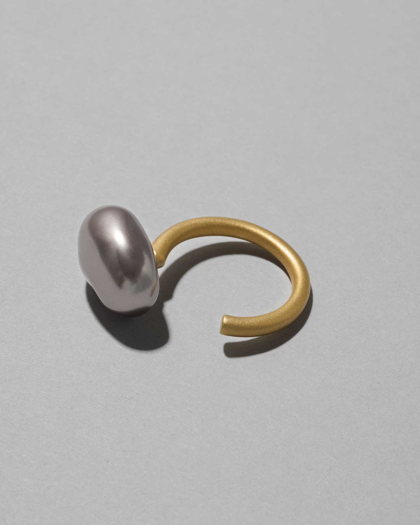 タヒチパールのような神秘的なグレーのガラスパールのリング。ボリューム感のあるバロック型に、ゴールドのアームが華やかさを引き立てます。単体でシンプルに楽しむのはもちろん、ゴールドのブレスレットやピアスと合わせると、統一感のある上品なコーディネートに。