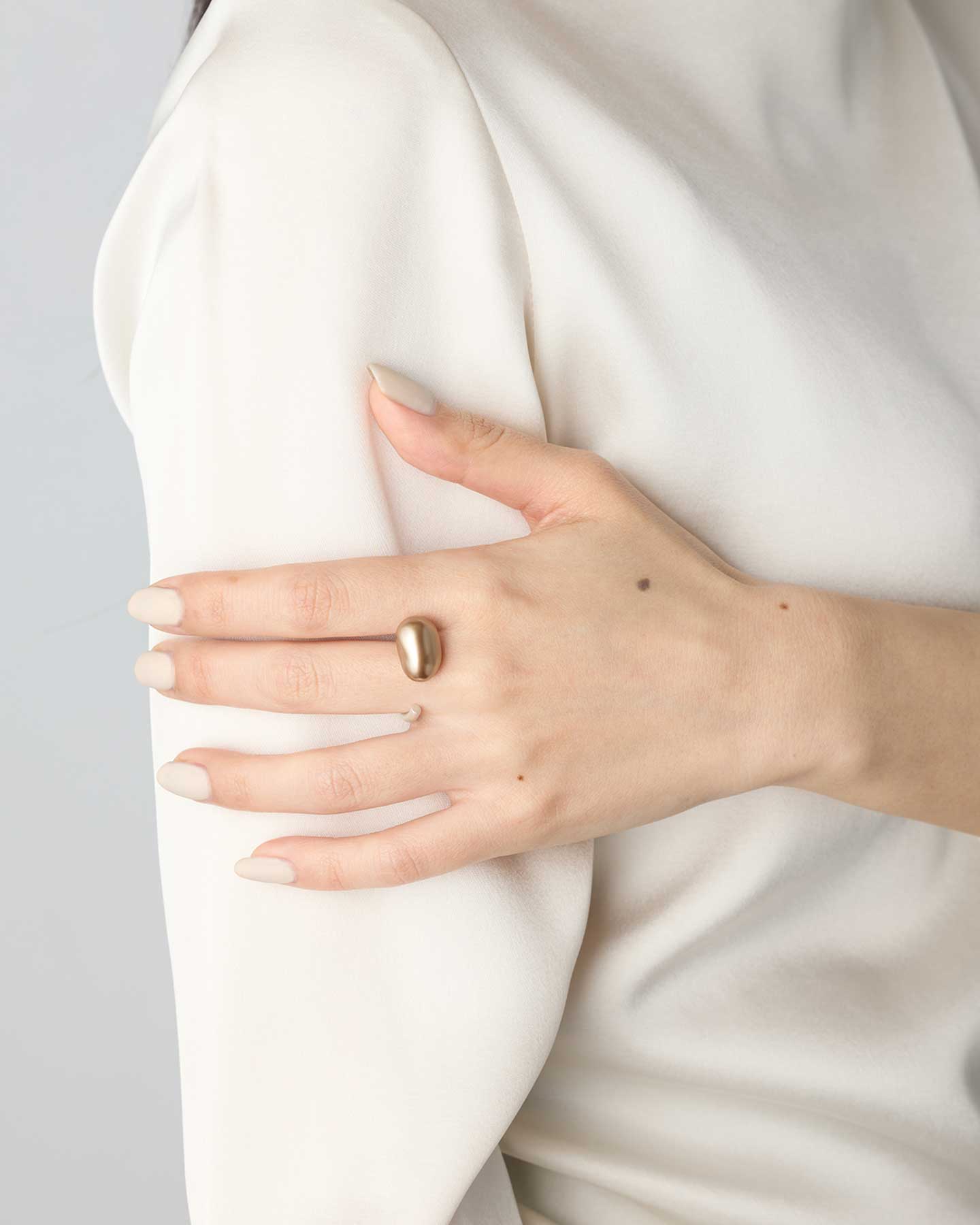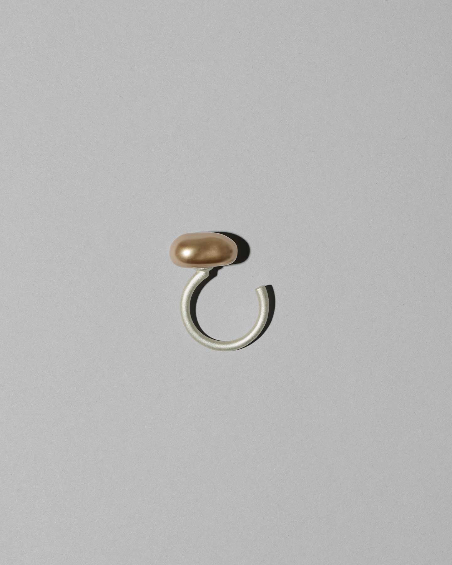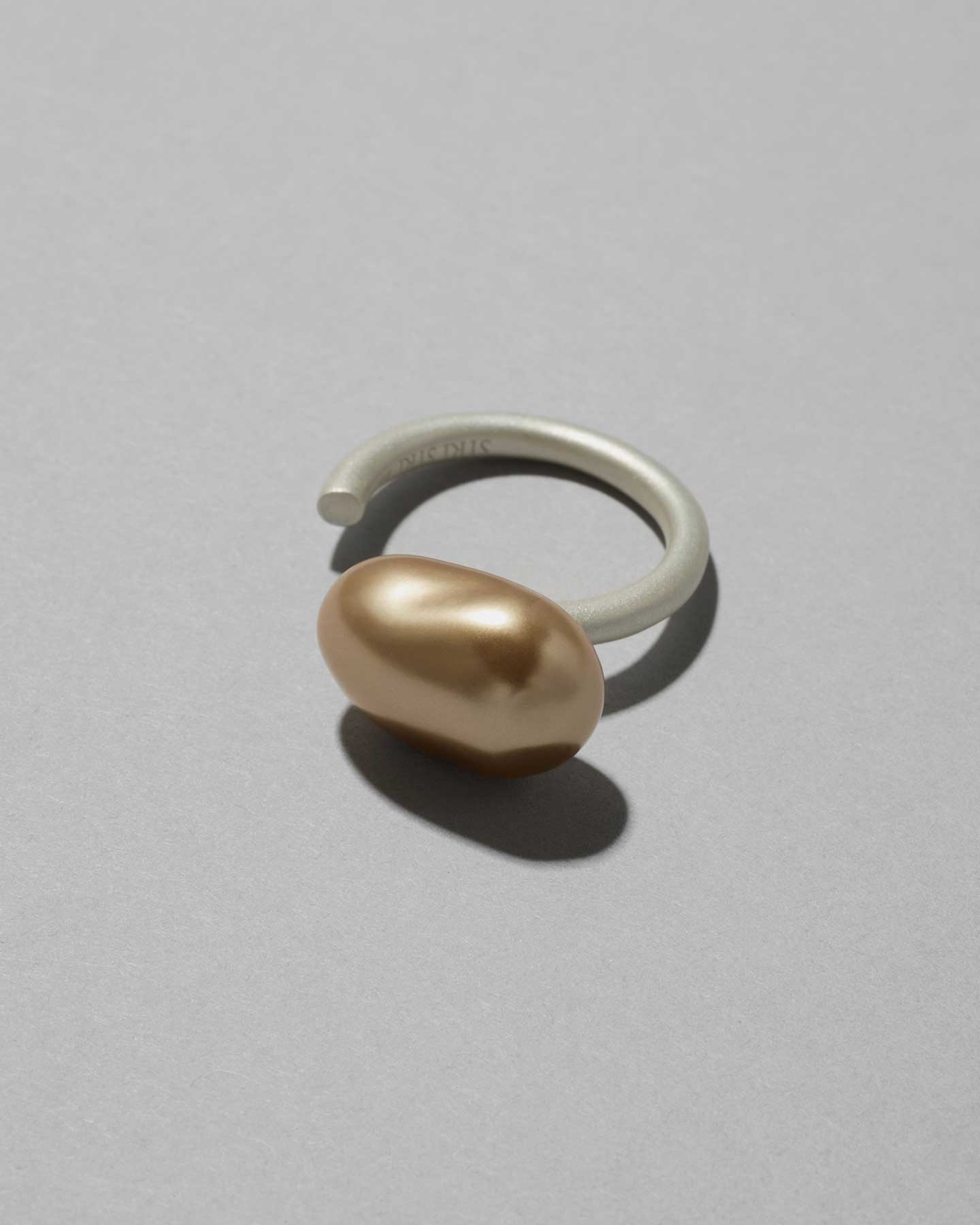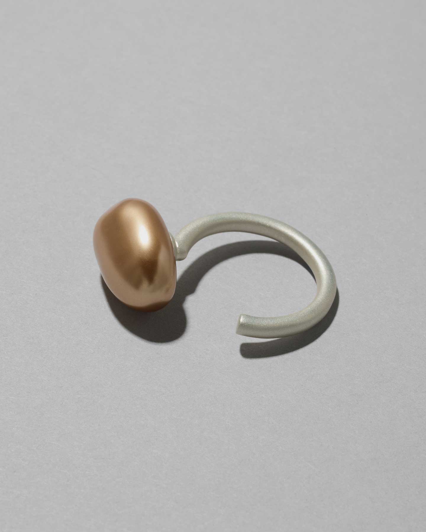 太陽のような暖かな色味のガラスパールのリング。ボリューム感のあるバロック型に、シルバーのアームが洗練されたコントラストを生み出します。ゴールド色、シルバー色のジュエリーとミックスしたスタイリングもおすすめ。モノトーンやニュートラルカラーの服装と合わせると、ジュエリーが引き立ちます。