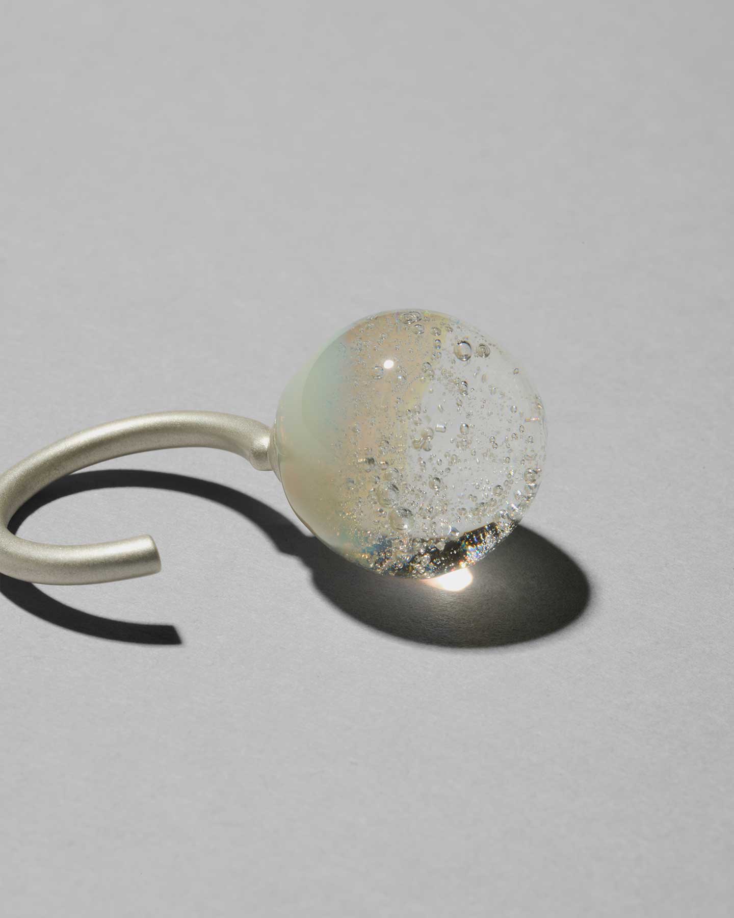 薄雲に包まれた太陽や月が放つ光の輪「ハロー」から着想。透明なガラスに泡を閉じ込め、一部にクリーム色のガラスを重ねることで、スノードームのような繊細な世界を表現したリング。優しく上品な手元を演出します。