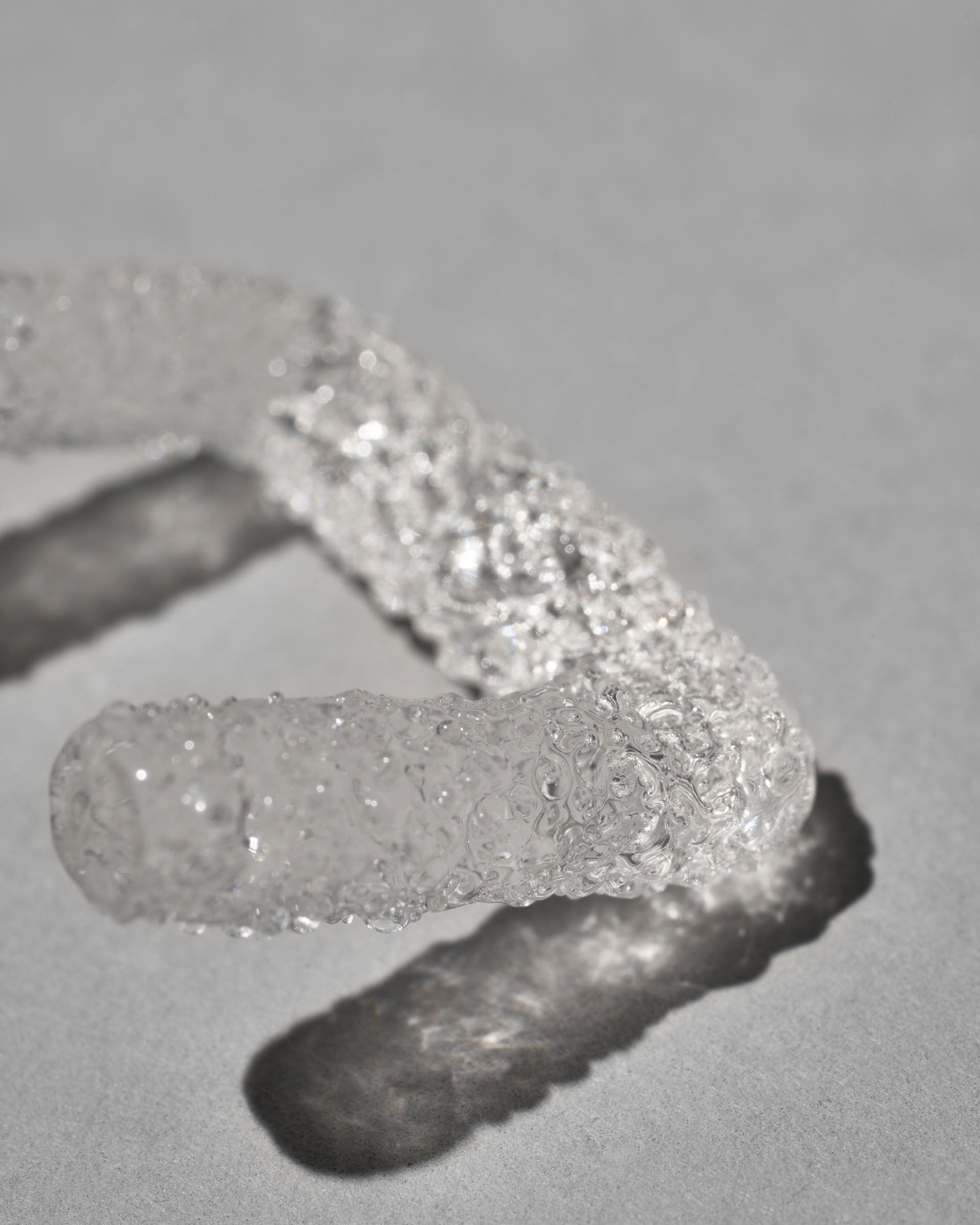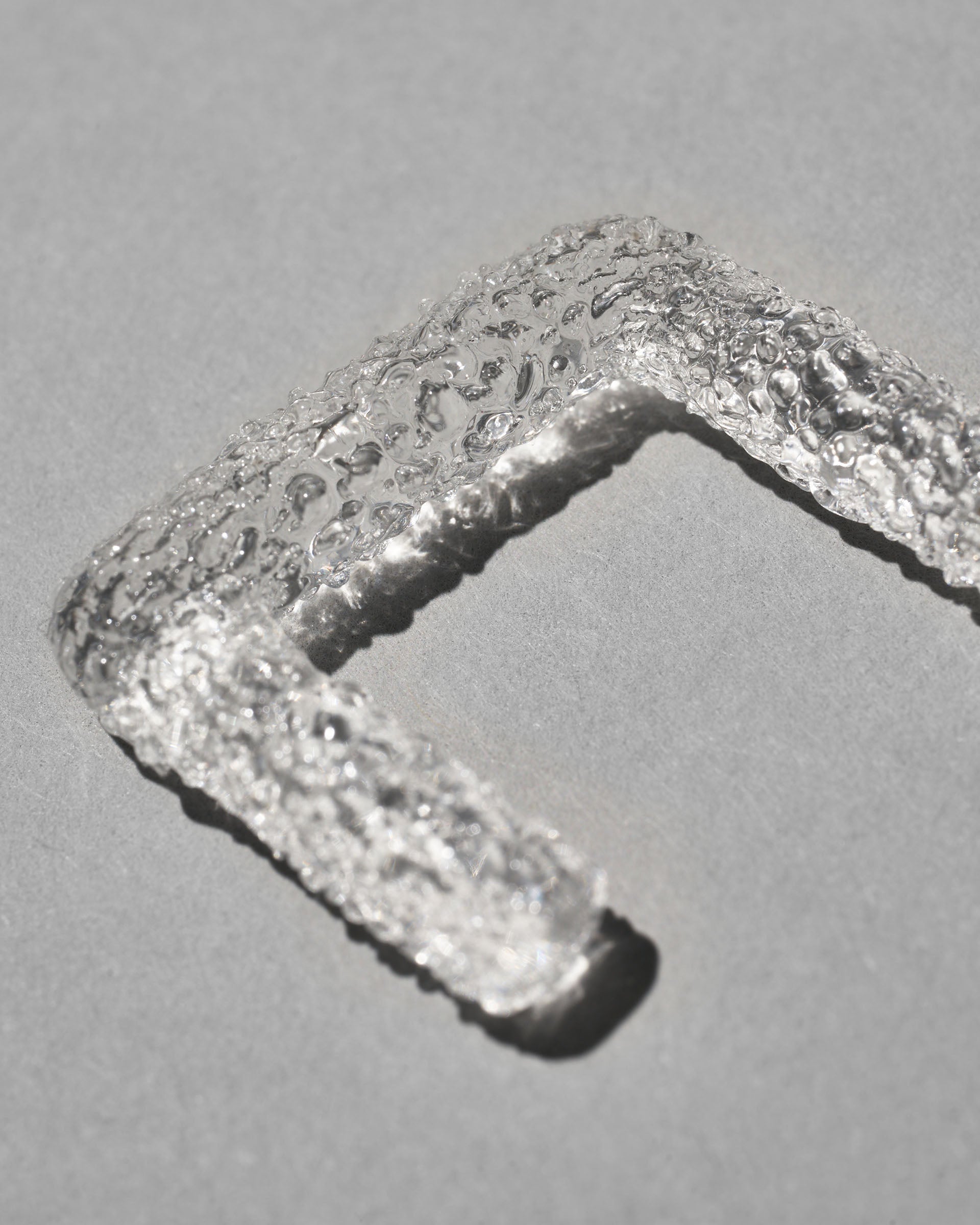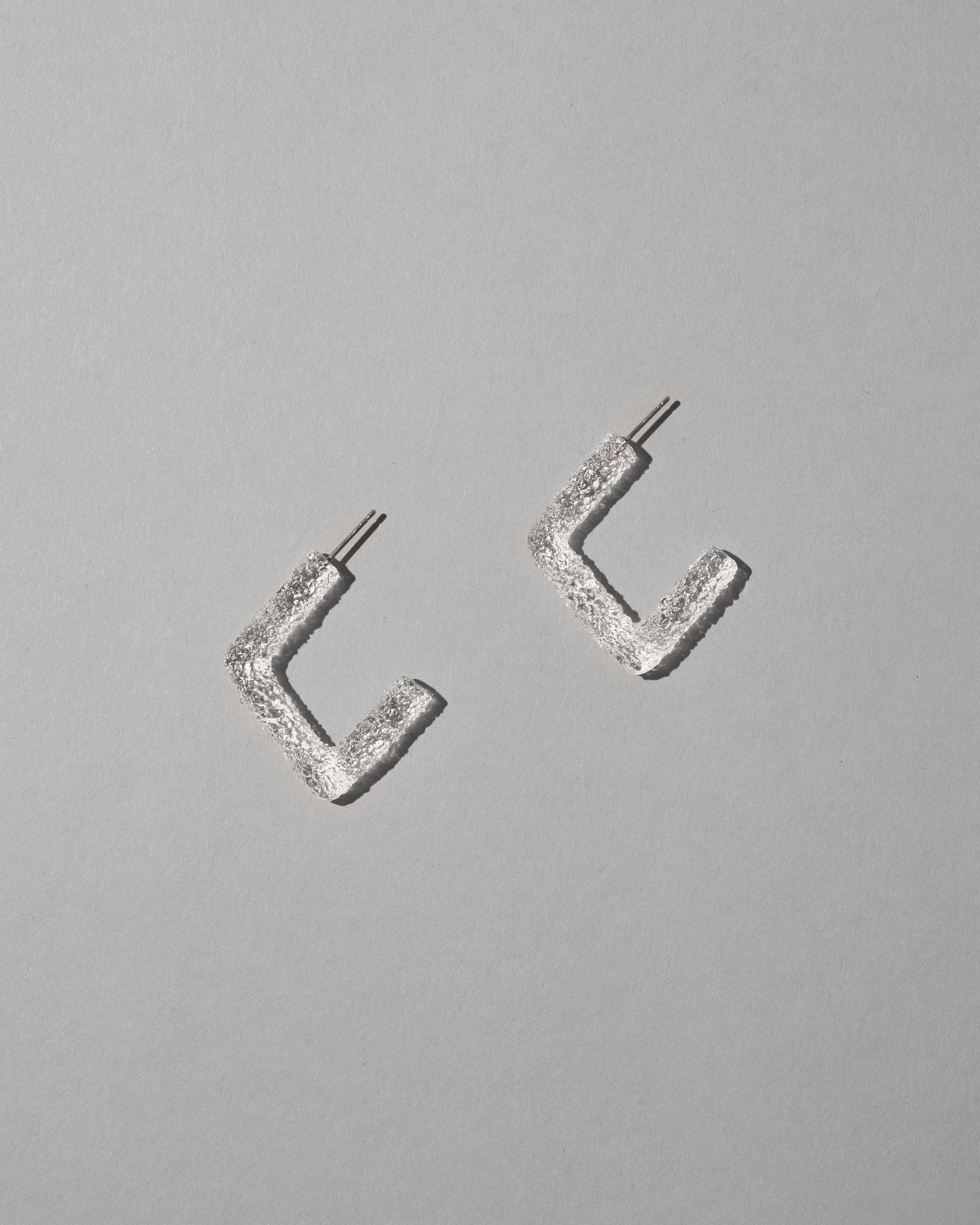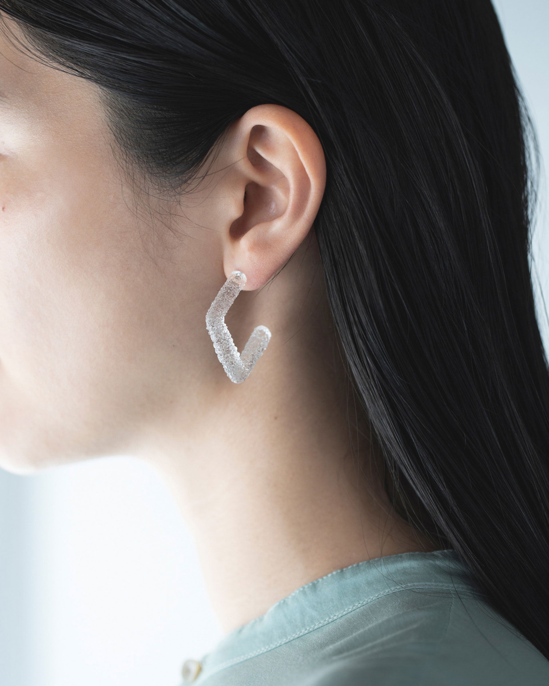 The “HOTOLI” collection draws inspiration from the image of The Aare River in Swizerland trapped in glass. The “Earrings Konoji Flake” feature a rough glass texture, which is an expression of the splashing water on the edge of the river. Designed to be an everyday statement jewelry, these diamond-shaped hoop earrings create a sense of feminine geometry to the wearer’s profile from the side.
