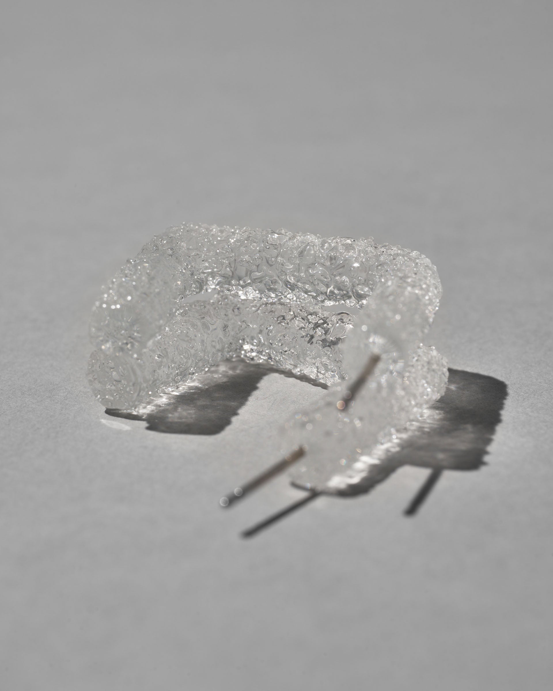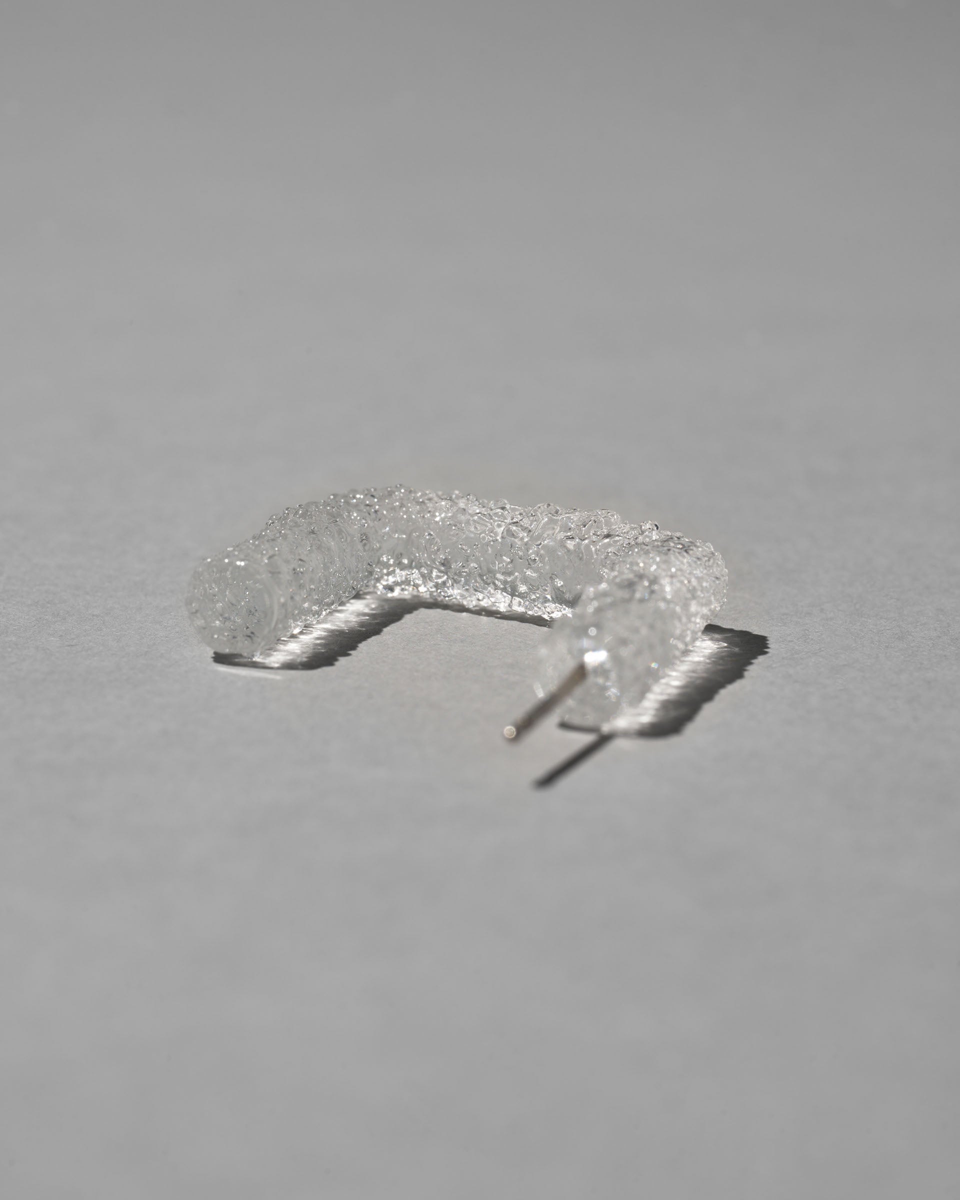 「Earrings Konoji Flake」のざらりとしたテクスチャーは、川の縁に上がる水しぶきを表現しています。