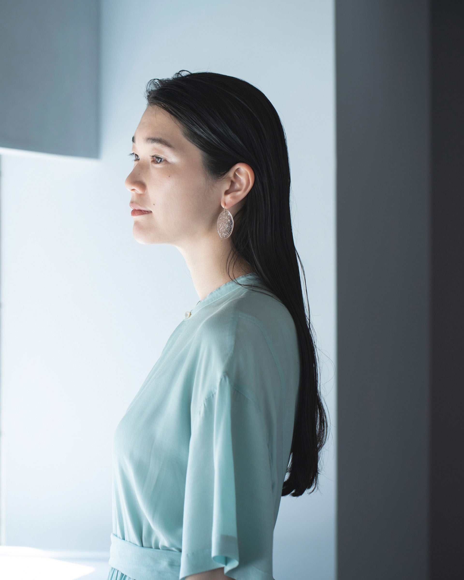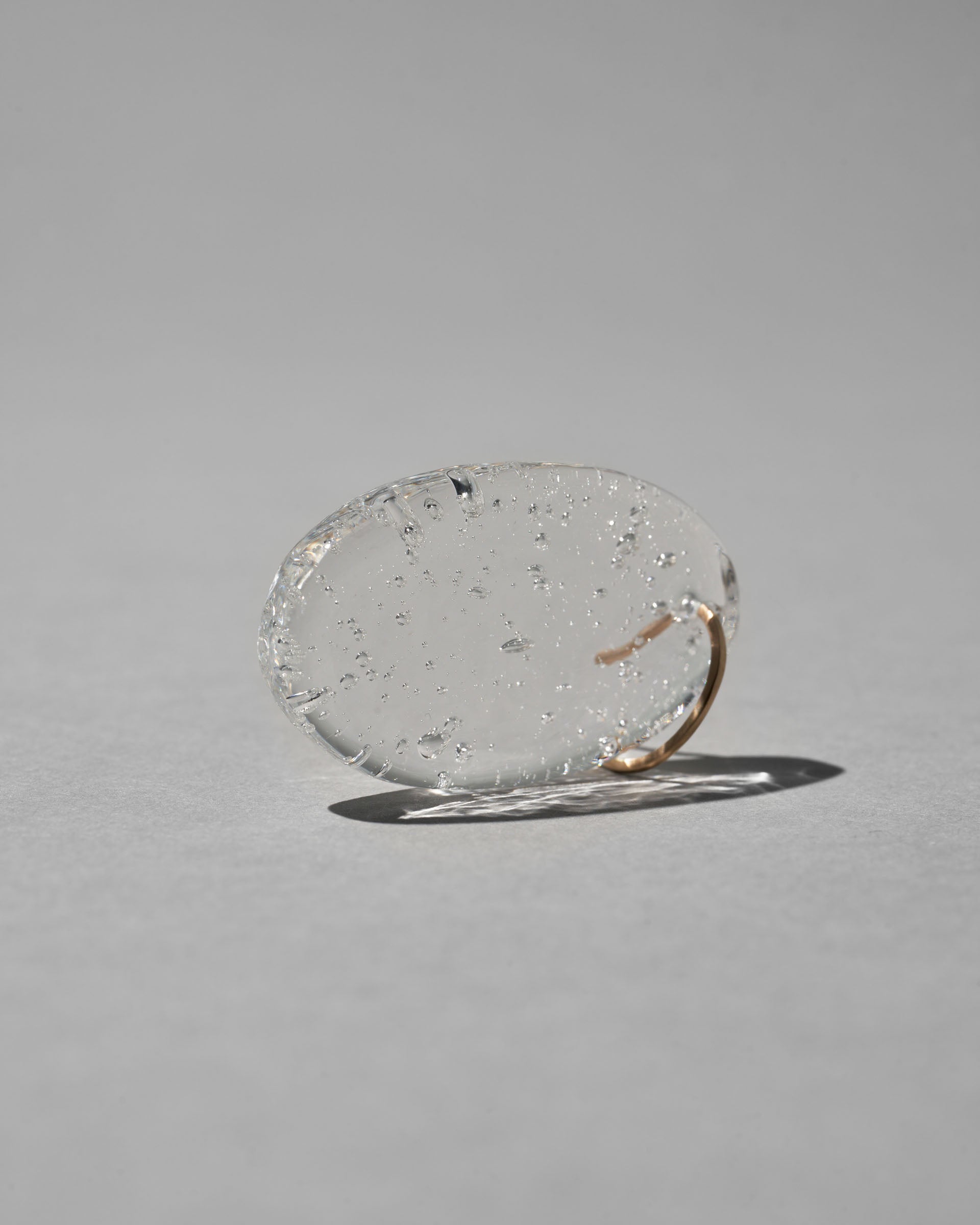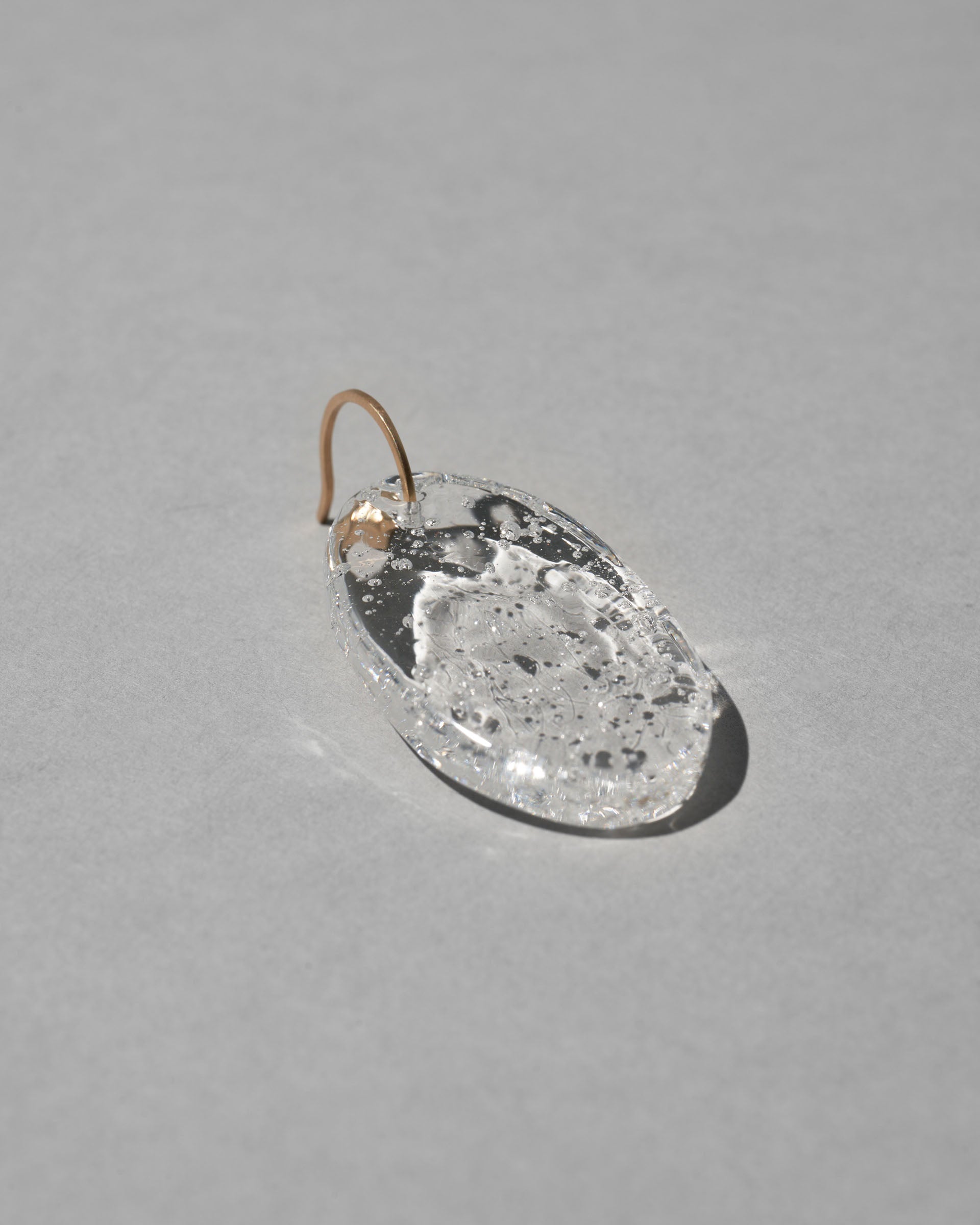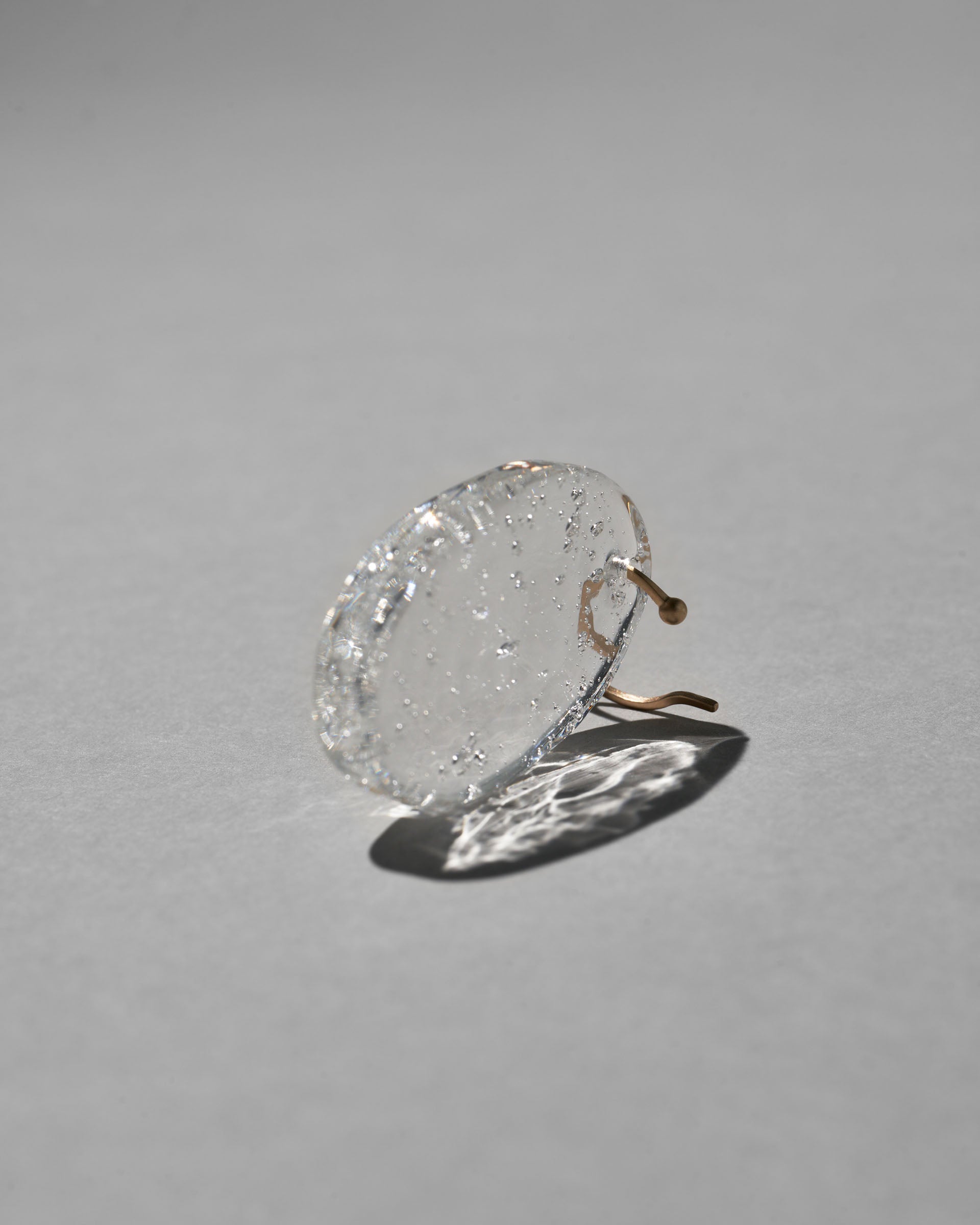 The “HOTOLI” collection draws inspiration from the image of The Aare River in Swizerland trapped in glass. The “Earrings Oval Bubble” feature a rare lampwork technique of beautiful curved glass pieces with bubbles, reminiscent of the river shining in the summer sun scooped up by the hands. The elegant gold matte finish blends gently with the skin, giving a light impression even with the large size.