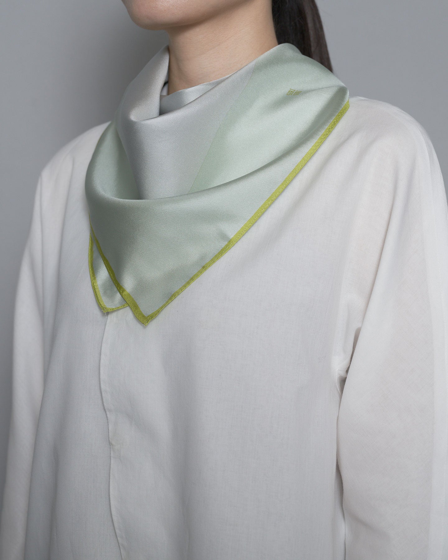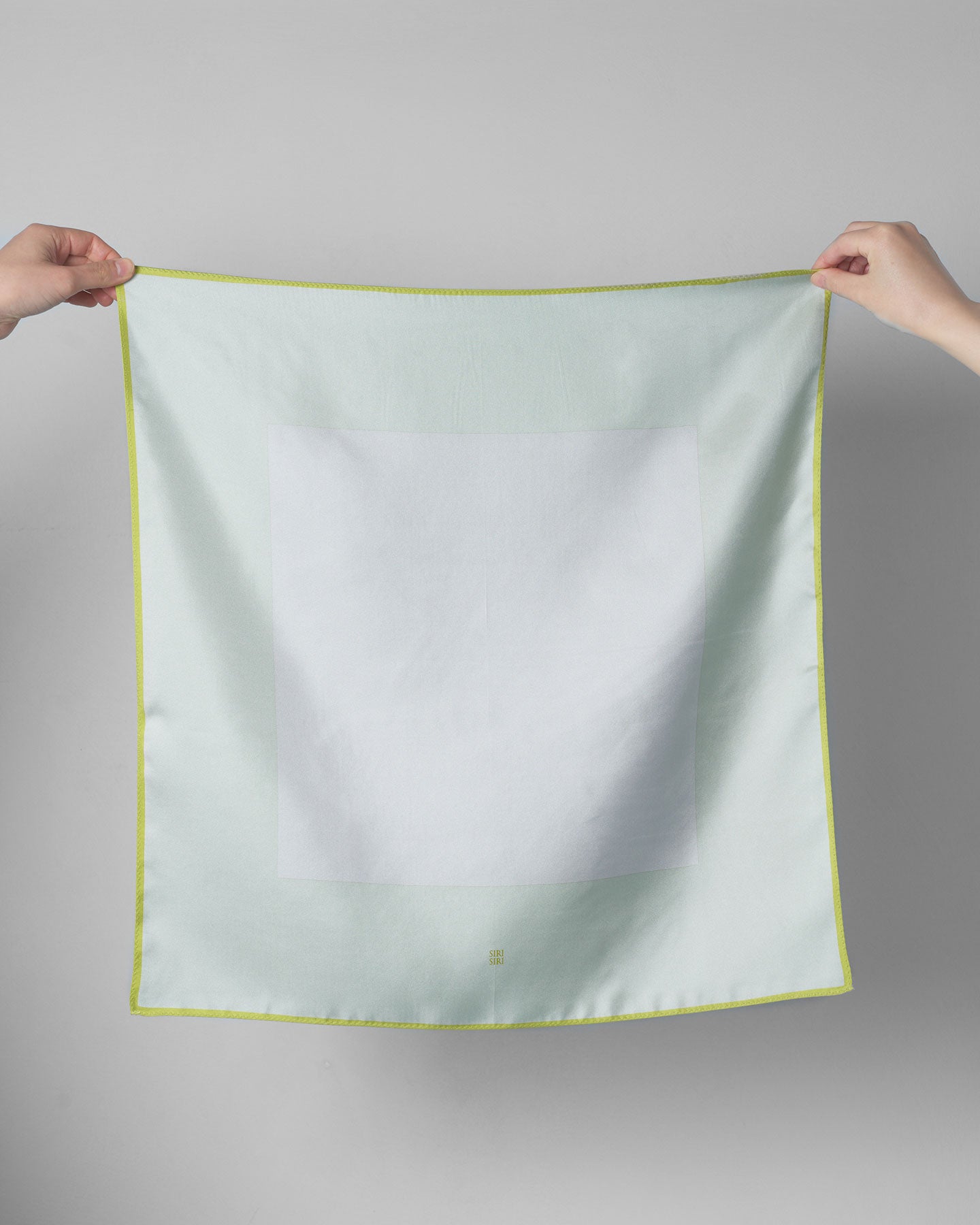 「BEACH」はアーレ川の白い川石の色から着想し、アイボリーとペールグリーンで構成されています。手纏りの縁とさりげなく入ったブランドのロゴがポイントです。100%シルクツイルの生地は艶やかでハリがあり、手捺染ならではの美しい色彩を楽しめます。小振りな53×53cmのサイズはシンプルに胸もとで一度結べるサイズ。ポケットチーフとして男性へのギフトにもおすすめです。