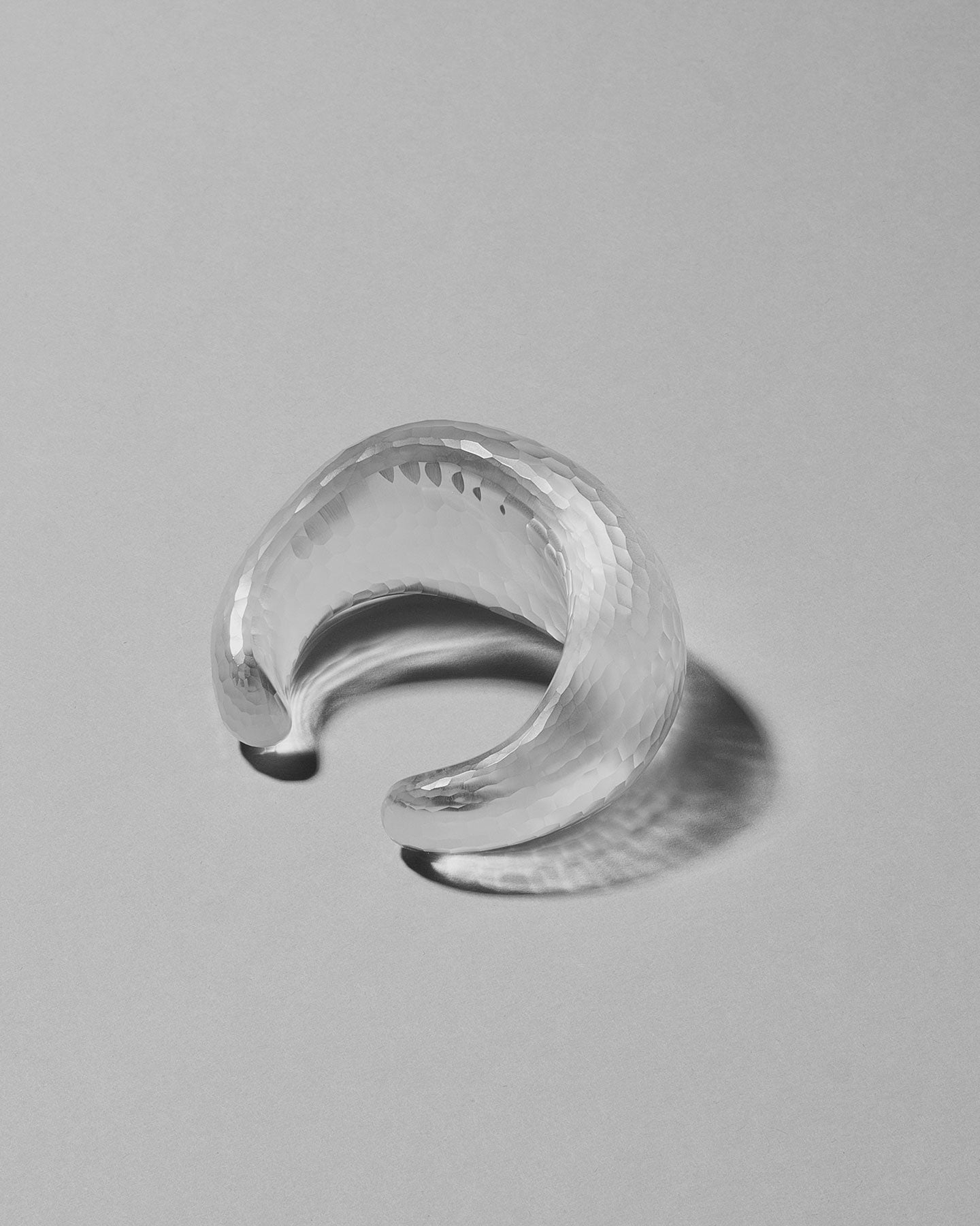 槌目模様のカッティングを施したボリュームのあるバングルは、ブランド創設時に生まれたSIRI SIRIのシグネチャーアイテムです。