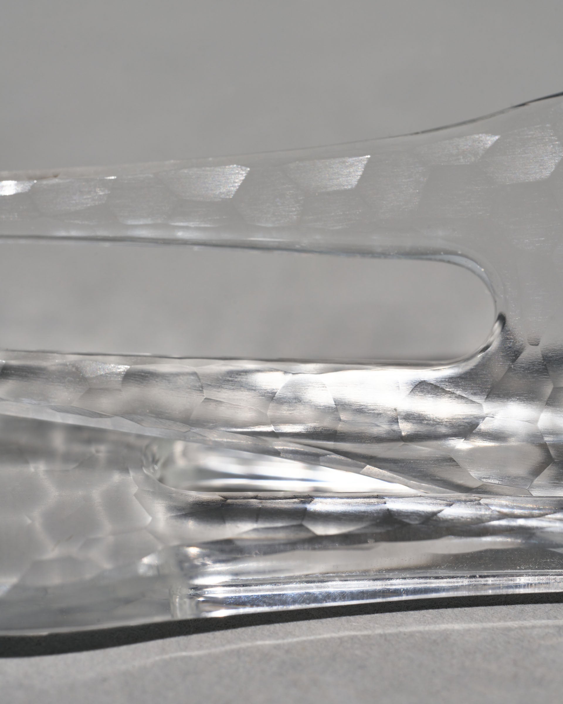 耐熱の板ガラスをカットした土台からバーナーワークの技術を用い、さらに槌目模様のカッティングを施しています。