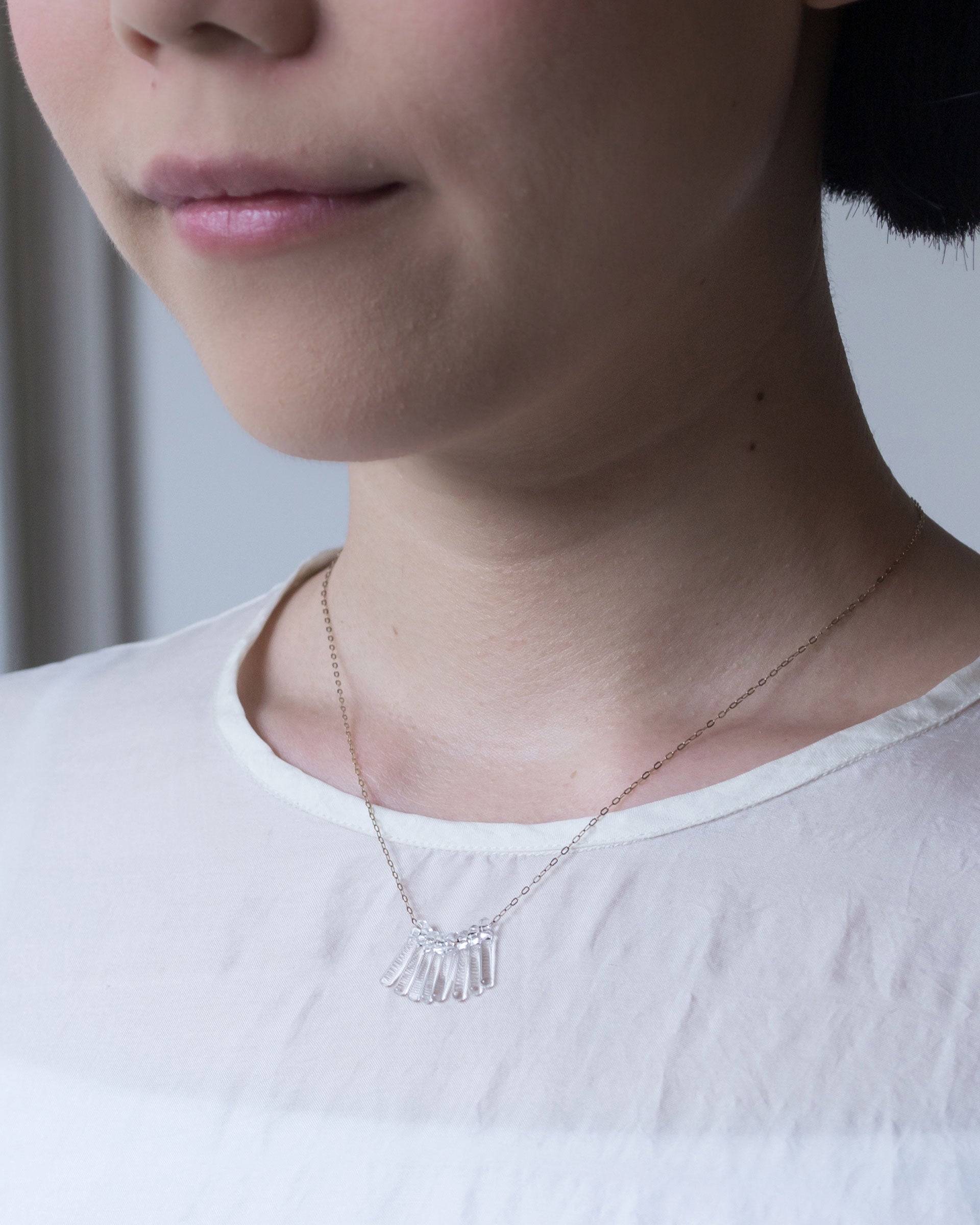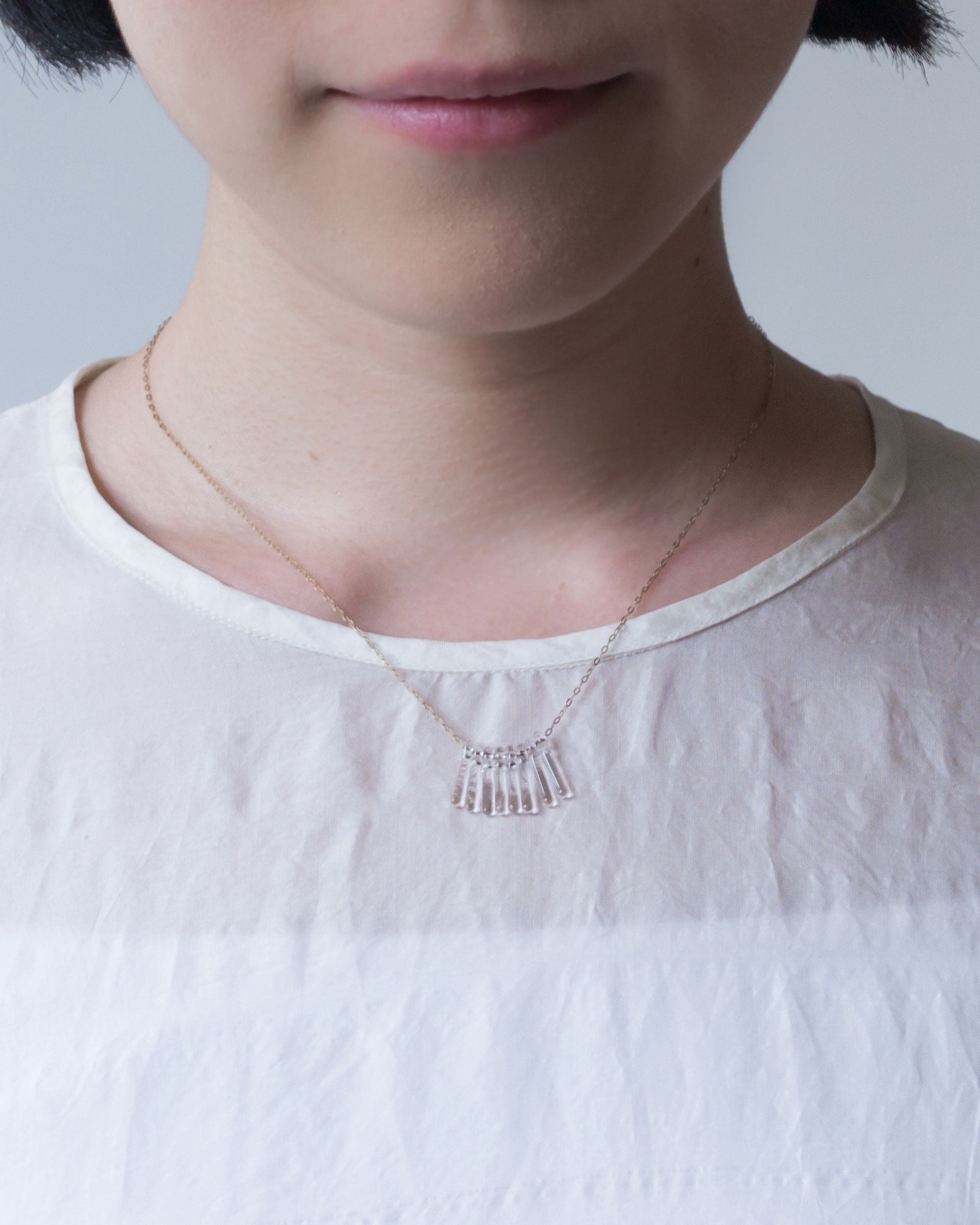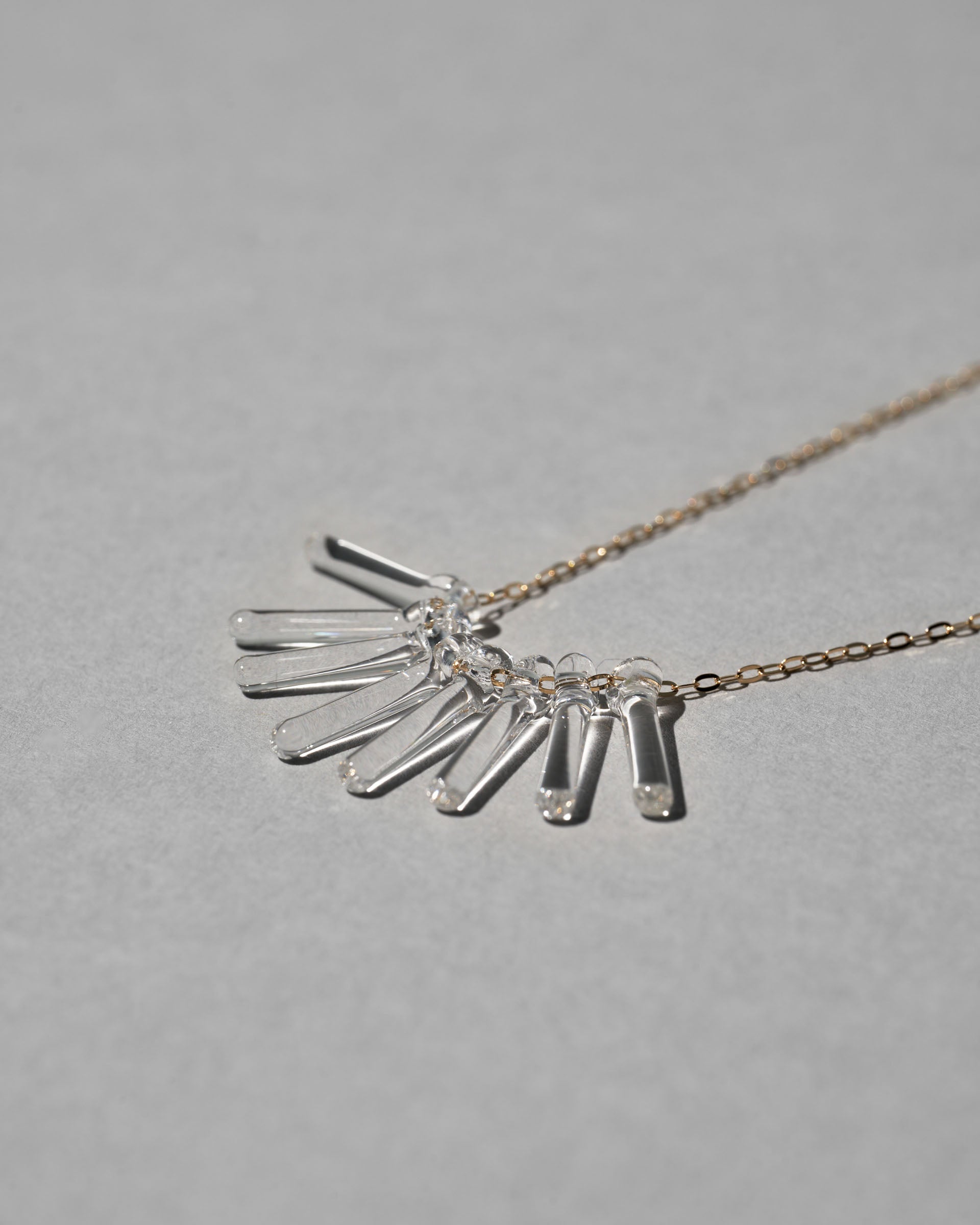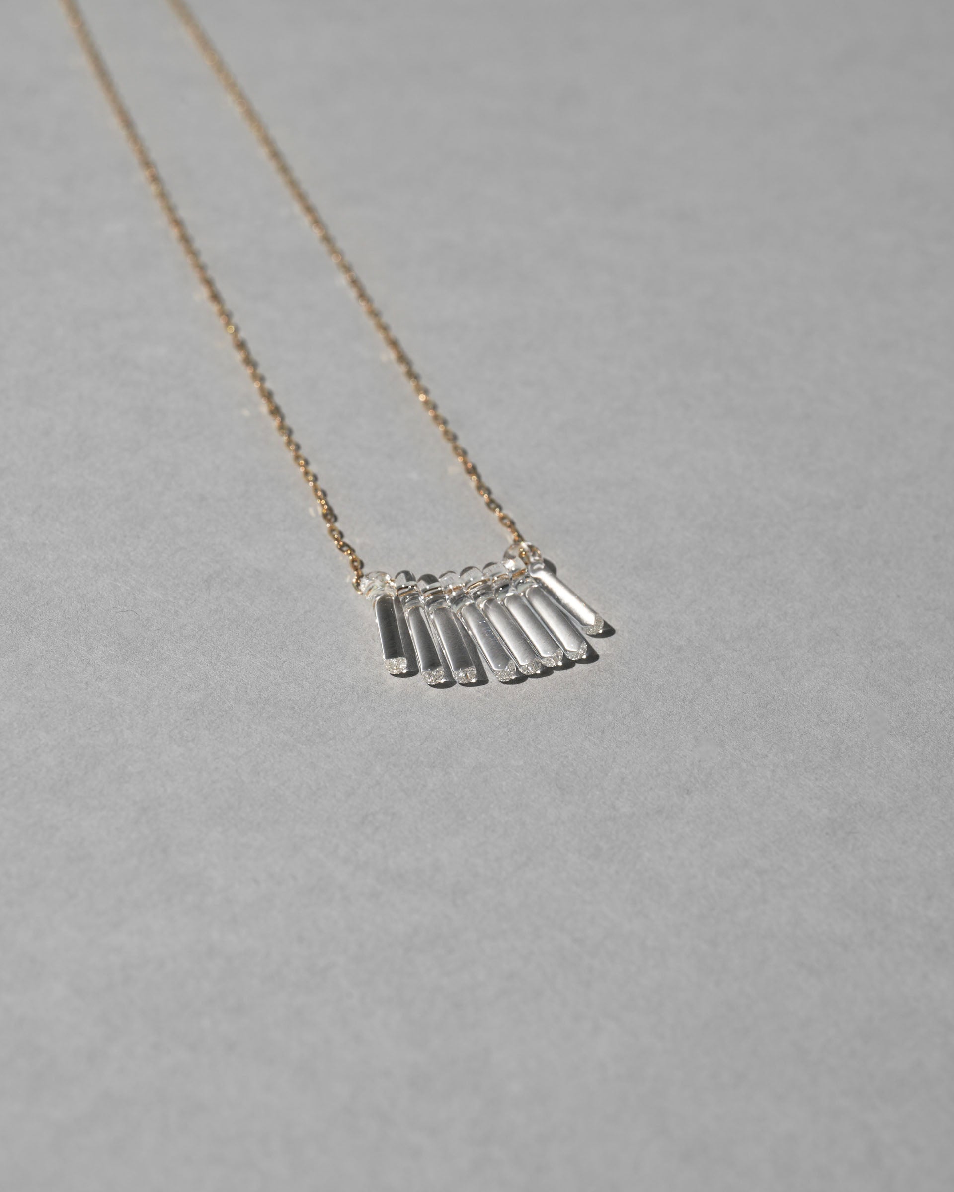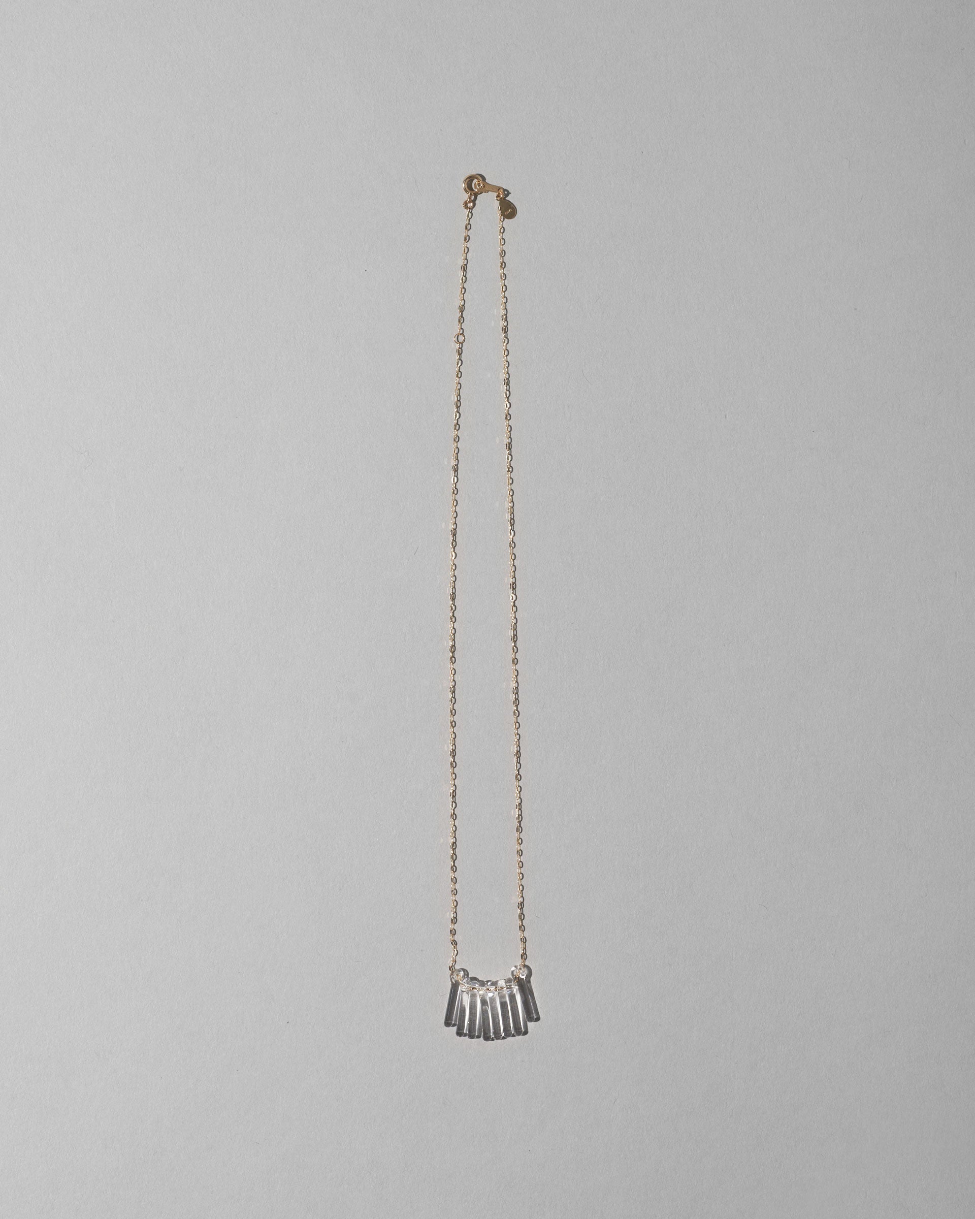 アールデコを思わせるデザインがノスタルジックで女性らしい印象を与えるガラスのフリンジネックレス。