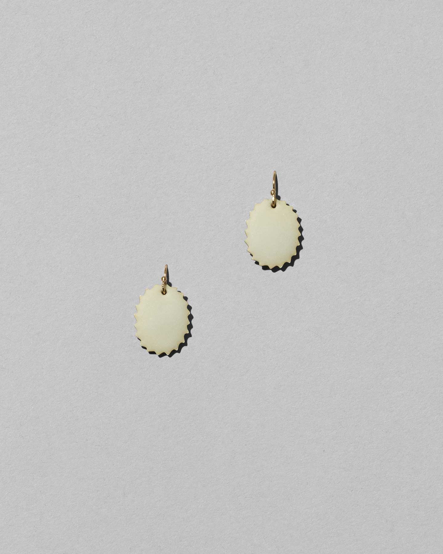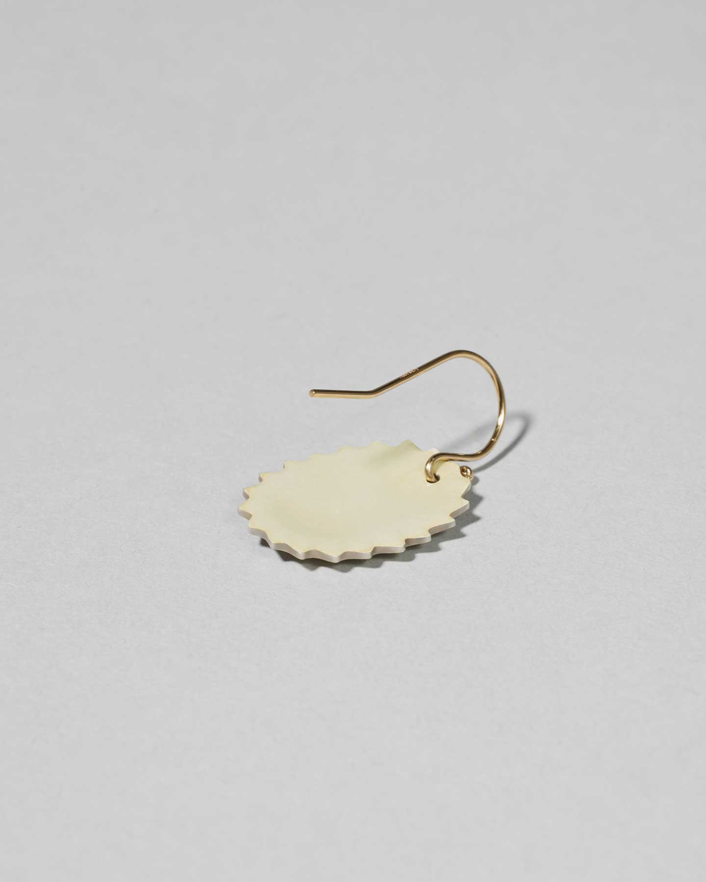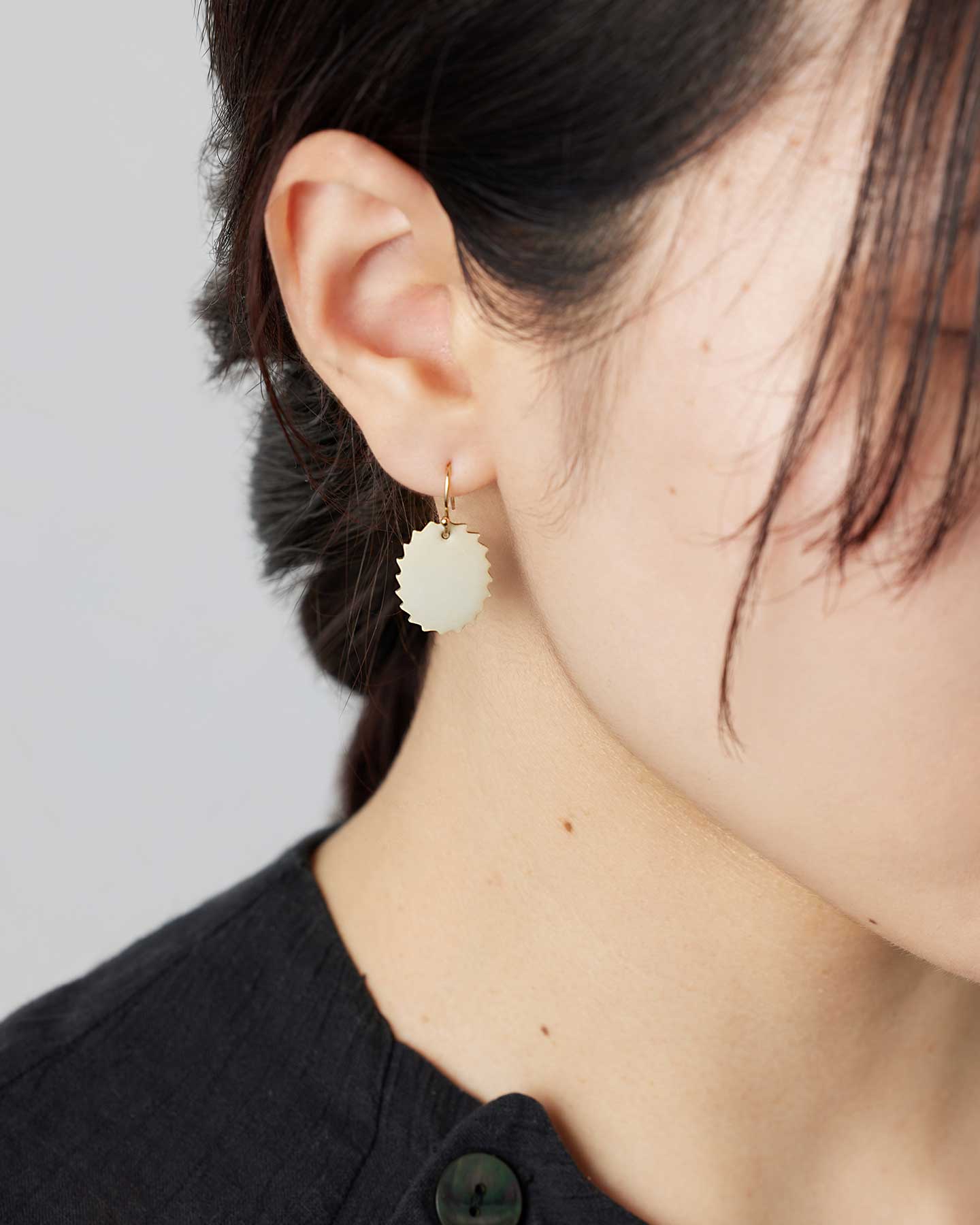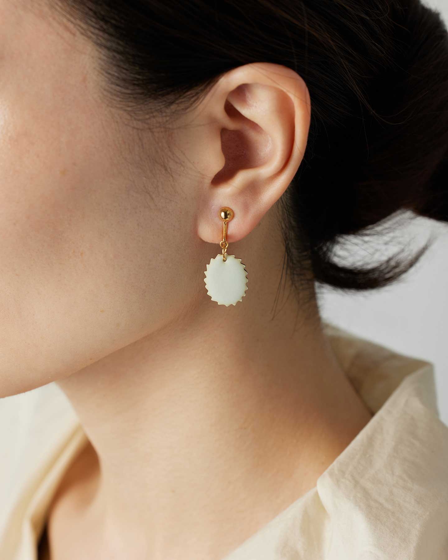 Whiteは奥行きを感じる優しいオフホワイト。七宝では珍しいマット仕上げを表面に施し、温かみを感じる素材感が特徴です。シルバーの縁取りが揺れるたびに煌めき、エスプリのきいたデザインが装いのアクセントに。