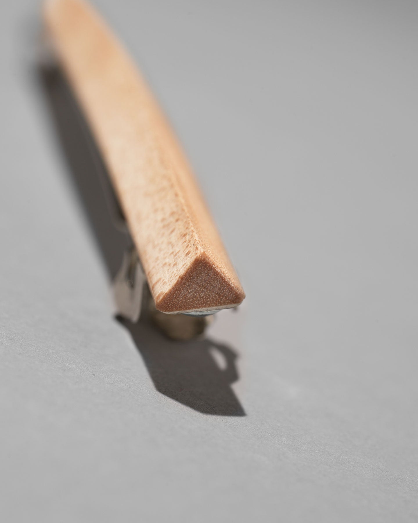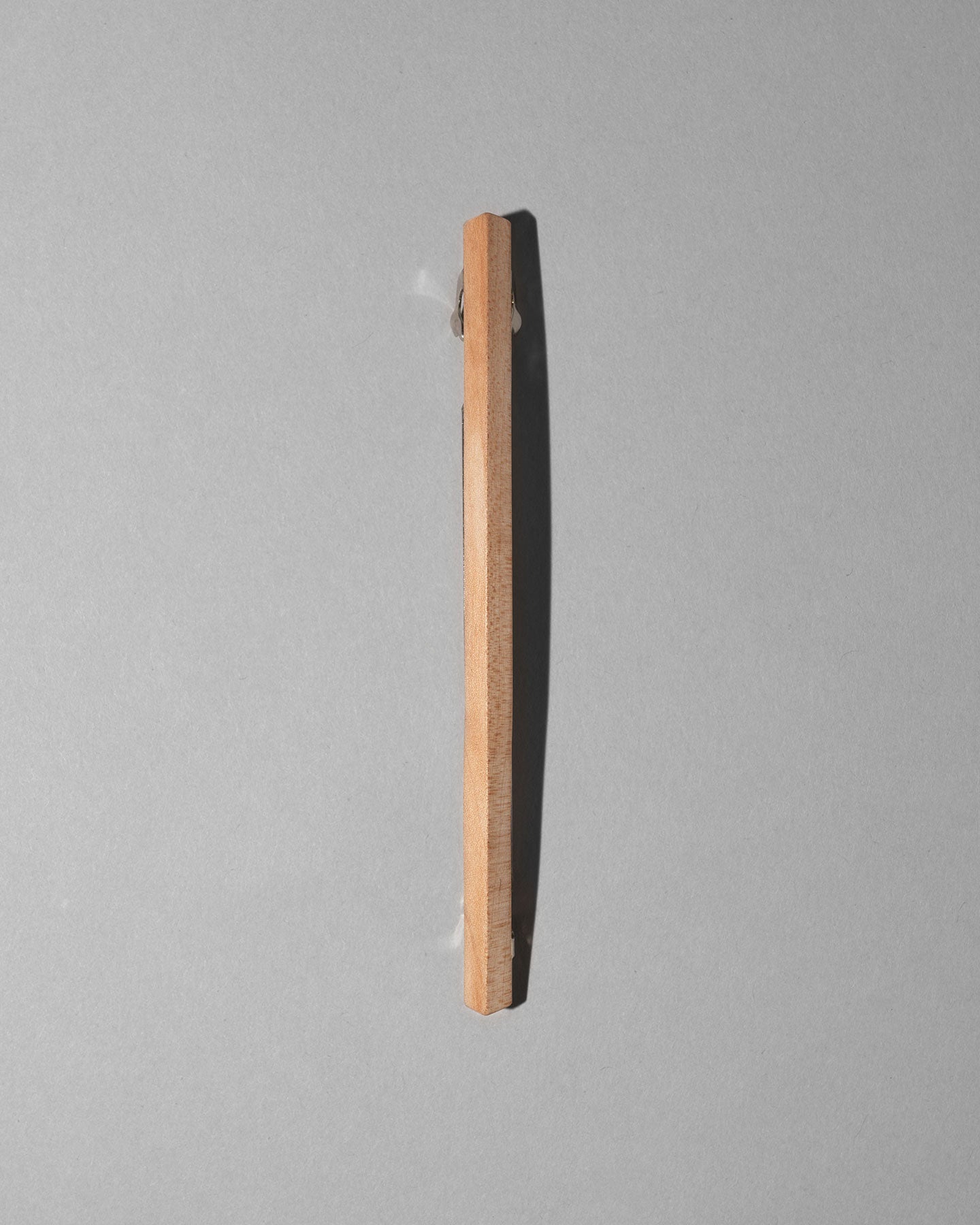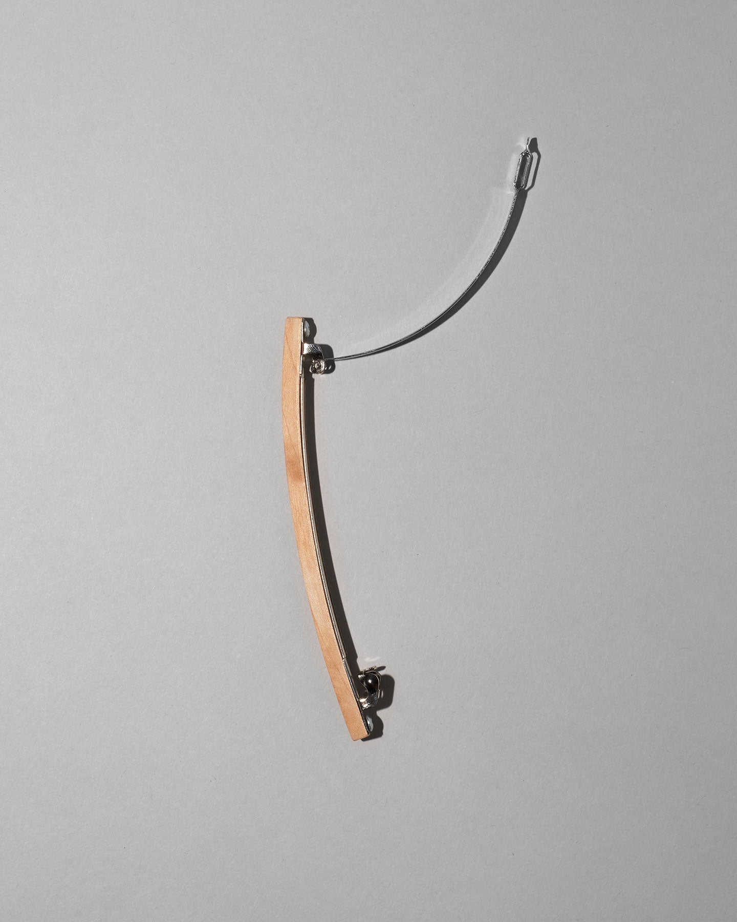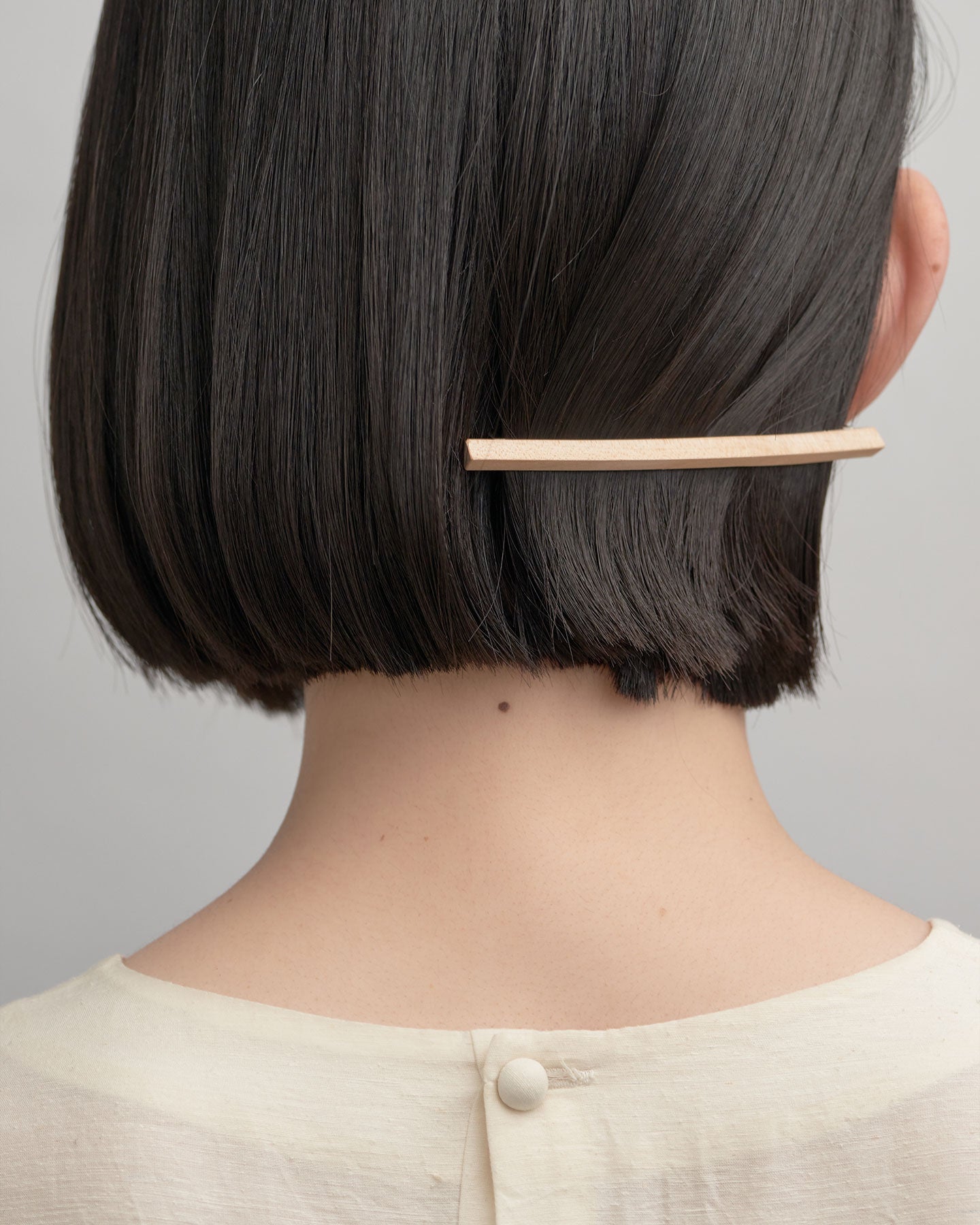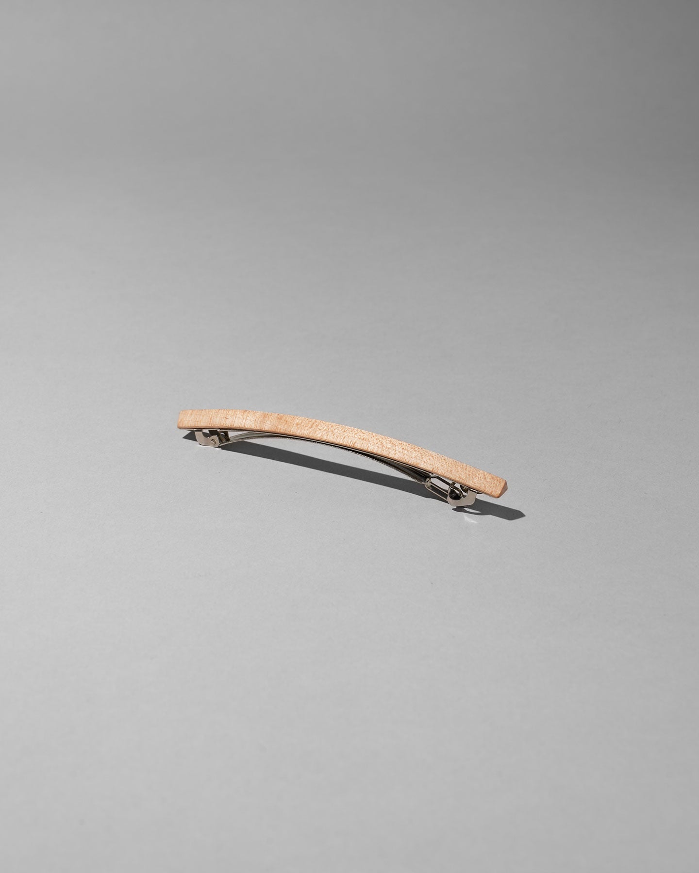 髪をキャンバスに見立て、すっと一本筆で描いたようなイメージのバレッタ。 木がもつ素材の温かみと、無機的なフォルムとライン。対照的な要素を組み合わせたデザインで、全体的にシャープな印象に。頭の形に沿うように曲木の技法によって絶妙なカーブに仕立てています。