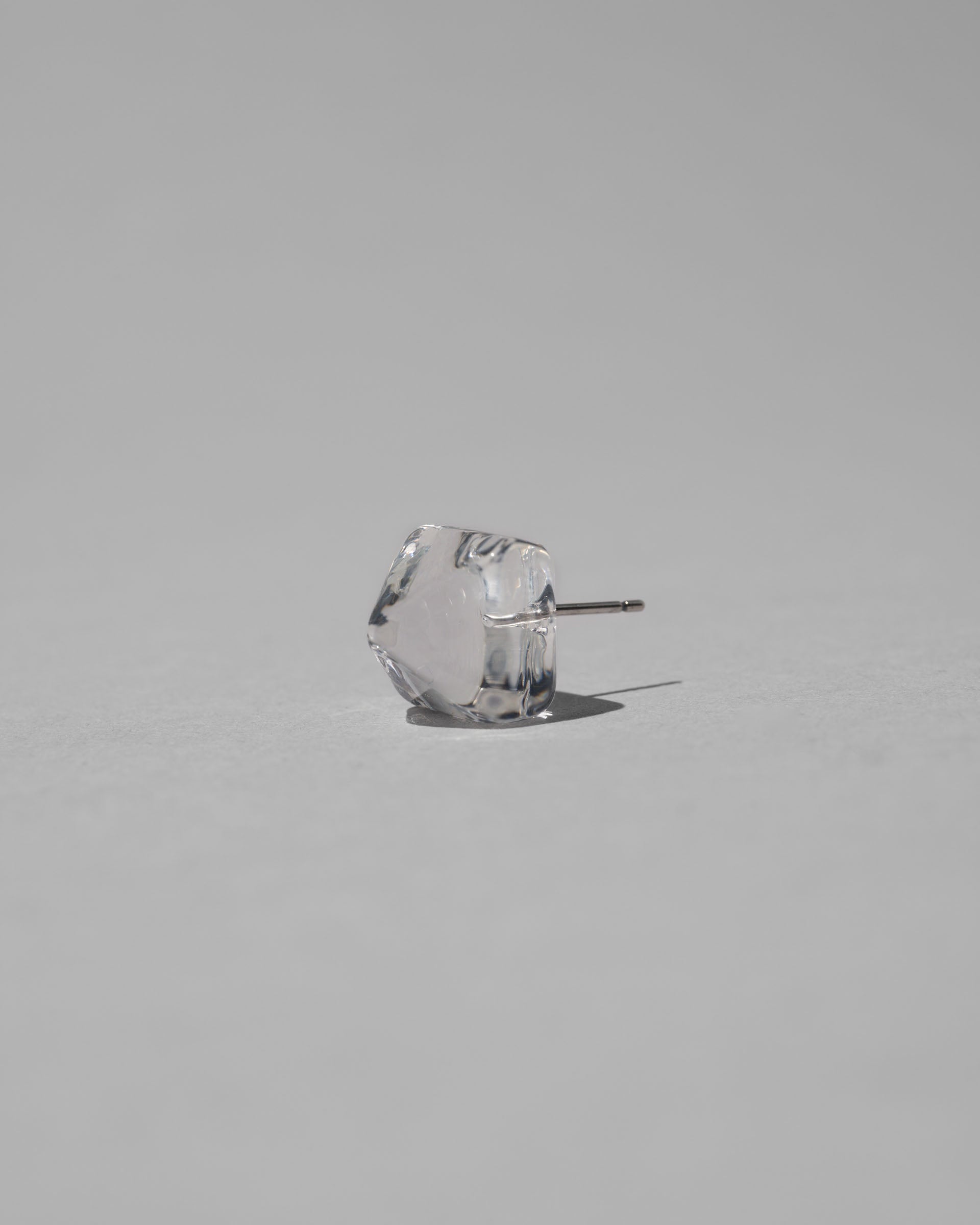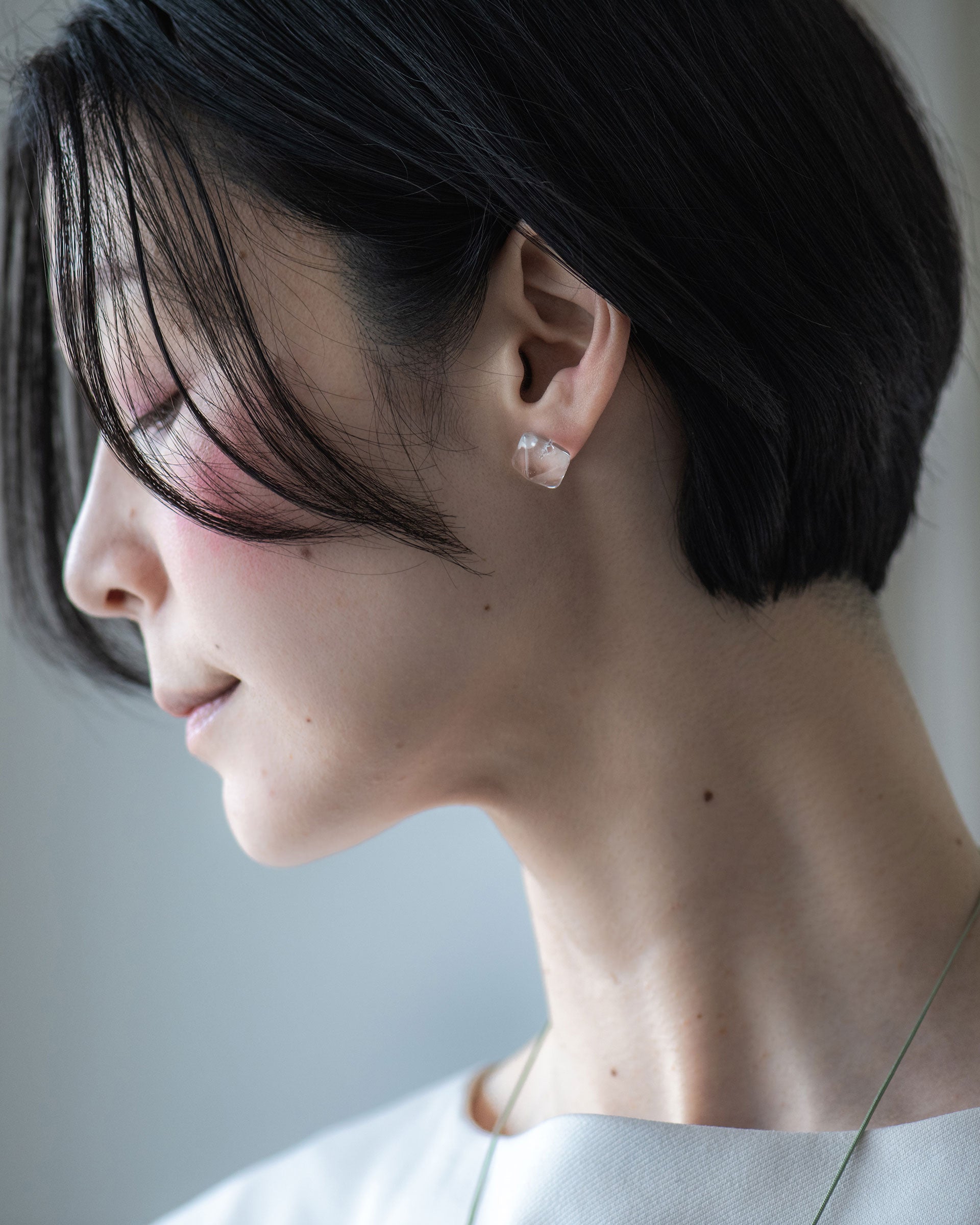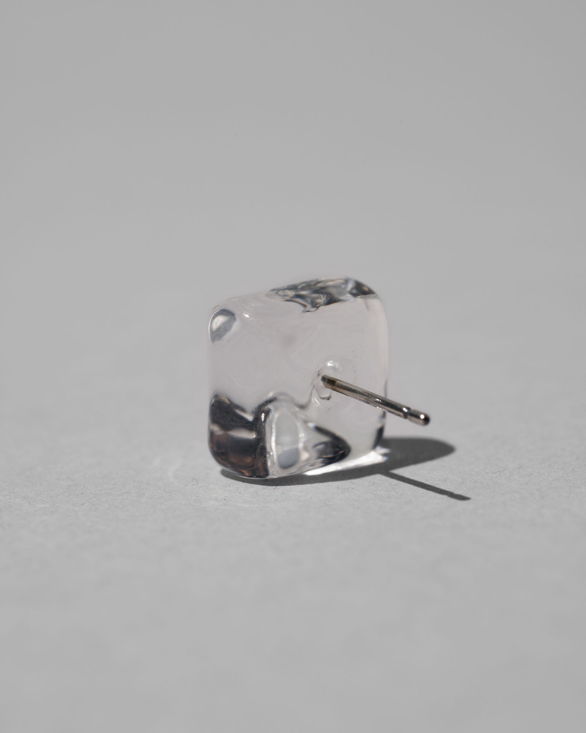ハードなスタッズをガラスで表現したピアス。その氷のような佇まいは、エッジーな硬質さと触れると解けてしまいそうな儚さを感じさせます。