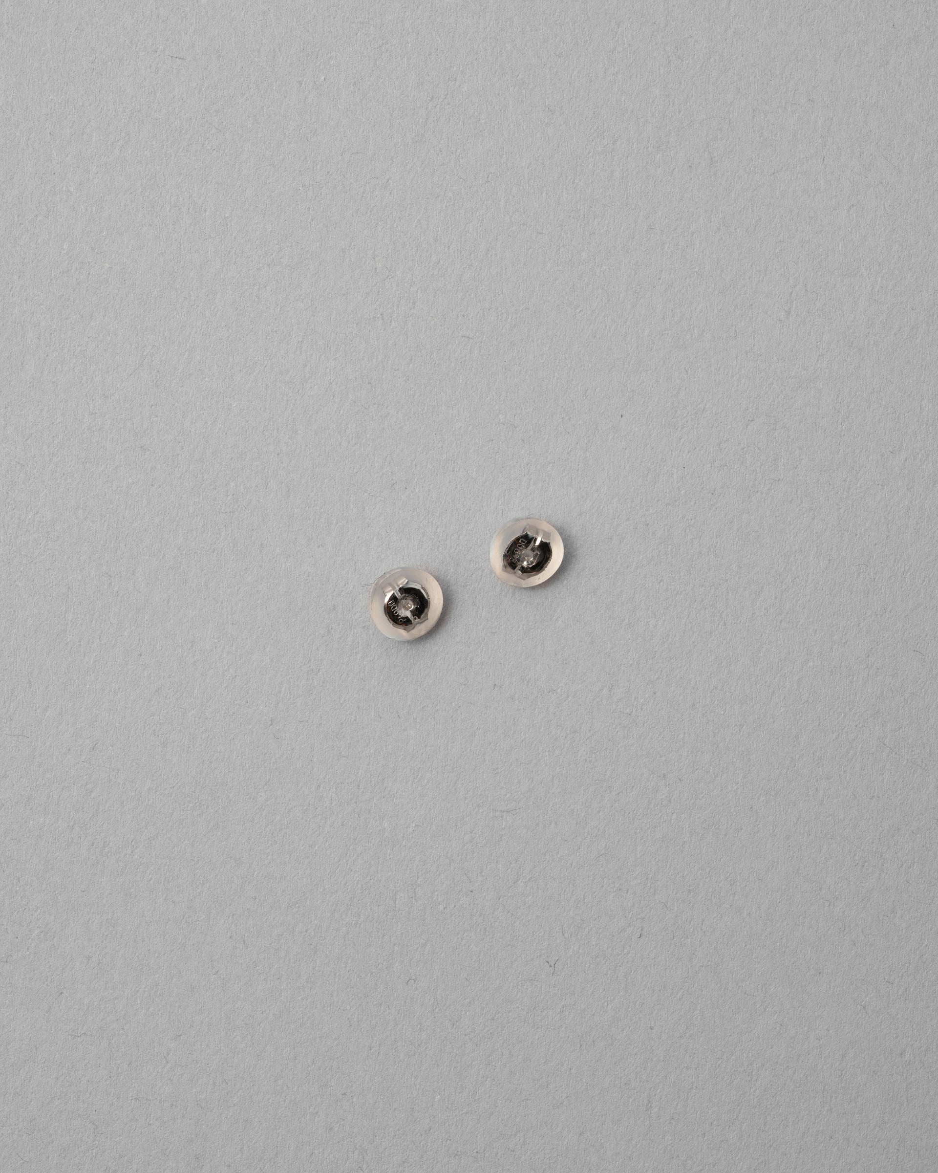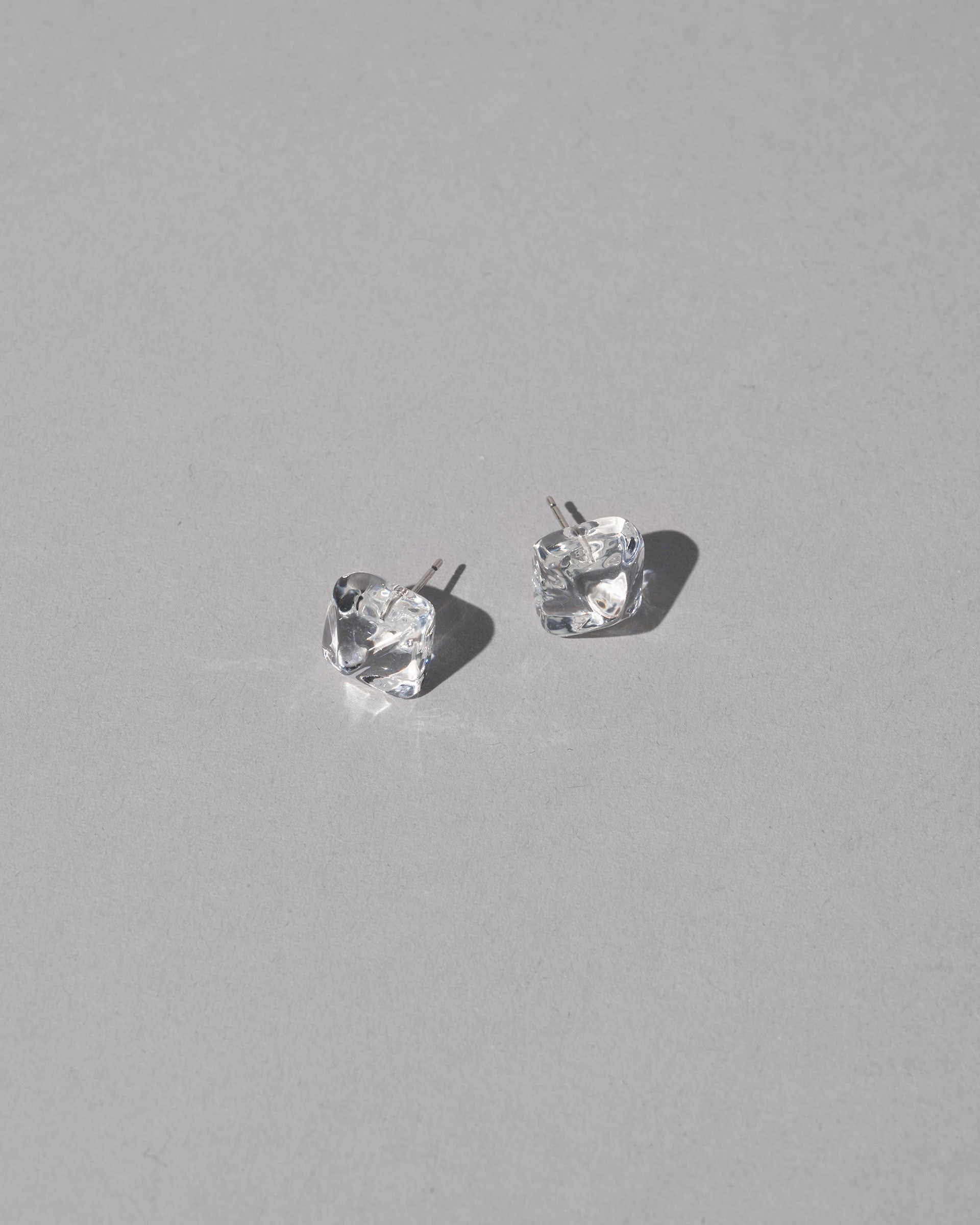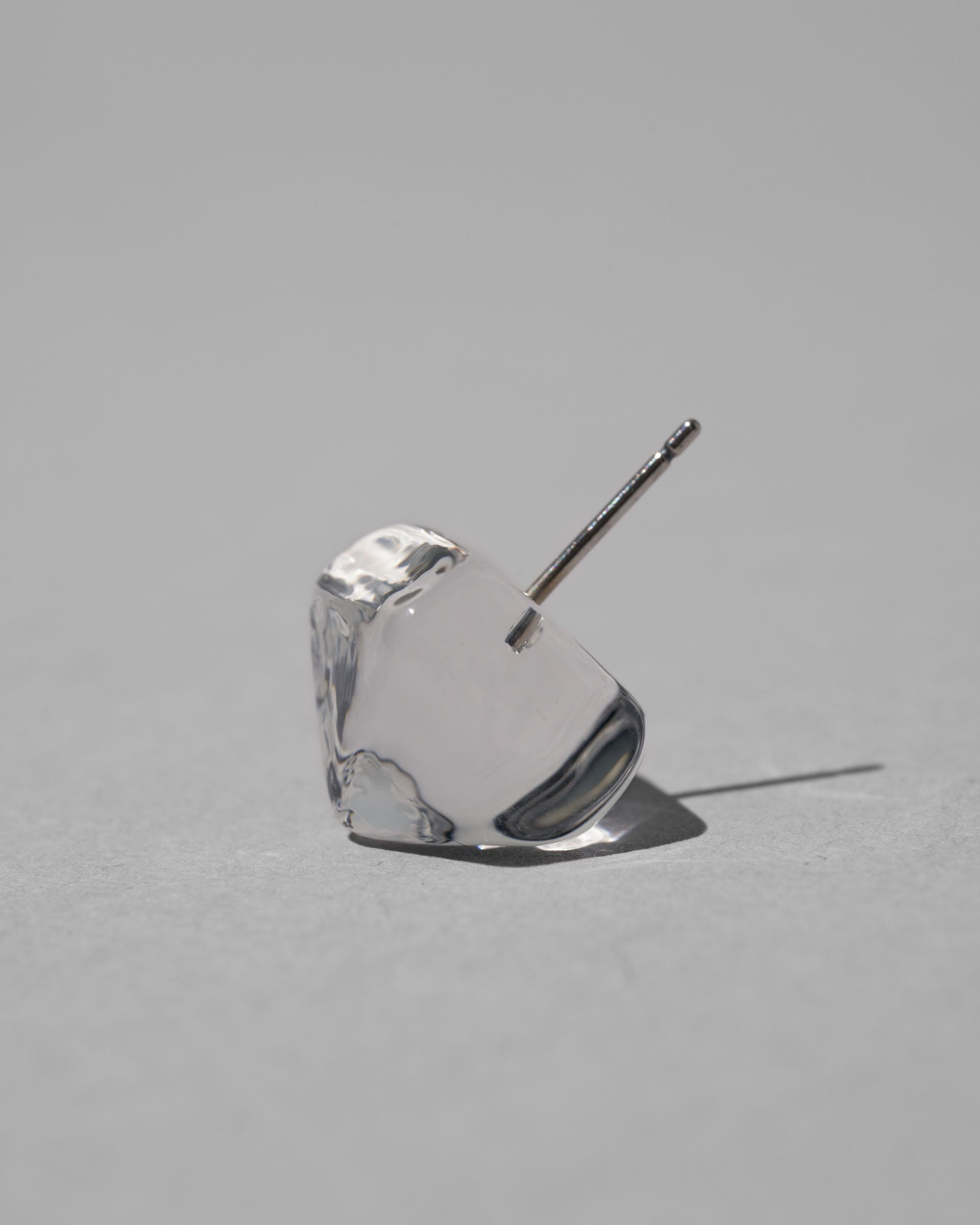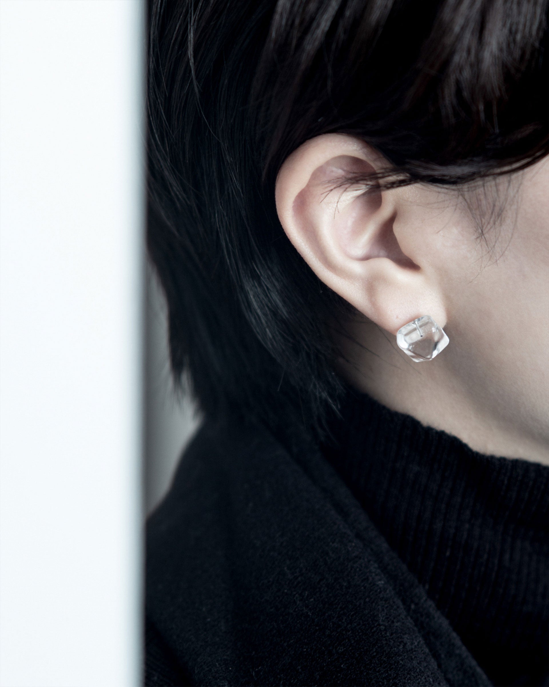 ハードなスタッズをガラスで表現したピアス。その氷のような佇まいは、エッジーな硬質さと触れると解けてしまいそうな儚さを感じさせます。