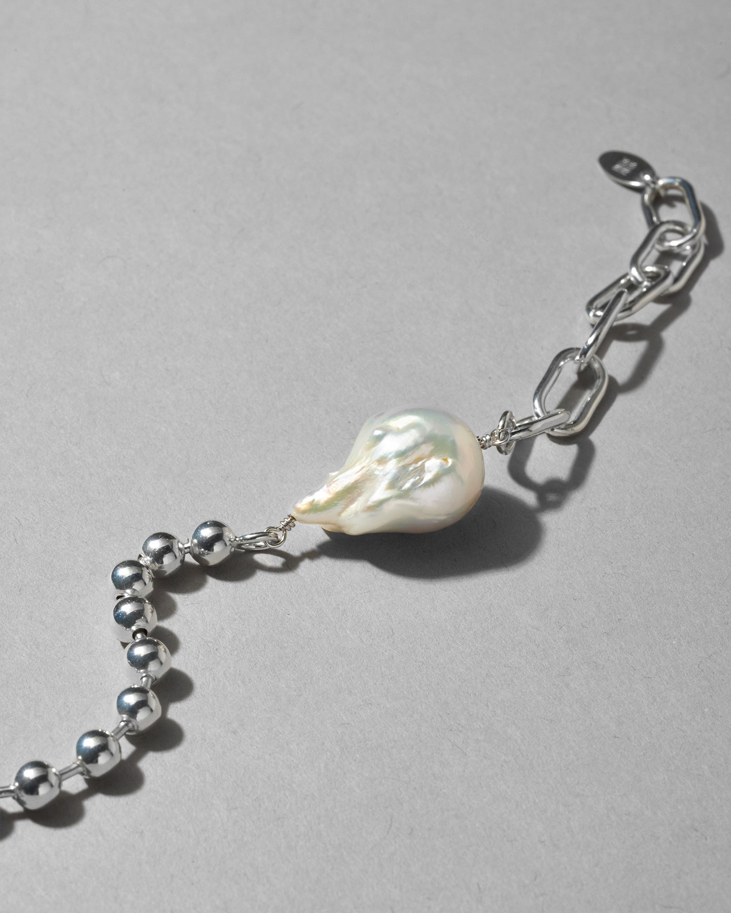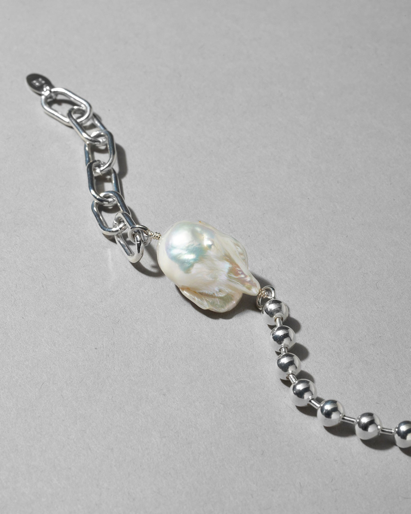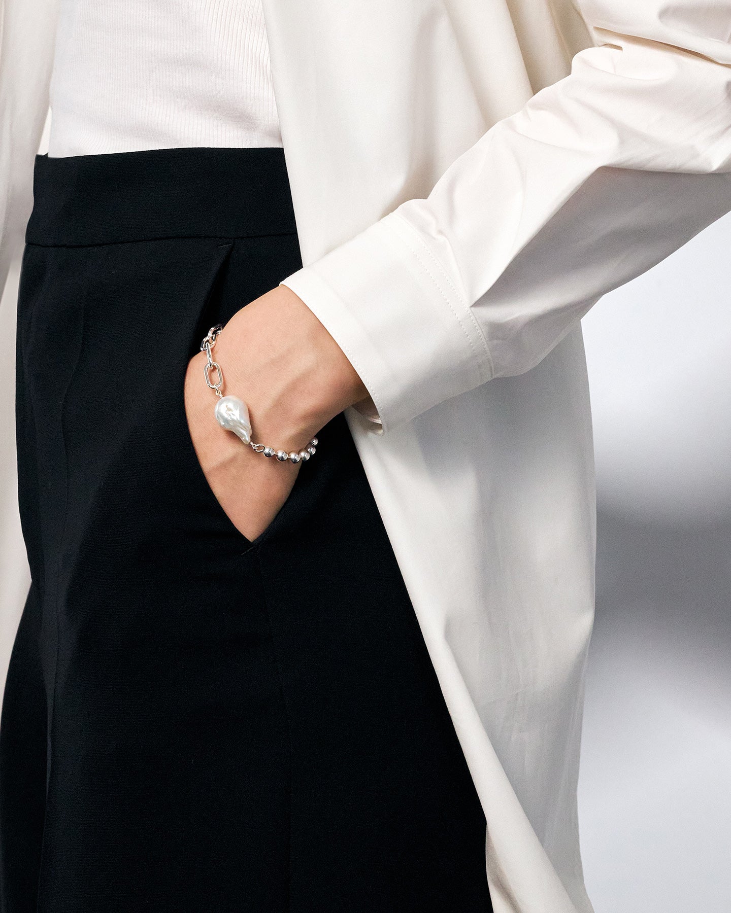 パールの優美な艶とシルバーチェーンの硬質な質感のコントラストが華やかな「ブレスレット ムーア」。大胆なバロックパールのフォルムが風に靡いている姿を想起させます。