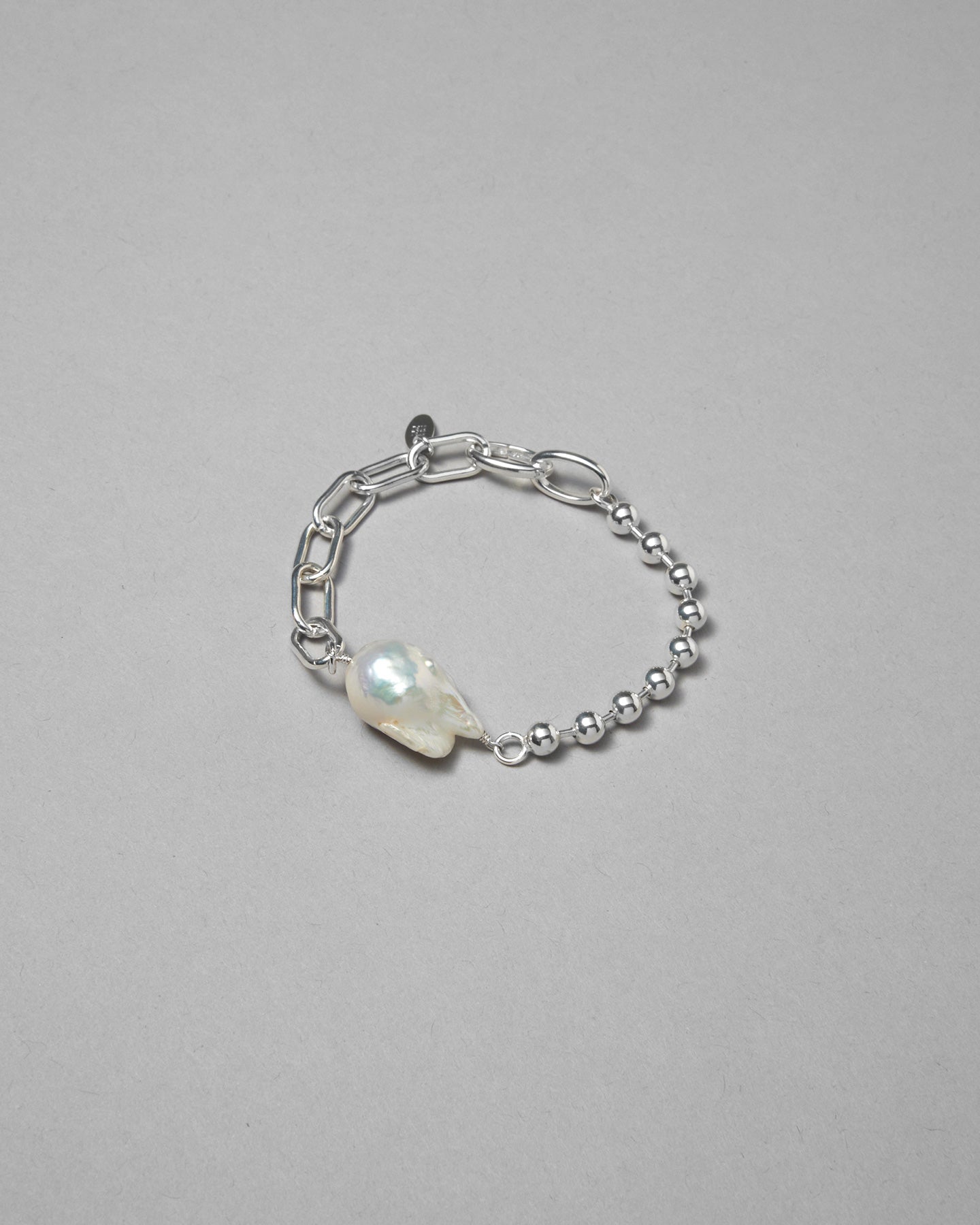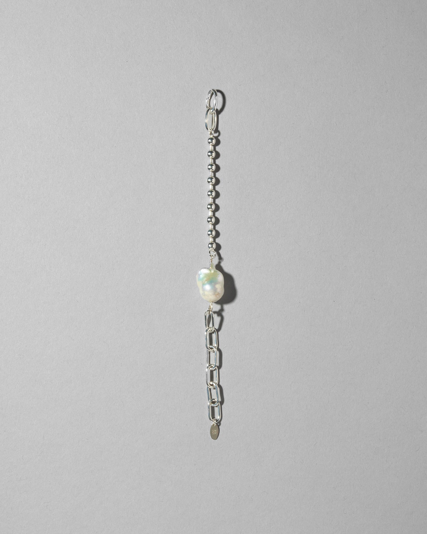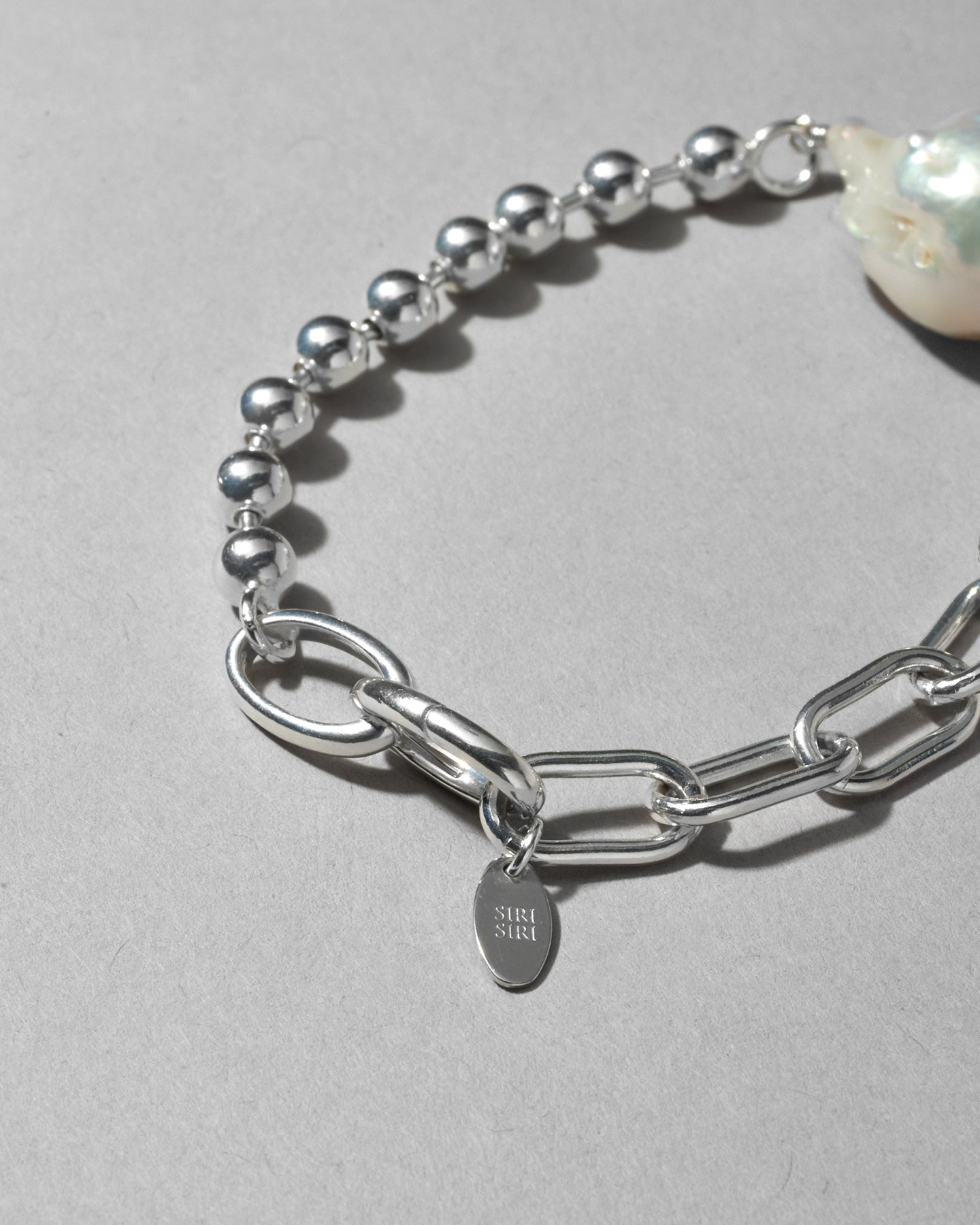 パールの優美な艶とシルバーチェーンの硬質な質感のコントラストが華やかな「ブレスレット ムーア」。大胆なバロックパールのフォルムが風に靡いている姿を想起させます。