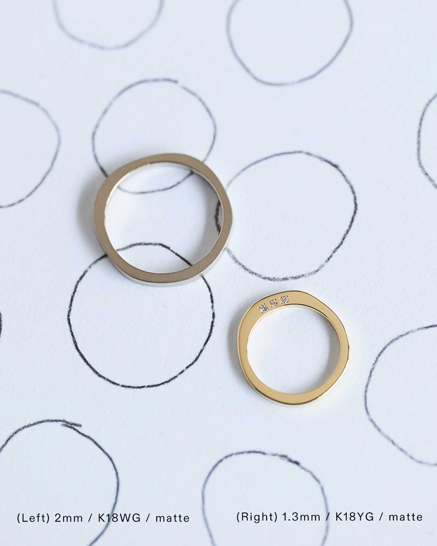 ダイアログとは、掛け合い、セッション、会話を意味し、お二人の生まれ持つもの、作り出したものを交換、共鳴することをコンセプトに作りだされたリングです。お渡しする特製のスケッチブックに、リングのフォルムの原型となる円をお二人に描いていただき、制作過程に参加していただくことで、世界にたった一つのリングをお作りします。この特別なフルオーダーリングは、制作中の思い出もいつも傍に感じられることでしょう。